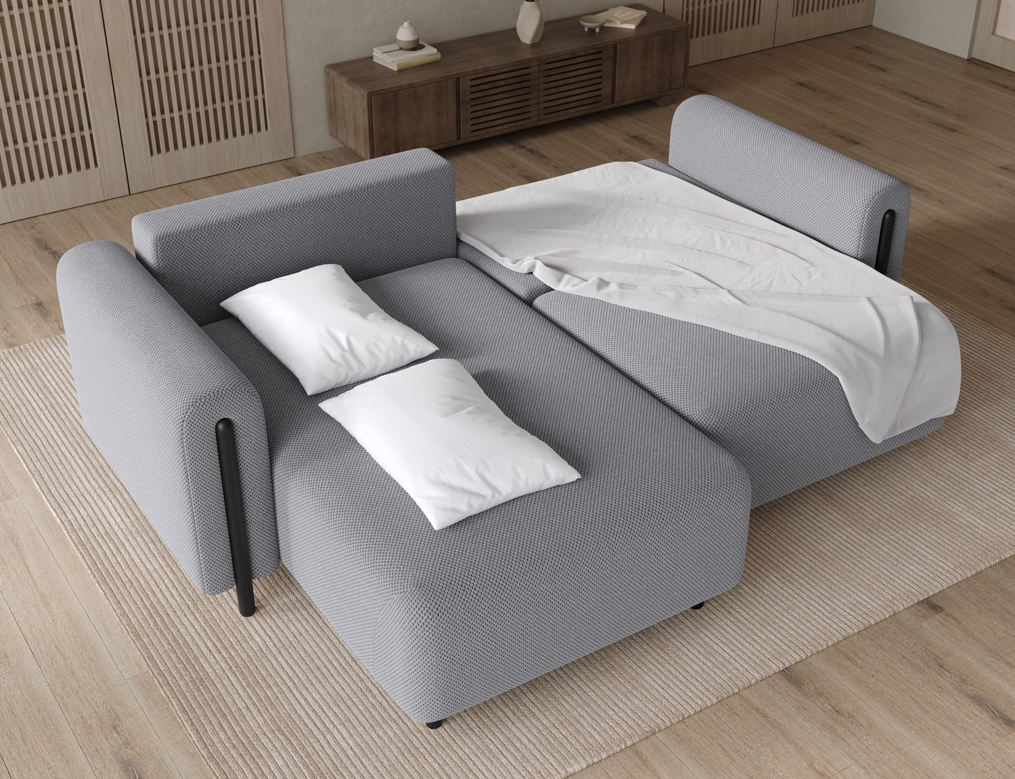 The Acossta corner sofa is a modern and functional upholstered piece designed for everyday comfort and long-lasting durability, making it perfect for both living rooms and relaxation areas. With overall dimensions of 244 × 154 × 95 cm and a weight of 121.7 kg, this model stands out for its solid construction and ergonomically shaped form that ensures a high level of seating and lounging comfort. The seat comfort is provided by a combination of Type B wave springs and HR3030 high-resilience foam, while the backrest filled with T2315 polyurethane foam offers stable and comfortable back support. The Acossta corner sofa features a sleeping function with a surface of 49 × 200 cm, making it a practical solution for occasional overnight guests, and the DL assisted unfolding mechanism with an automatic leg allows for quick and smooth conversion. An additional advantage is the integrated bedding storage compartment, which enhances functionality and provides convenient storage, making the Acossta corner sofa an ideal choice for those seeking a balance of design, comfort, and practical features.