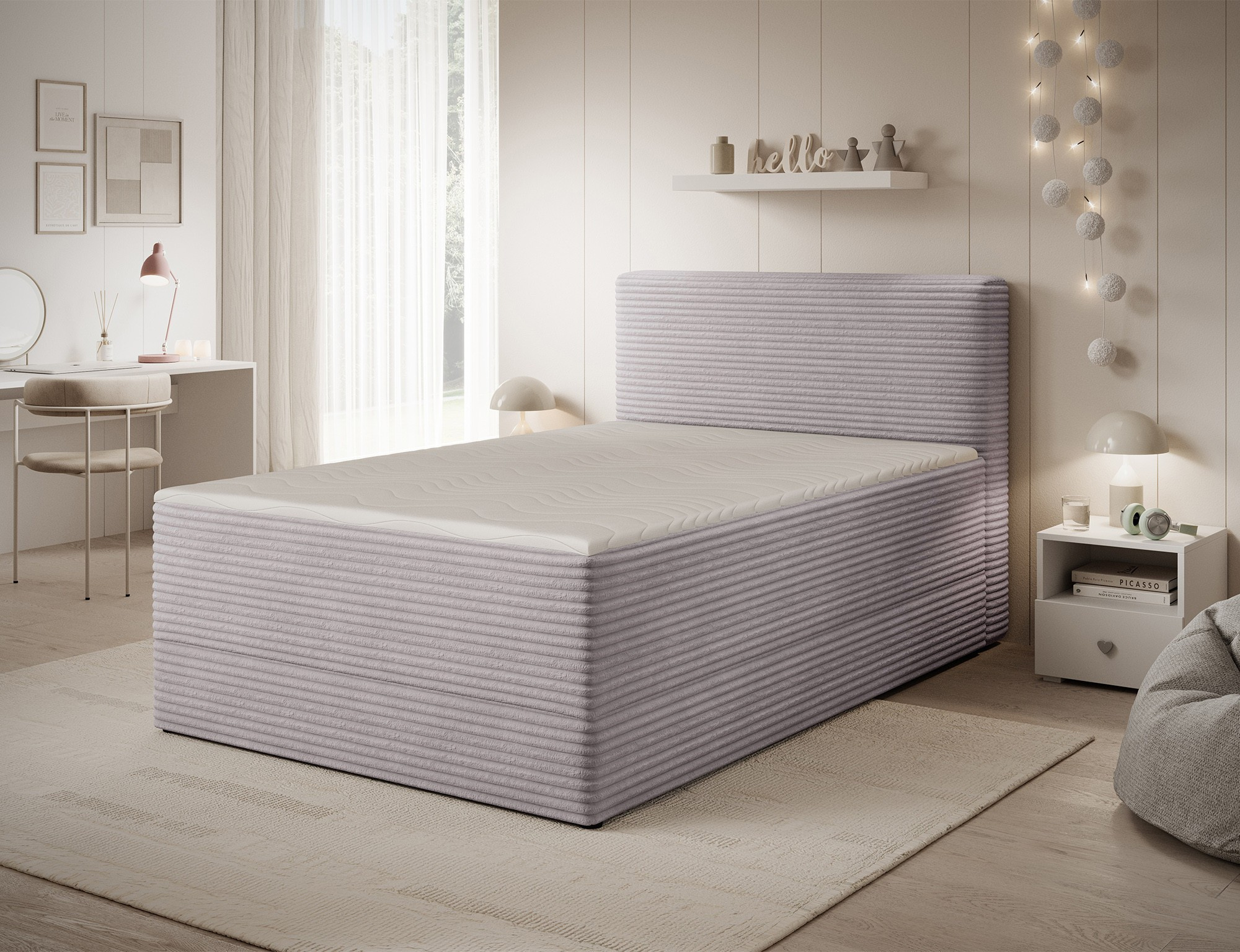 The Alamito boxspring bed is a functional and comfortable continental bed, designed for restful sleep and everyday use, making it an excellent practical choice for the bedroom. Its solid construction, with a height of 108 cm and a length of 215 cm, ensures stability and proper support, while carefully selected materials contribute to durability and comfort. The headboard is filled with 5 cm thick T2130 foam, while the base is made from a combination of T2130 foam, a bonell spring system, and T2540 foam, guaranteeing elasticity and sleeping comfort. The bed is complemented by a 5 cm thick topper, which enhances comfort and body adaptation. It features a practical bedding storage compartment that makes organization easier and helps optimize bedroom space. The structure includes a bonell spring mattress permanently mounted on a frame made of solid wood and particle board, providing a sturdy base and long-lasting durability. The Alamito model is available in two sizes: 120x200 cm and 140x200 cm, making it an ideal choice for both smaller and medium-sized bedrooms, combining aesthetics, functionality, and a high standard of sleep.