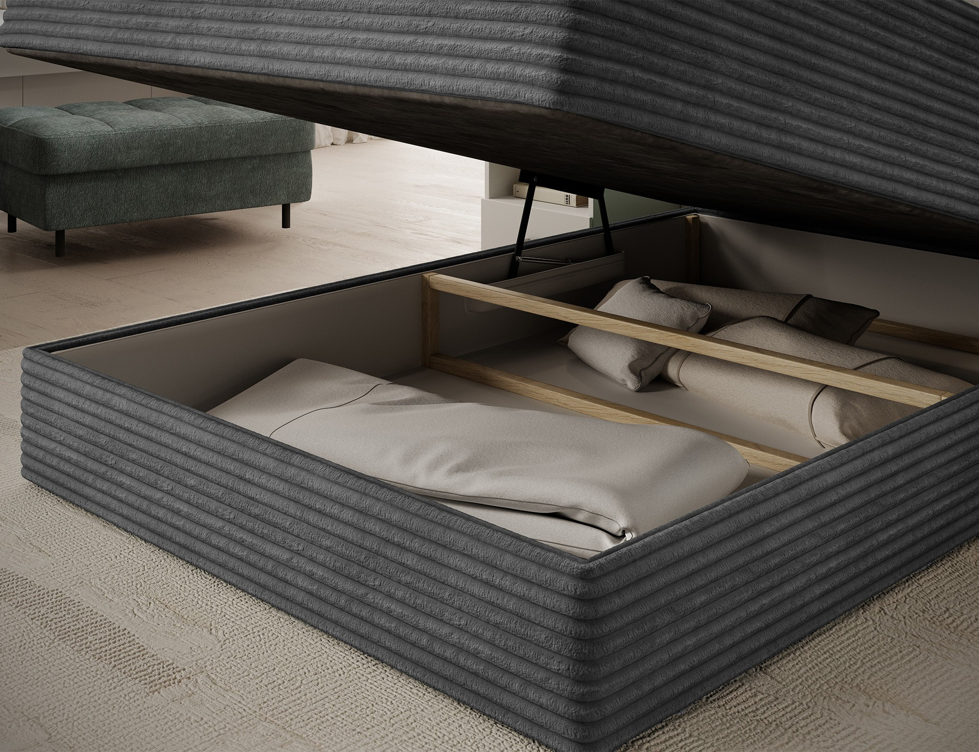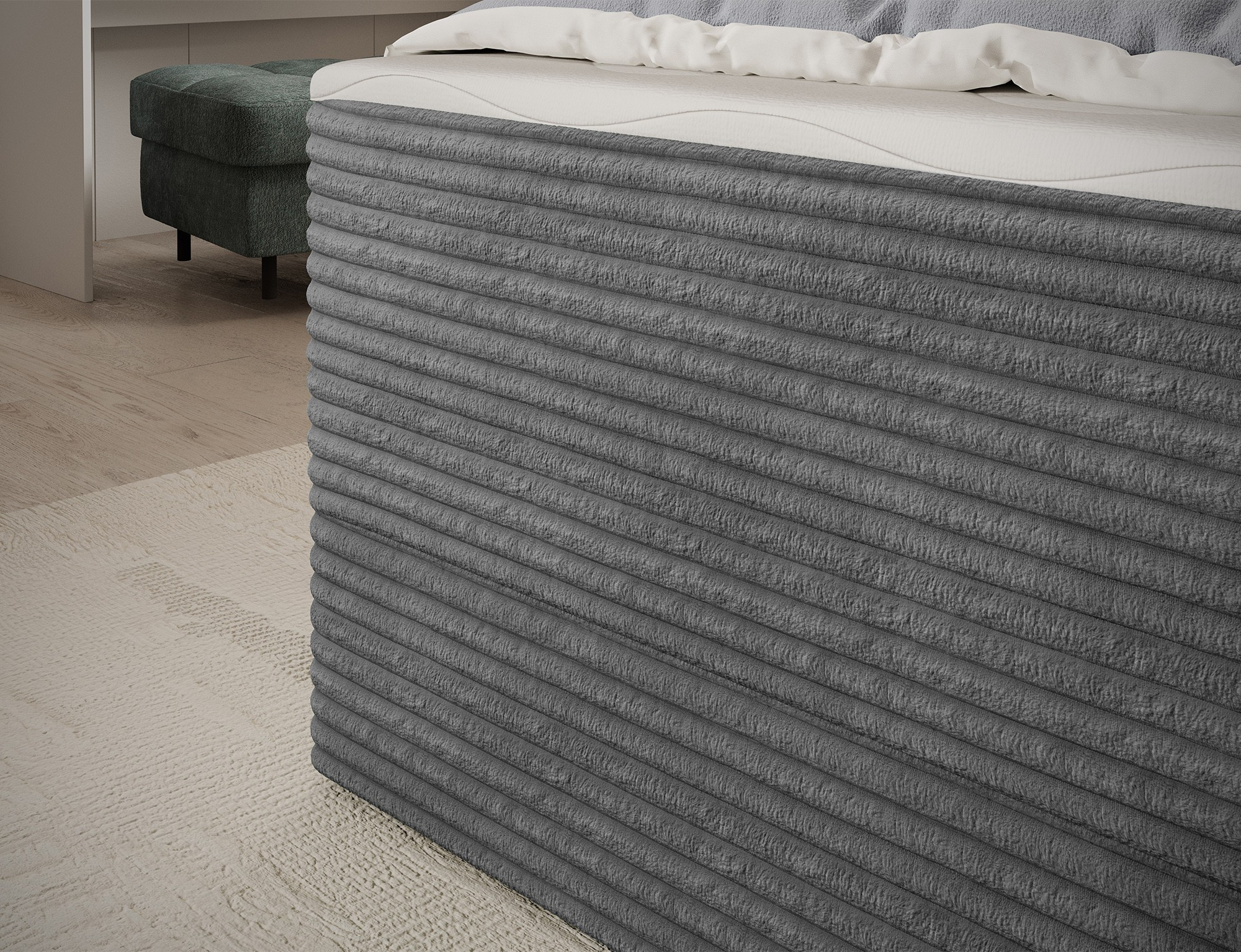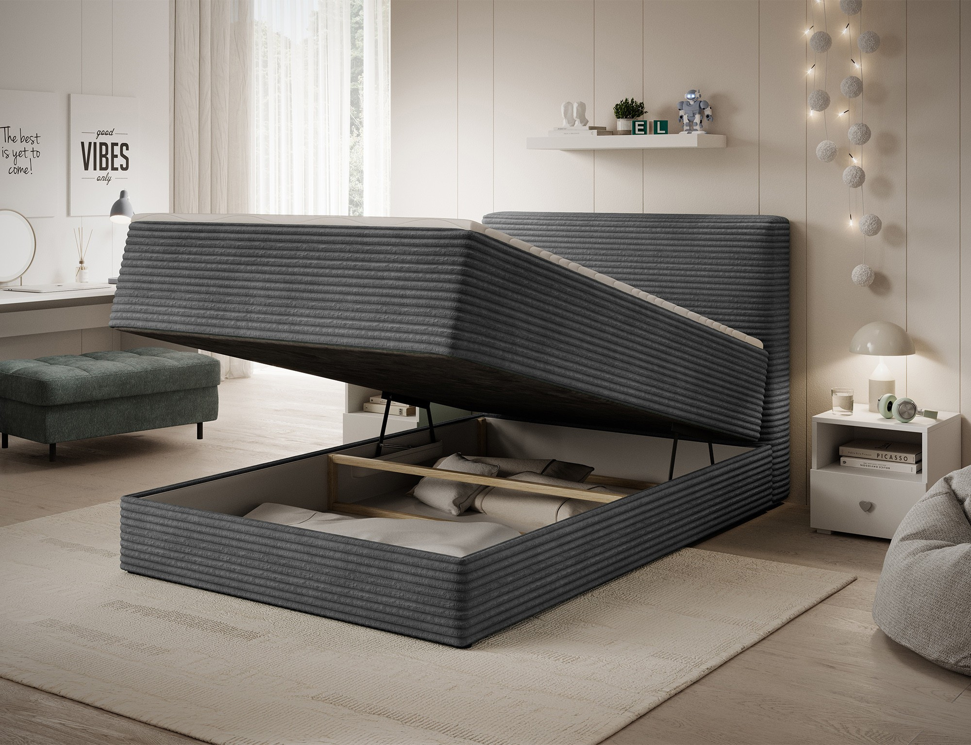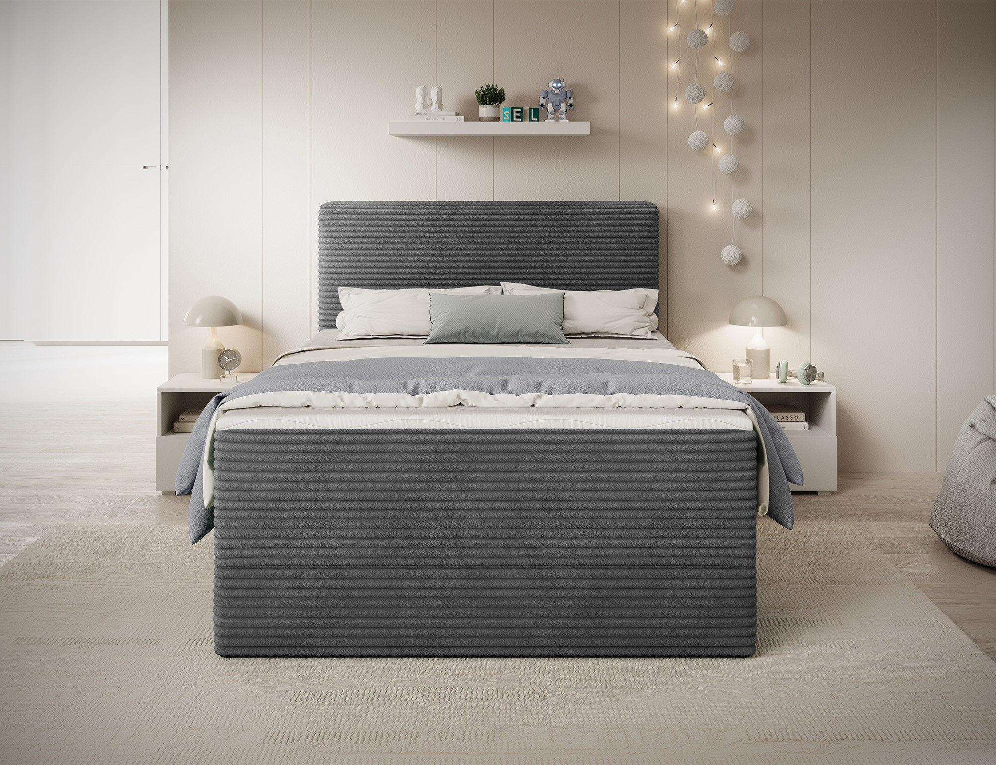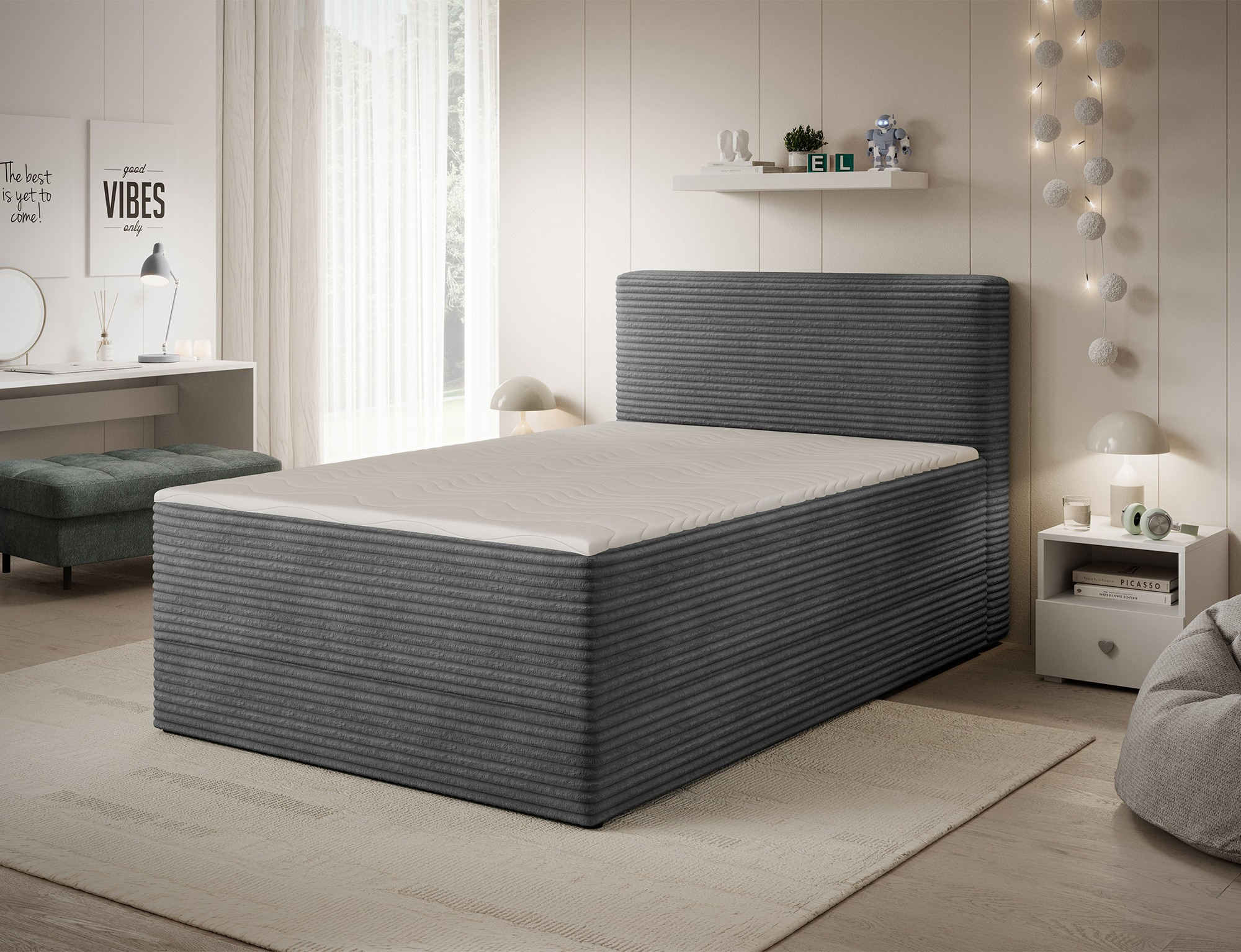 The Alamito boxspring bed is a functional and comfortable continental bed, designed for restful sleep and everyday use, making it an excellent practical choice for the bedroom. Its solid construction, with a height of 108 cm and a length of 215 cm, ensures stability and proper support, while carefully selected materials contribute to durability and comfort. The headboard is filled with 5 cm thick T2130 foam, while the base is made from a combination of T2130 foam, a bonell spring system, and T2540 foam, guaranteeing elasticity and sleeping comfort. The bed is complemented by a 5 cm thick topper, which enhances comfort and body adaptation. It features a practical bedding storage compartment that makes organization easier and helps optimize bedroom space. The structure includes a bonell spring mattress permanently mounted on a frame made of solid wood and particle board, providing a sturdy base and long-lasting durability. The Alamito model is available in two sizes: 120x200 cm and 140x200 cm, making it an ideal choice for both smaller and medium-sized bedrooms, combining aesthetics, functionality, and a high standard of sleep.