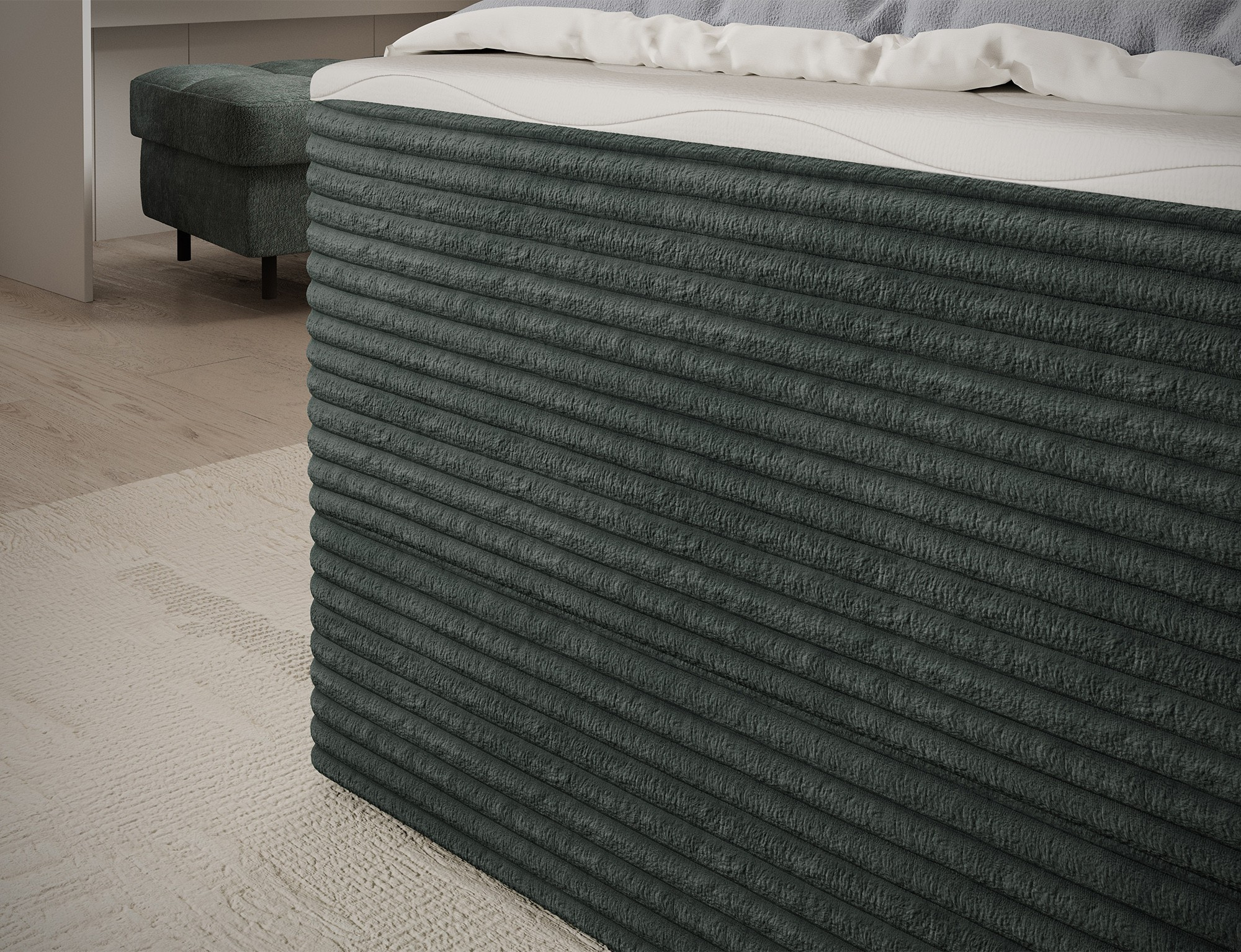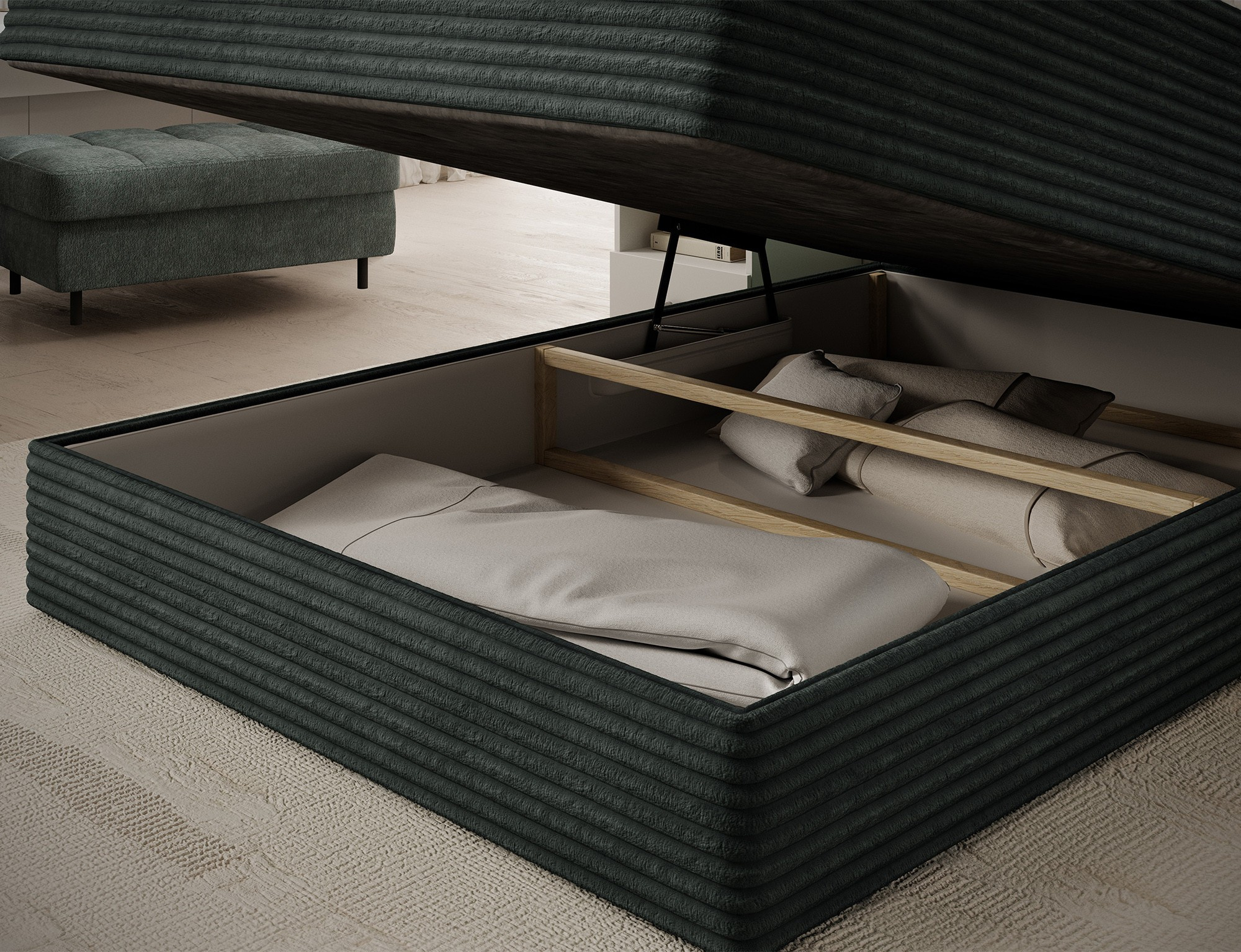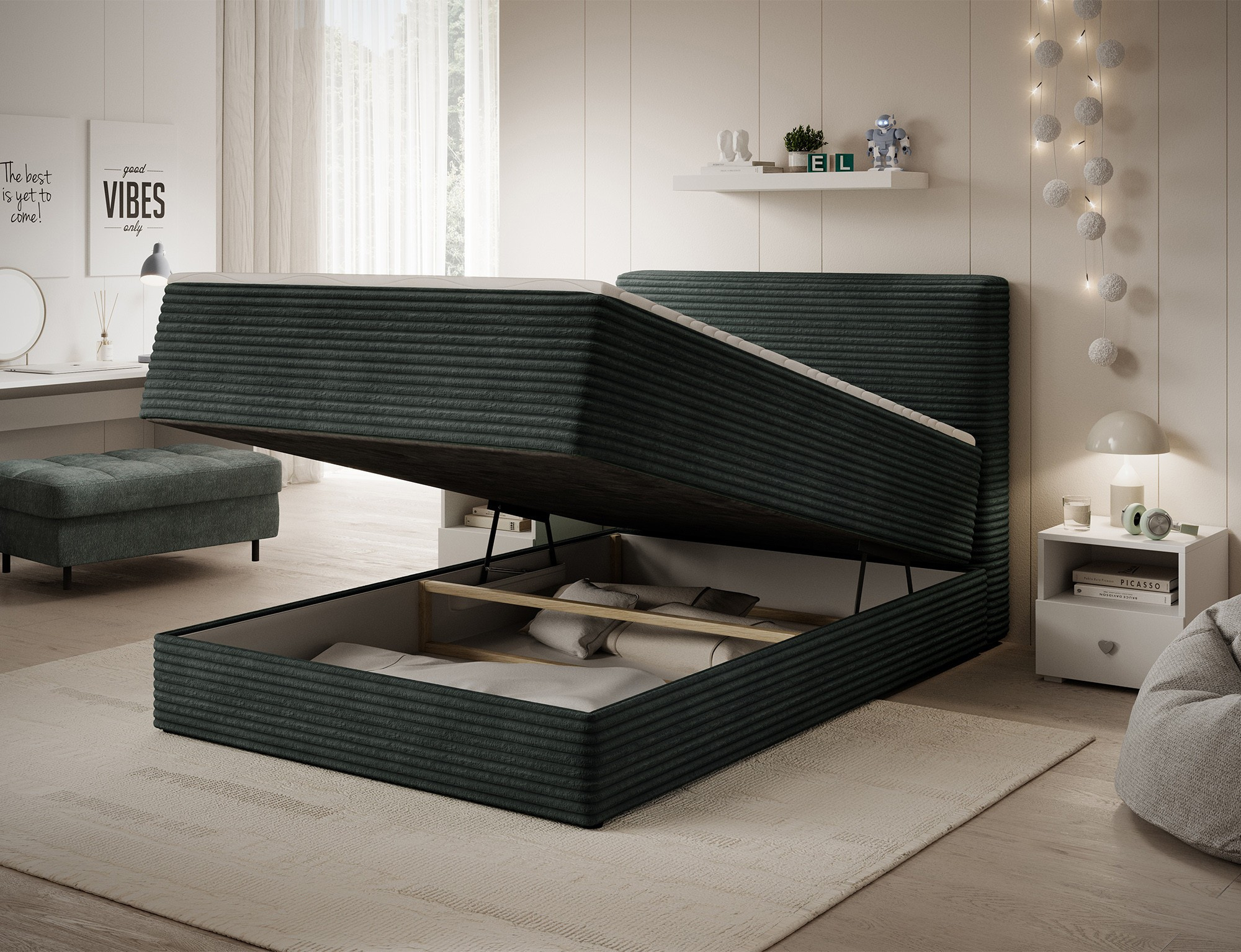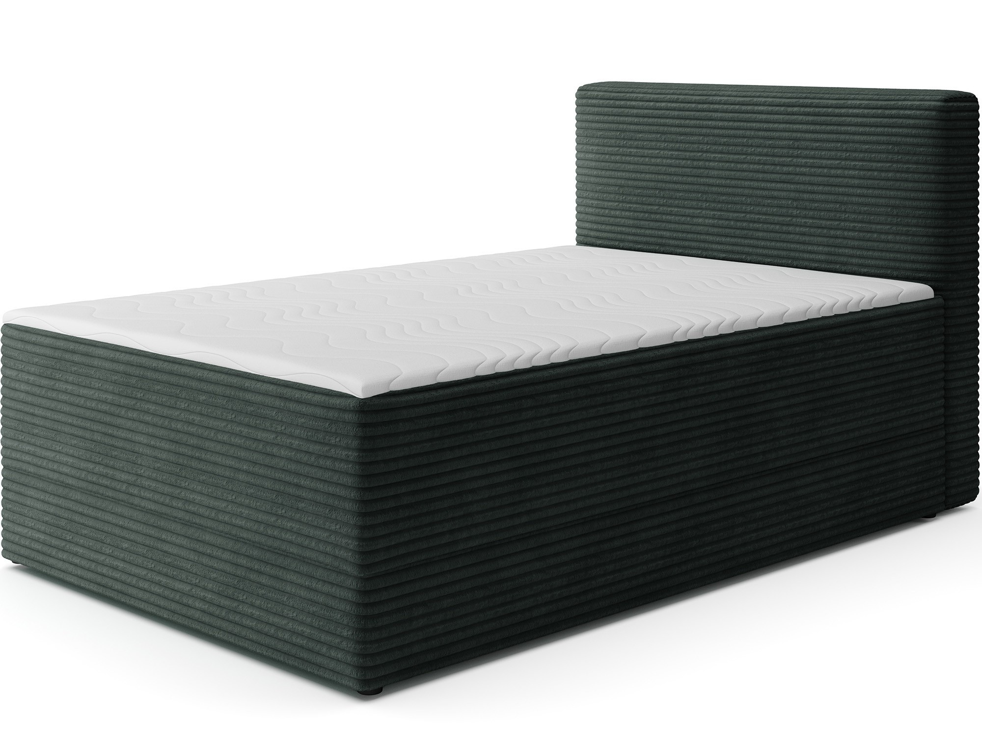 The Alamito boxspring bed is a functional and comfortable continental bed, designed for restful sleep and everyday use, making it an excellent practical choice for the bedroom. Its solid construction, with a height of 108 cm and a length of 215 cm, ensures stability and proper support, while carefully selected materials contribute to durability and comfort. The headboard is filled with 5 cm thick T2130 foam, while the base is made from a combination of T2130 foam, a bonell spring system, and T2540 foam, guaranteeing elasticity and sleeping comfort. The bed is complemented by a 5 cm thick topper, which enhances comfort and body adaptation. It features a practical bedding storage compartment that makes organization easier and helps optimize bedroom space. The structure includes a bonell spring mattress permanently mounted on a frame made of solid wood and particle board, providing a sturdy base and long-lasting durability. The Alamito model is available in two sizes: 120x200 cm and 140x200 cm, making it an ideal choice for both smaller and medium-sized bedrooms, combining aesthetics, functionality, and a high standard of sleep.