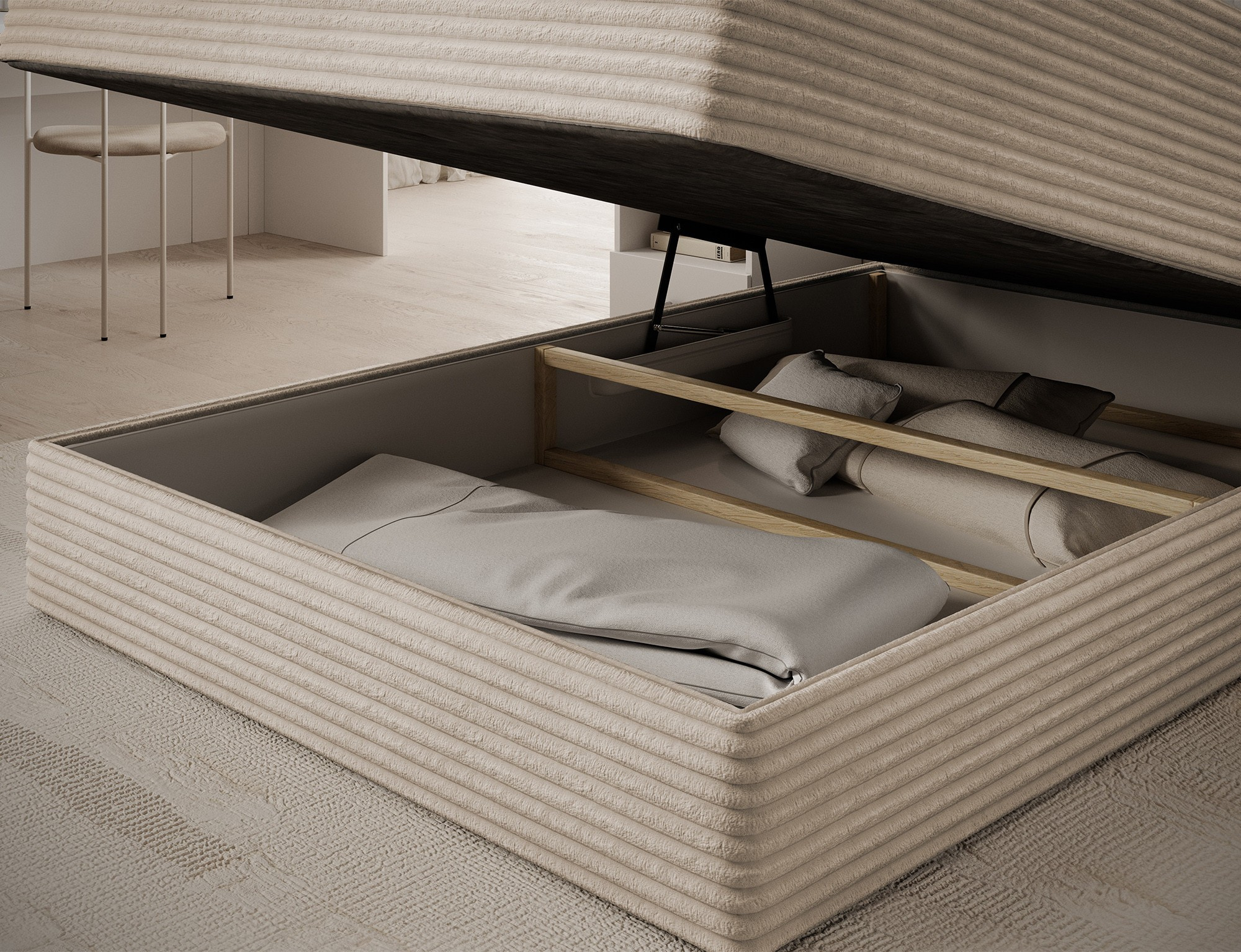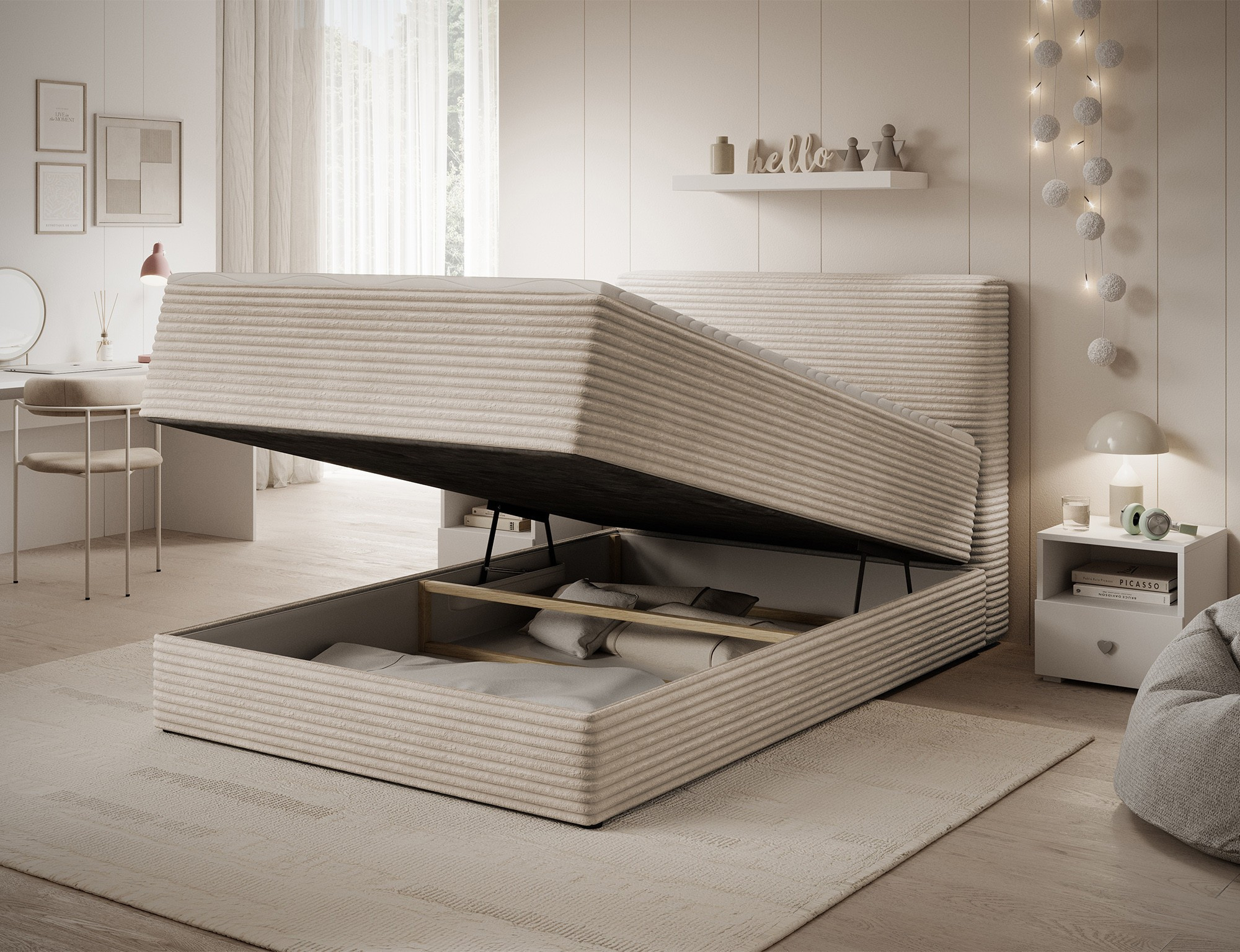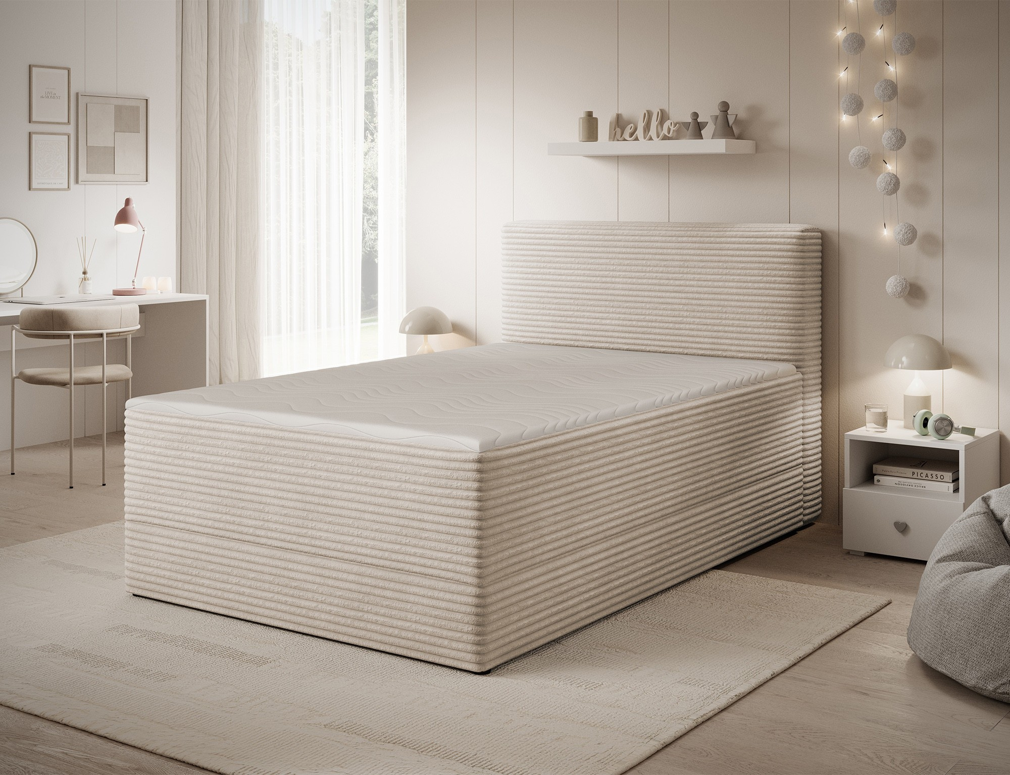 The Alamito boxspring bed is a functional and comfortable continental bed, designed for restful sleep and everyday use, making it an excellent practical choice for the bedroom. Its solid construction, with a height of 108 cm and a length of 215 cm, ensures stability and proper support, while carefully selected materials contribute to durability and comfort. The headboard is filled with 5 cm thick T2130 foam, while the base is made from a combination of T2130 foam, a bonell spring system, and T2540 foam, guaranteeing elasticity and sleeping comfort. The bed is complemented by a 5 cm thick topper, which enhances comfort and body adaptation. It features a practical bedding storage compartment that makes organization easier and helps optimize bedroom space. The structure includes a bonell spring mattress permanently mounted on a frame made of solid wood and particle board, providing a sturdy base and long-lasting durability. The Alamito model is available in two sizes: 120x200 cm and 140x200 cm, making it an ideal choice for both smaller and medium-sized bedrooms, combining aesthetics, functionality, and a high standard of sleep.