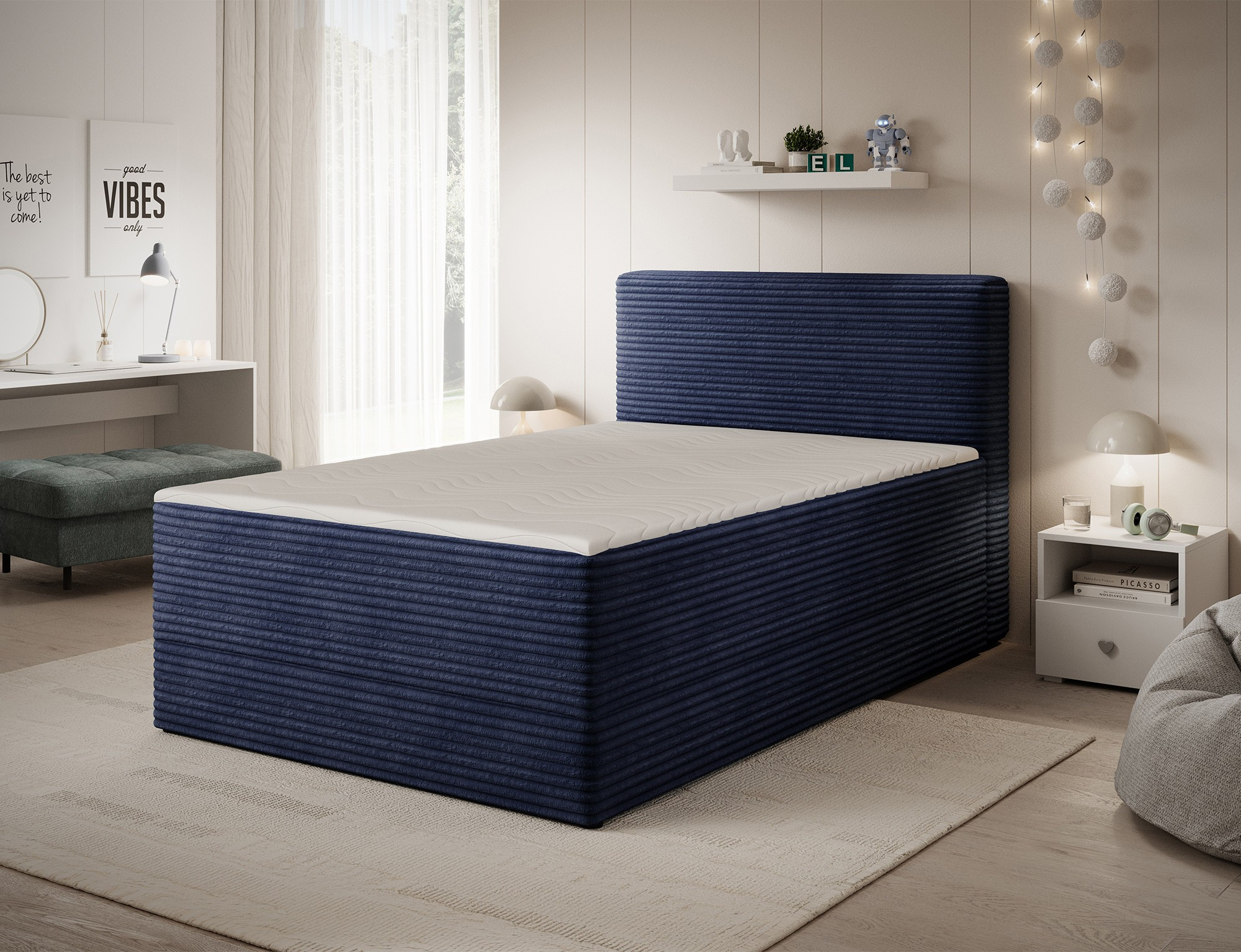 The Alamito boxspring bed is a functional and comfortable continental bed, designed for restful sleep and everyday use, making it an excellent practical choice for the bedroom. Its solid construction, with a height of 108 cm and a length of 215 cm, ensures stability and proper support, while carefully selected materials contribute to durability and comfort. The headboard is filled with 5 cm thick T2130 foam, while the base is made from a combination of T2130 foam, a bonell spring system, and T2540 foam, guaranteeing elasticity and sleeping comfort. The bed is complemented by a 5 cm thick topper, which enhances comfort and body adaptation. It features a practical bedding storage compartment that makes organization easier and helps optimize bedroom space. The structure includes a bonell spring mattress permanently mounted on a frame made of solid wood and particle board, providing a sturdy base and long-lasting durability. The Alamito model is available in two sizes: 120x200 cm and 140x200 cm, making it an ideal choice for both smaller and medium-sized bedrooms, combining aesthetics, functionality, and a high standard of sleep.
