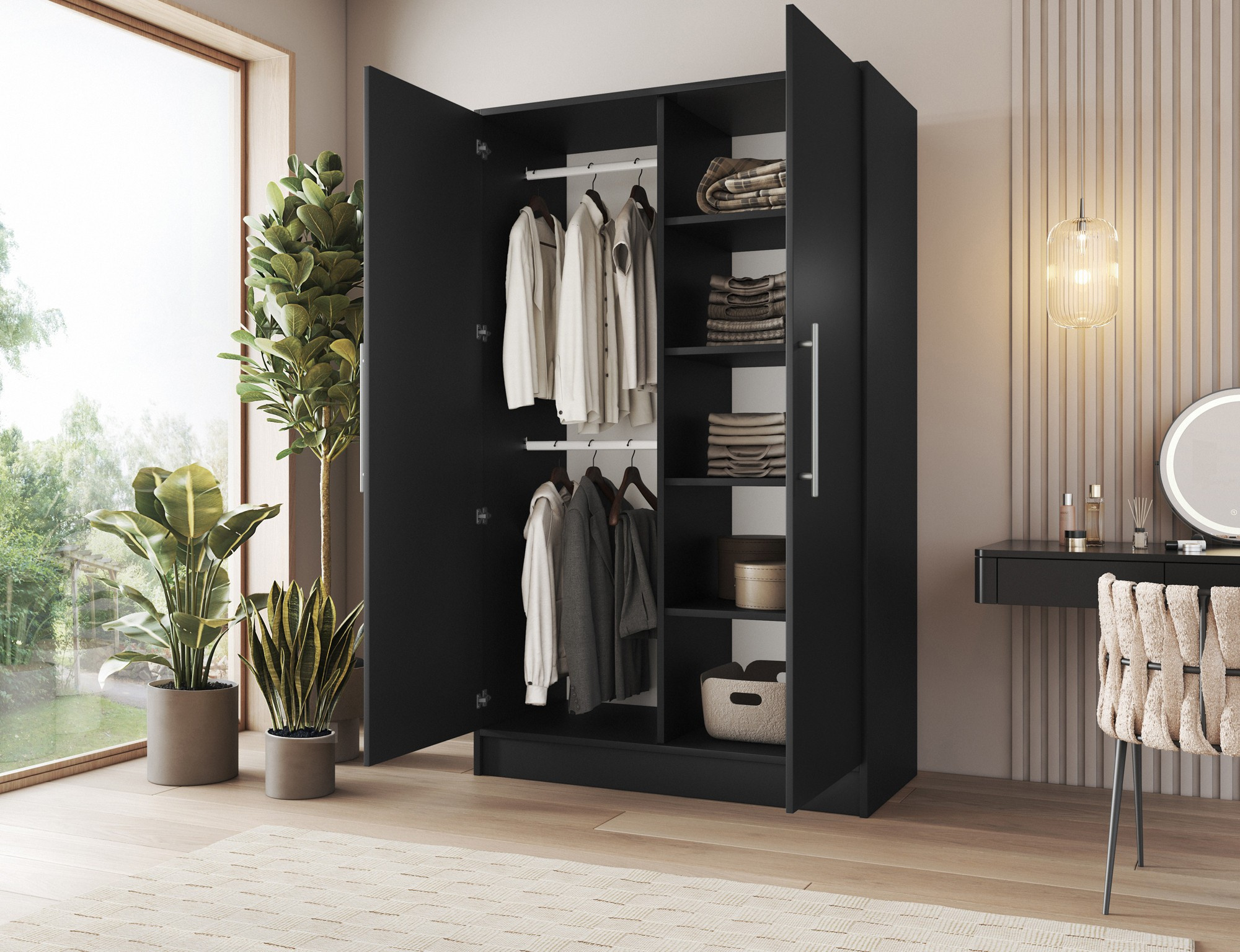 Šatní skříň Alarica je prostorná a robustní skříň na oblečení navržená pro pohodlné uložení oblečení a doplňků v domácnostech různých velikostí. S rozměry 120 cm na šířku, 200 cm na výšku a 60 cm do hloubky nabízí velkorysý využitelný prostor, přičemž si zachovává proporce, které umožňují snadné umístění ve většině interiérových uspořádání. Tělo i přední část jsou vyrobeny z odolné laminované desky, což zajišťuje odolnost vůči každodennímu používání, snadné čištění a atraktivní vzhled po mnoho let. Uvnitř skříně se nacházejí 4 praktické police o rozměrech 57 × 37 × 51 cm, každá s maximální nosností až 8 kg—ideální pro složené oblečení, domácí textilie nebo organizéry—zatímco 2 závěsné tyče doplňují sestavu, což vám umožní pohodlně pověsit košile, šaty, kabáty a další oděvy bez pomačkání. Další výhodou je zrcadlo na přední straně, které opticky zvětšuje místnost a usnadňuje každodenní přípravy. Šatní skříň Alarica váží 120 kg, což zdůrazňuje stabilitu její konstrukce, a je dodávána ve 3 baleních (66 × 206 × 7 cm – 45 kg, 66 × 125 × 7 cm – 45 kg, 62 × 190 × 4 cm – 28 kg), což usnadňuje přepravu a přenášení dovnitř—vynikající volba pro každého, kdo hledá funkční, moderní a odolnou šatní skříň s policemi, závěsnými tyčemi a zrcadlem pro úhledně organizované ukládání oblečení.