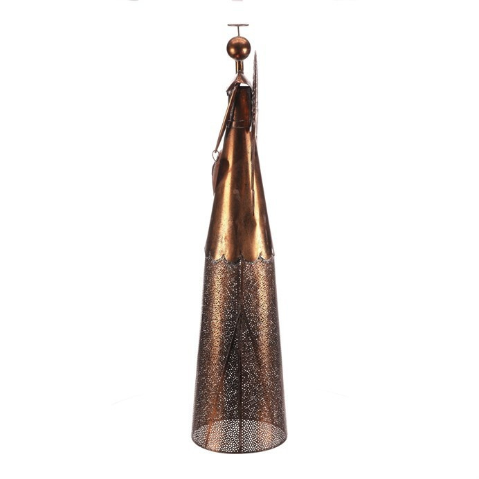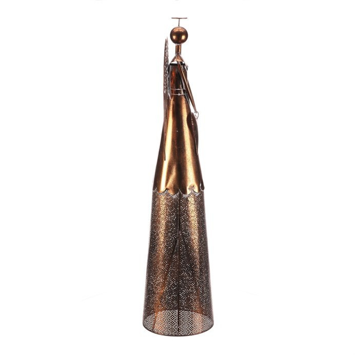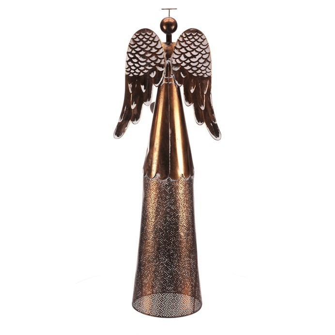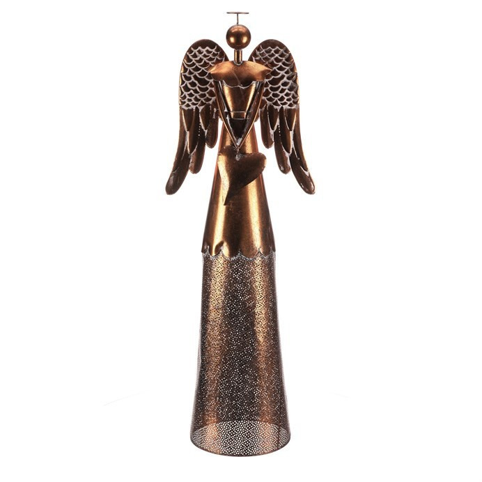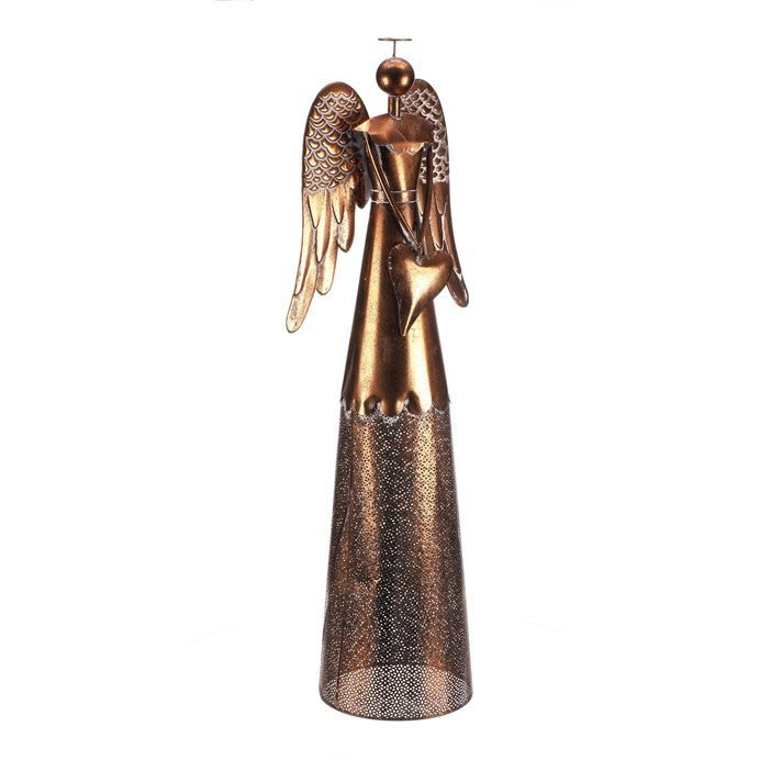 Kovový anděl ve svátečním měděném odstínu bude impozantní dekorací pro váš domov. Drží v rukou srdce jako symbol lásky a pohody, což z něj činí ideální ozdobu pro vánoční období. Má krásně tvarovaná křídla, kulatou hlavičku a spodní část šatů je průhledná, což umocňuje jeho eleganci. Díky výšce přibližně 105 cm upoutá pozornost a stane se úžasnou dominantou v každém interiéru, ať už bude umístěná na stole, komodě, okně nebo na podlaze.