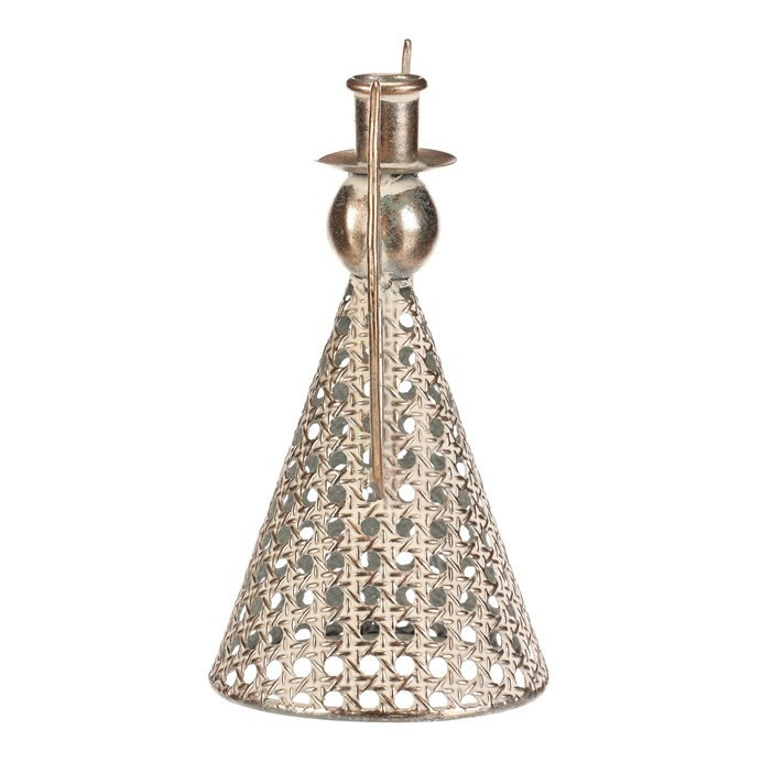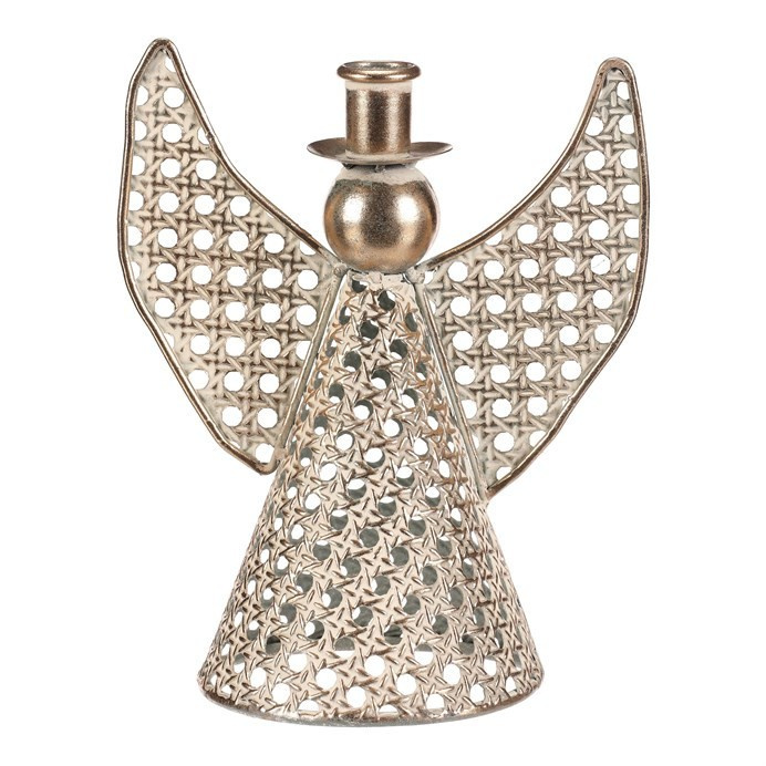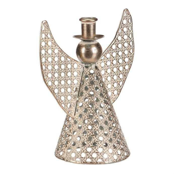 Kovový anděl vysoký přibližně 22 cm je elegantní vánoční dekorace v champagne odstínu. Na jeho kulaté hlavičce se nachází kalíšek přizpůsobený pro umístění kónické svíčky. Nabízí tak neodolatelnou kombinaci vkusné dekorace s možností vytvořit nádherný světelný efekt. Díky jemným kruhovým otvorům působí vzdušně a vkusně ozdobí váš interiér během svátečního období.