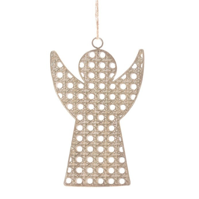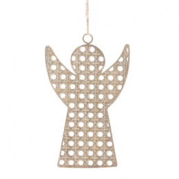 Kovová závěsná dekorace ve tvaru anděla v champagne barvě, přinese do vašeho domova jemný a elegantní prvek. Visí za očko na provázku a její vzdušný design s kruhovými otvory působí lehce a nadčasově. Skvěle doplní vánoční i celoroční výzdobu, ať už na okně, dveřích nebo ve vašem oblíbeném koutku.