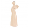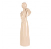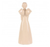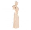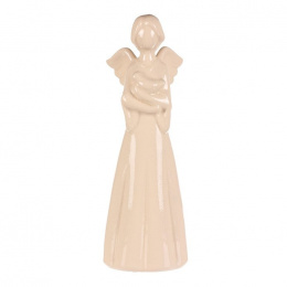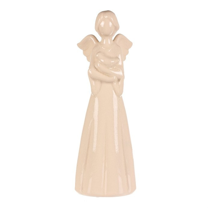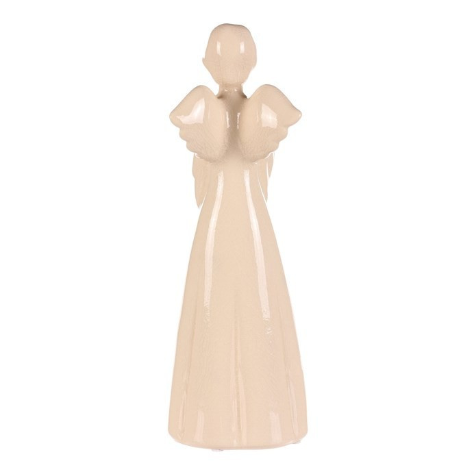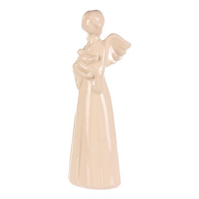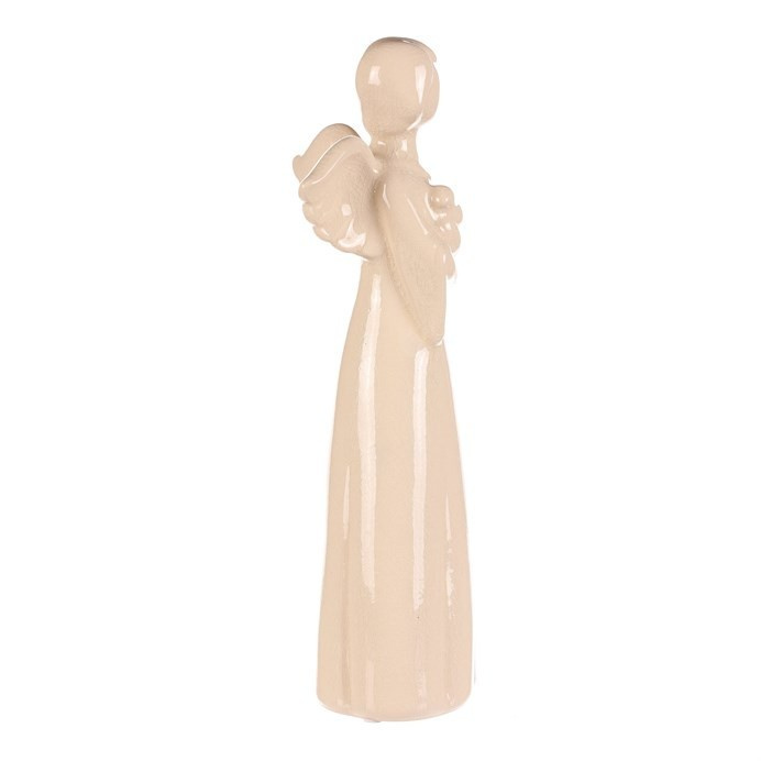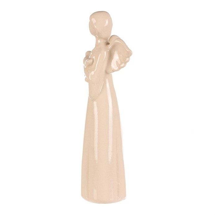Světle krémová keramická soška anděla s jednobarevným povrchem a rozpraskanou glazurou ztělesňuje jemnost a klid. V rukou něžně drží holubičku, což jí dodává nádech naděje a harmonie. Díky svému elegantnímu vzhledu se skvěle hodí jako dekorace na stůl nebo poličku, kde vnese do prostoru klidnou atmosféru a krásně jej zútulní.