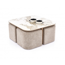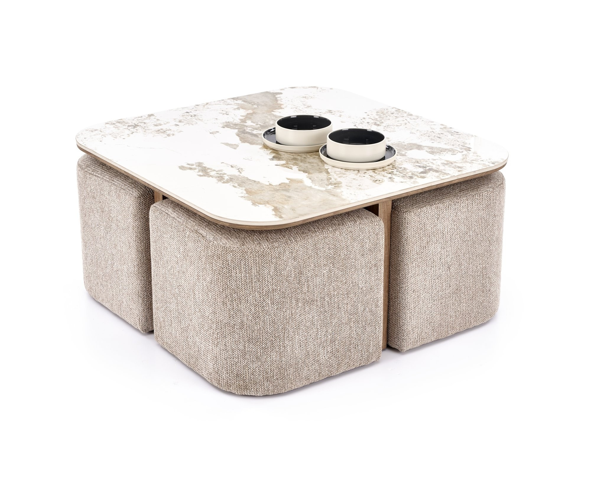 rozměry: 90/90/45 cm, stolek se 4 taburety, materiál: slinutý materiál / dýhovaná MDF / tkanina, barva: béžový mramor - světlý ořech - béžová