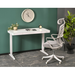 rozměry: 120/60/77-120 cm; výškově nastavitelný stůl / dotykový displej / bezdrátové nabíjení / port USB, materiál: sklo / práškově lakovaná ocel, barva: bílá
