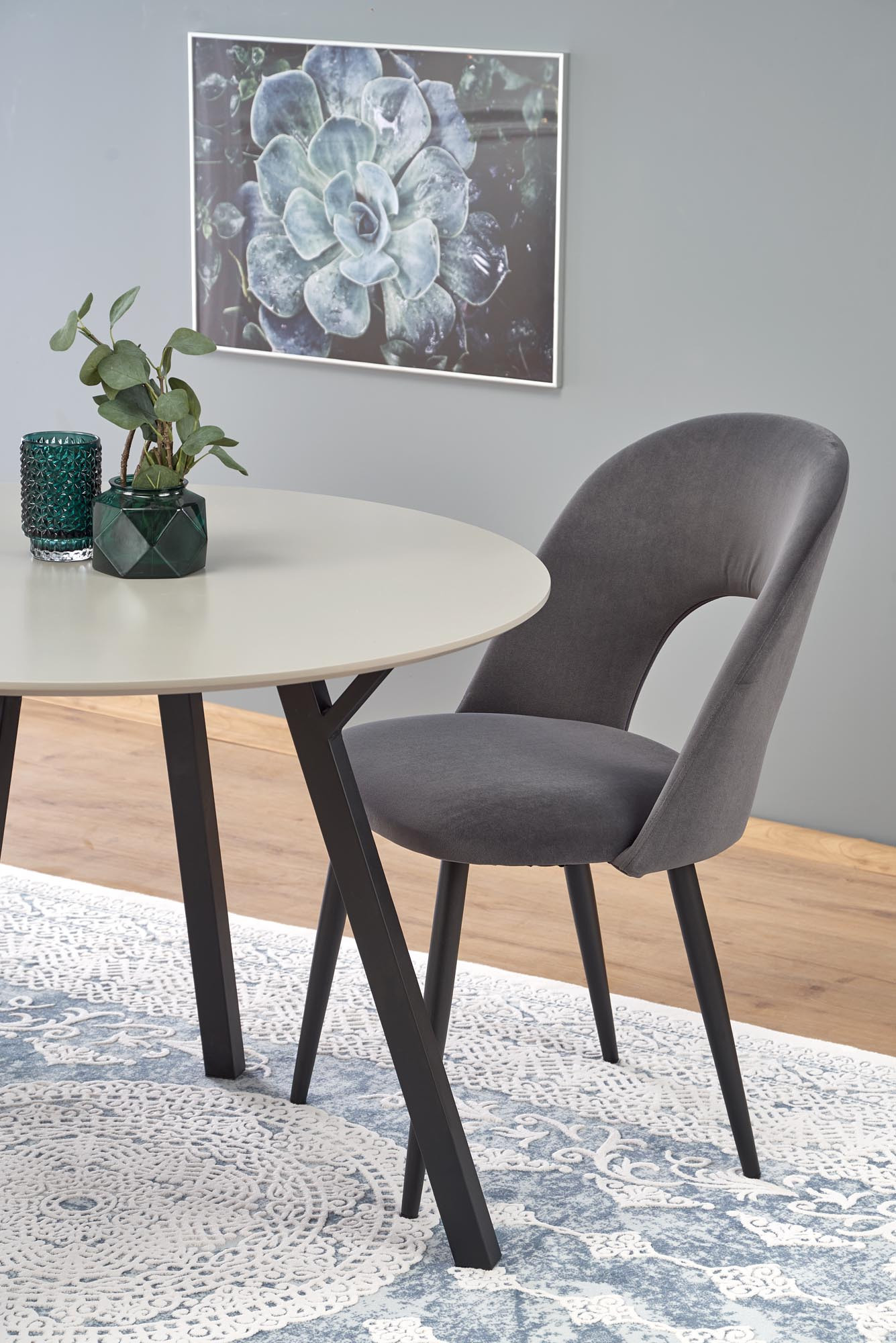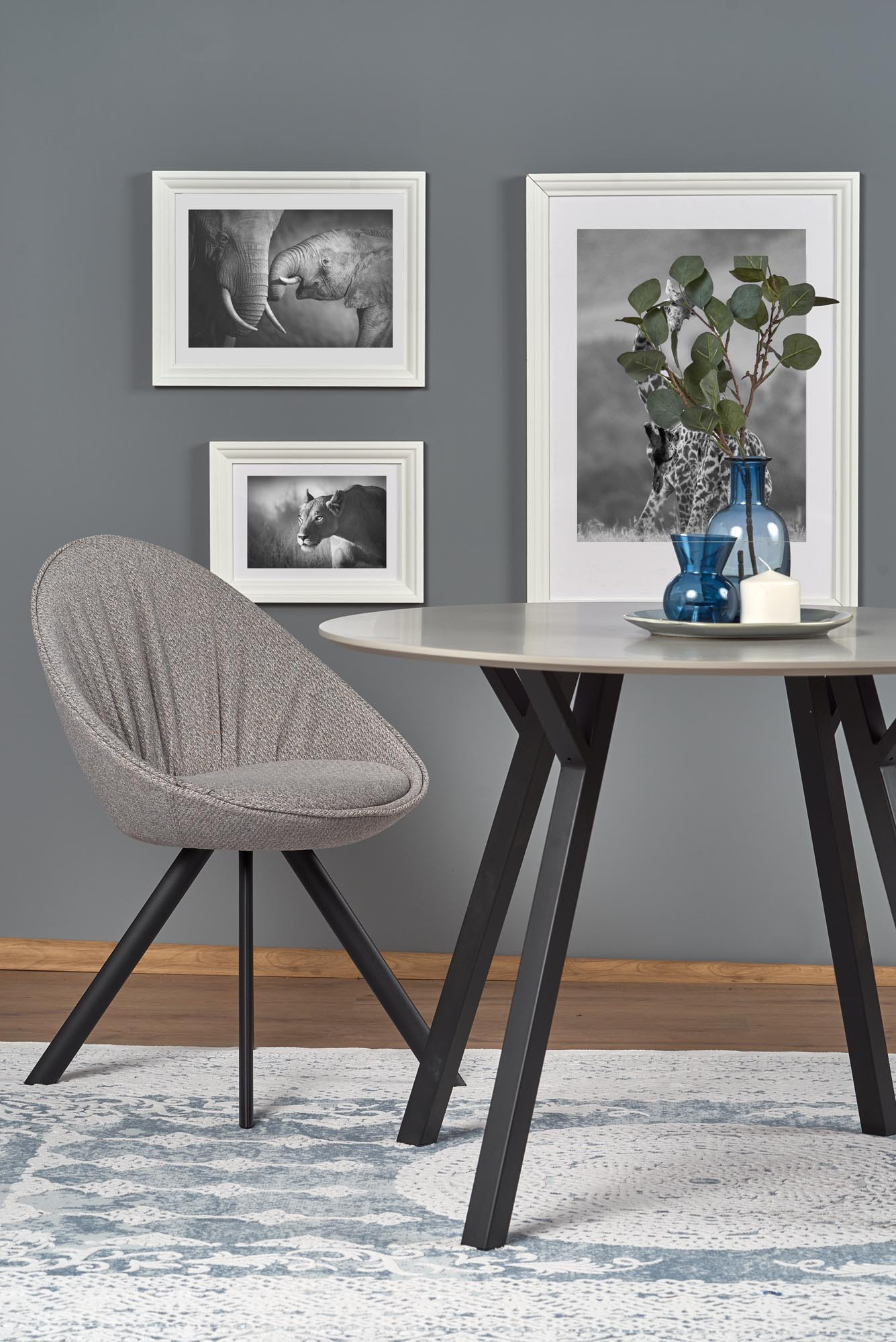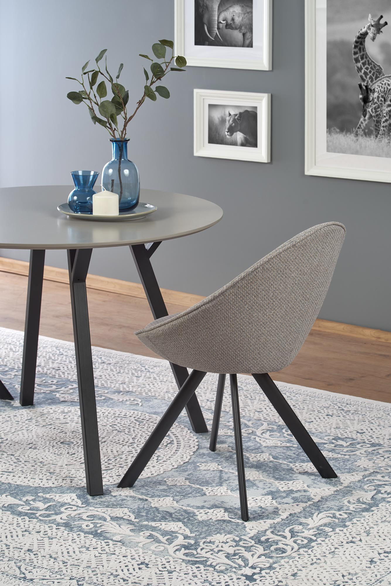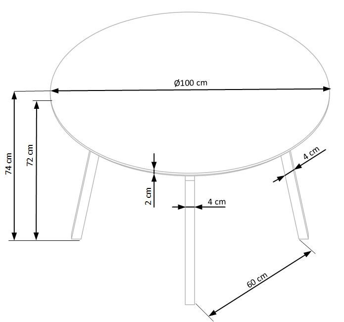 rozměry: o100/74 cm, materiál: MDF lakovaná / práškově lakovaná ocel, barva: deska - světle šedá, nohy - černé