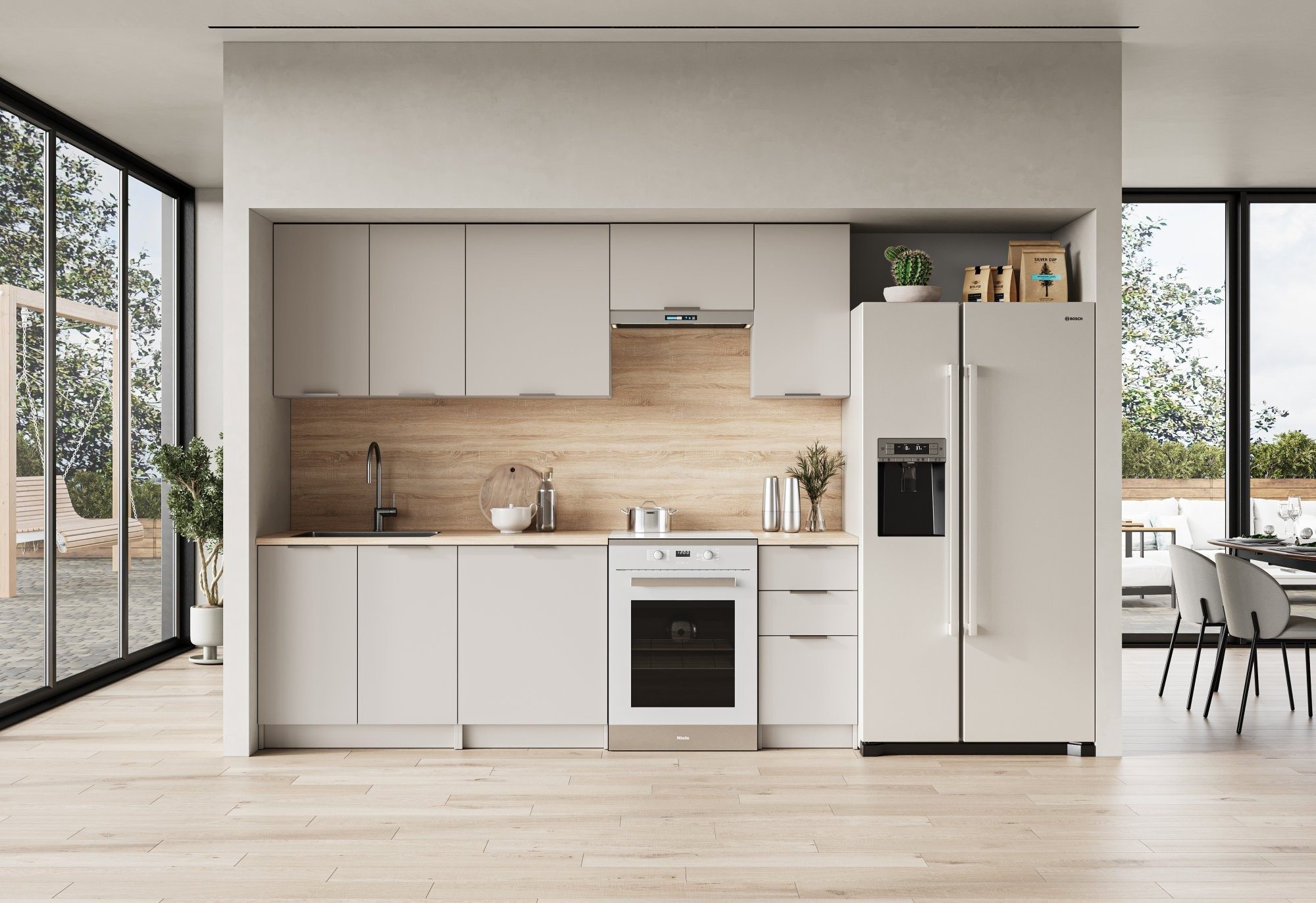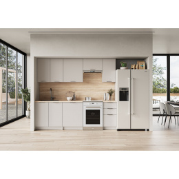 délka sestavy: 240 cm, plynové zvedáky, vysoké horní skříňky, pracovní deska tloušťky 28 mm, barvy: čela – kašmír, korpus - kašmír, pracovní deska - dub sonoma