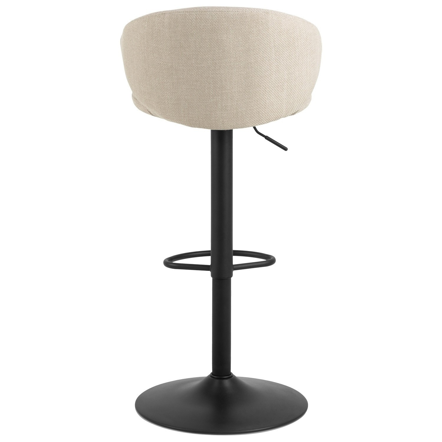 Díky krátkému, zakřivenému opěradlu a pohodlnému sedáku je barová stolička Ella s nastavitelnou výškou příjemná na sezení i pohled. Kombinace béžové strukturované tkaniny a černé základny ve tvaru trumpety, posílená otočnou funkcí a opěrkou na nohy, činí z tohoto moderního sedacího nábytku možnost, která doplní každý domov. Barová stolička s plynovým pístem, funkcí otáčení a opěrkou na nohy. Plynový píst umožňuje nastavení výšky v rozmezí 61-82 cm. Stabilní základna ve tvaru trubky vyrobená z oceli lakované práškovou barvou na černo. Certifikát FSC. Navrženo Lasse Cha Pedersenem. Výška opěradla 24 cm Šířka sedáku 47 cm Hloubka sedáku 41,5 cm Maximální výška sedáku. 82 cm Výška sedadla min. 61 cm Výška područky od podlahy 76 cm Šířka područky 3,5 cm Hloubka područky 22 cm Výška područky 14 cm
