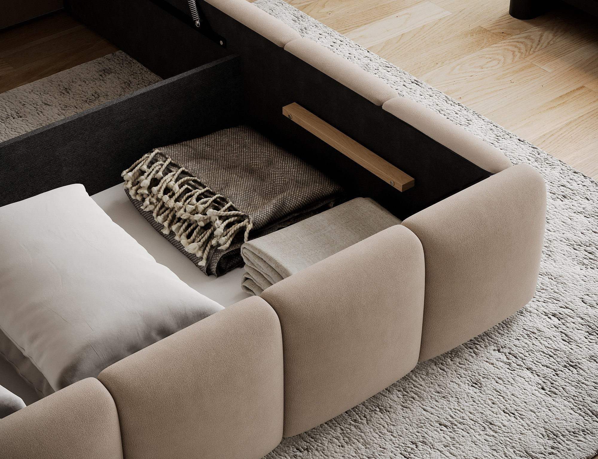 Jednou z hlavních výhod této postele je úložný prostor, který je ideální pro uskladnění ložního prádla, sezónního oblečení nebo dalších potřebných věcí. Tento prostor je snadno přístupný a pomáhá udržovat vaši ložnici čistou a uspořádanou.