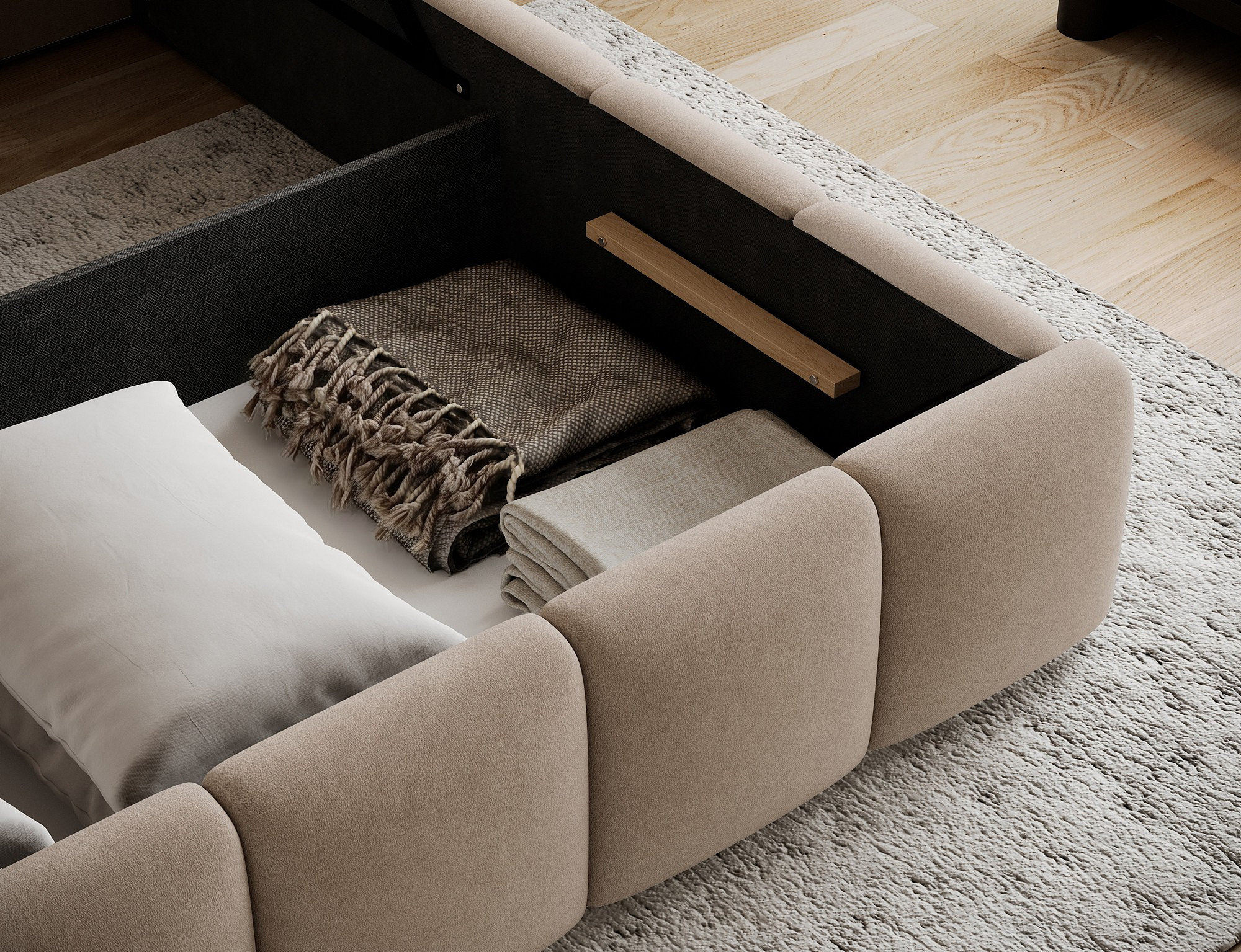 Jednou z hlavních výhod této postele je úložný prostor, který je ideální pro uskladnění ložního prádla, sezónního oblečení nebo dalších potřebných věcí. Tento prostor je snadno přístupný a pomáhá udržovat vaši ložnici čistou a uspořádanou.