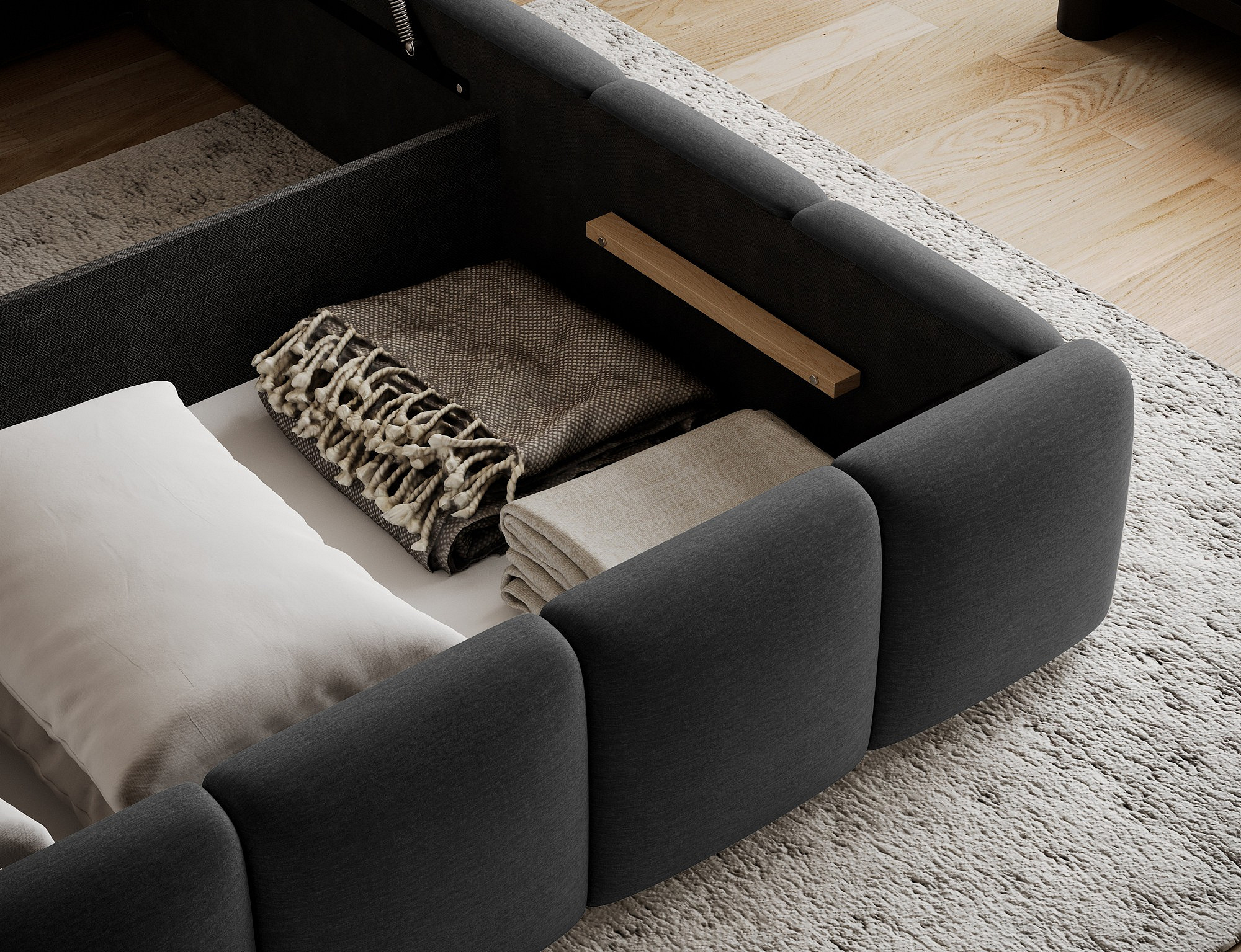 Jednou z hlavních výhod této postele je úložný prostor, který je ideální pro uskladnění ložního prádla, sezónního oblečení nebo dalších potřebných věcí. Tento prostor je snadno přístupný a pomáhá udržovat vaši ložnici čistou a uspořádanou.