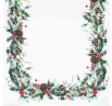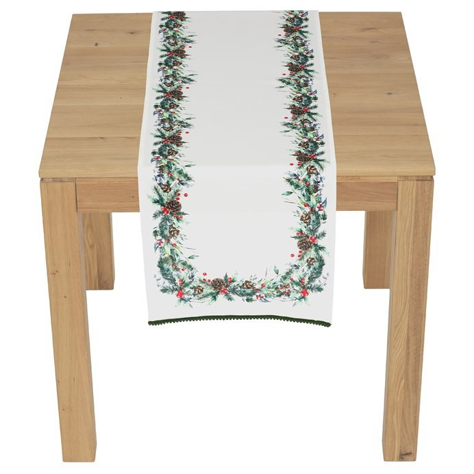 Běhoun s barevným vzorem jehličí, šišek a bobulí na čistě bílém podkladu vnese sváteční náladu na váš stůl. Vyrobený ze 100 % polyesteru o rozměru 40 × 150 cm je praktický a snadno udržovatelný – lze ho prát na 30 °C. Skvělý doplněk pro krásné a stylové prostření během vánočního období.