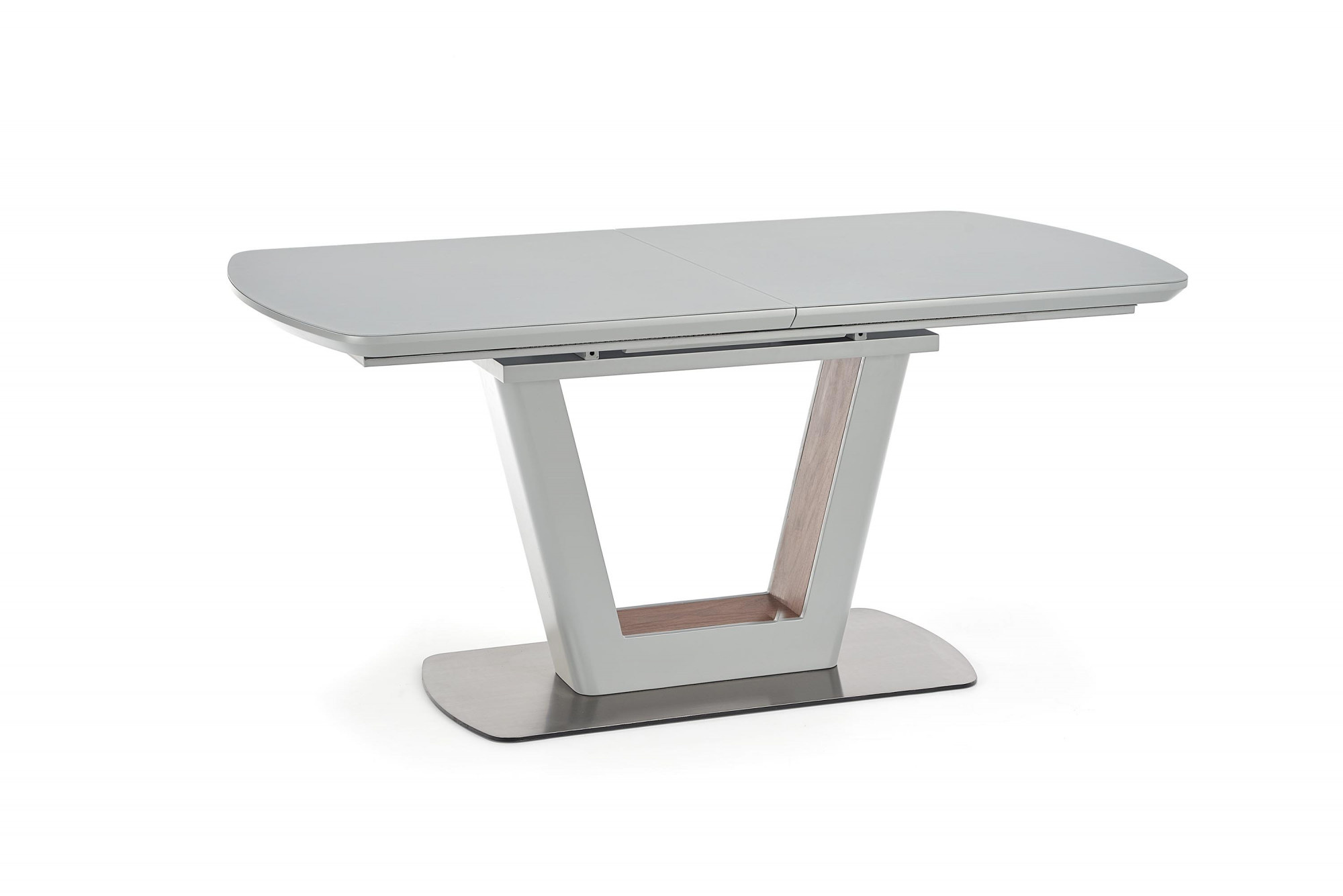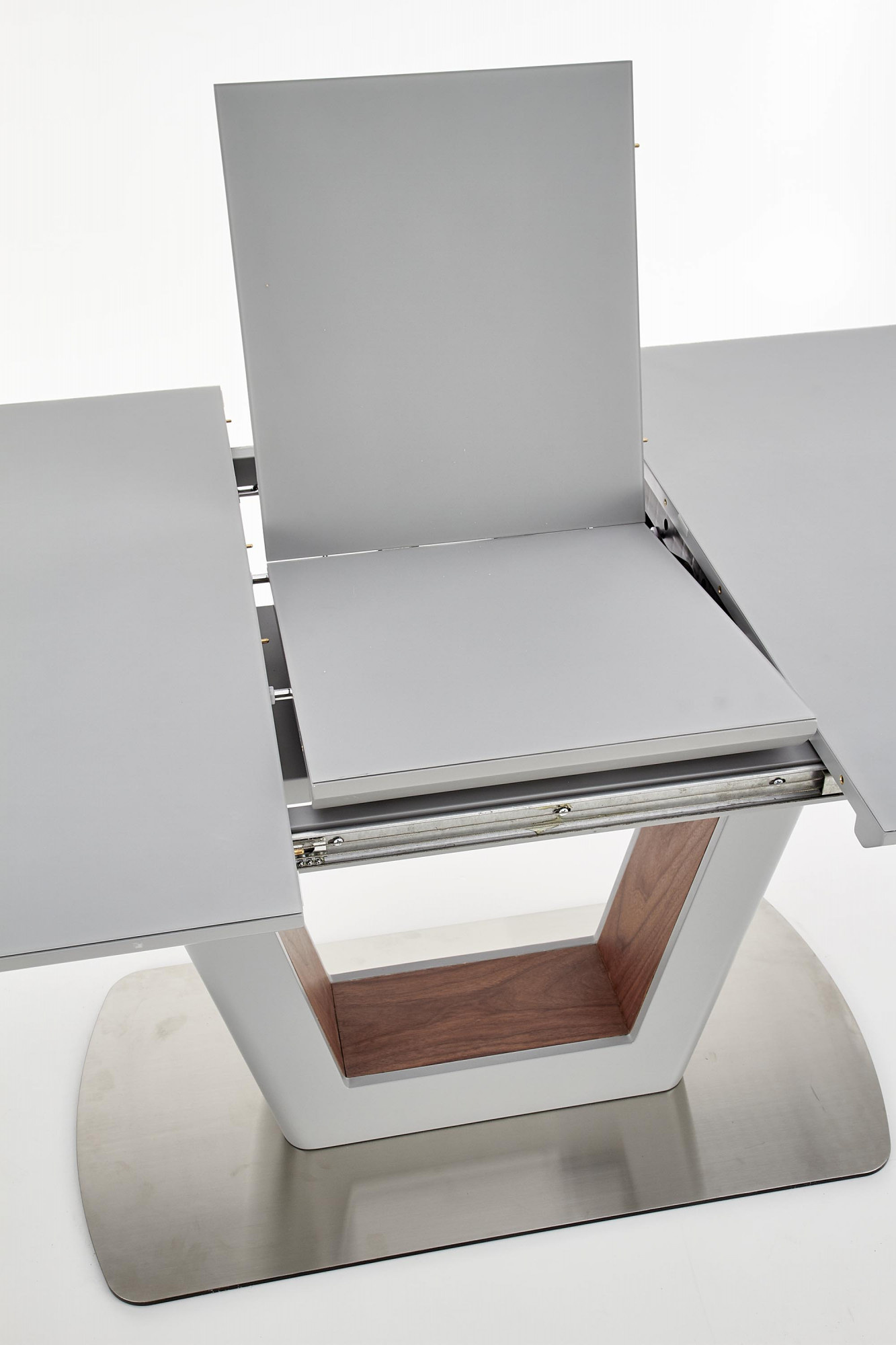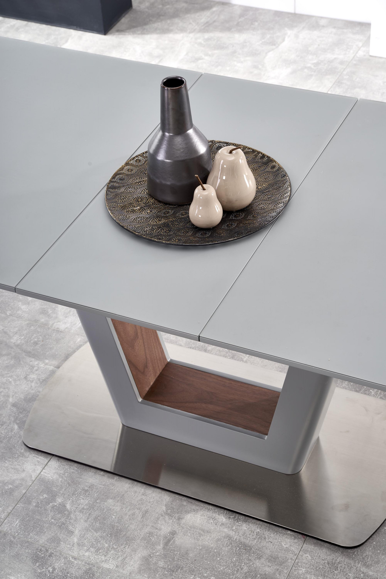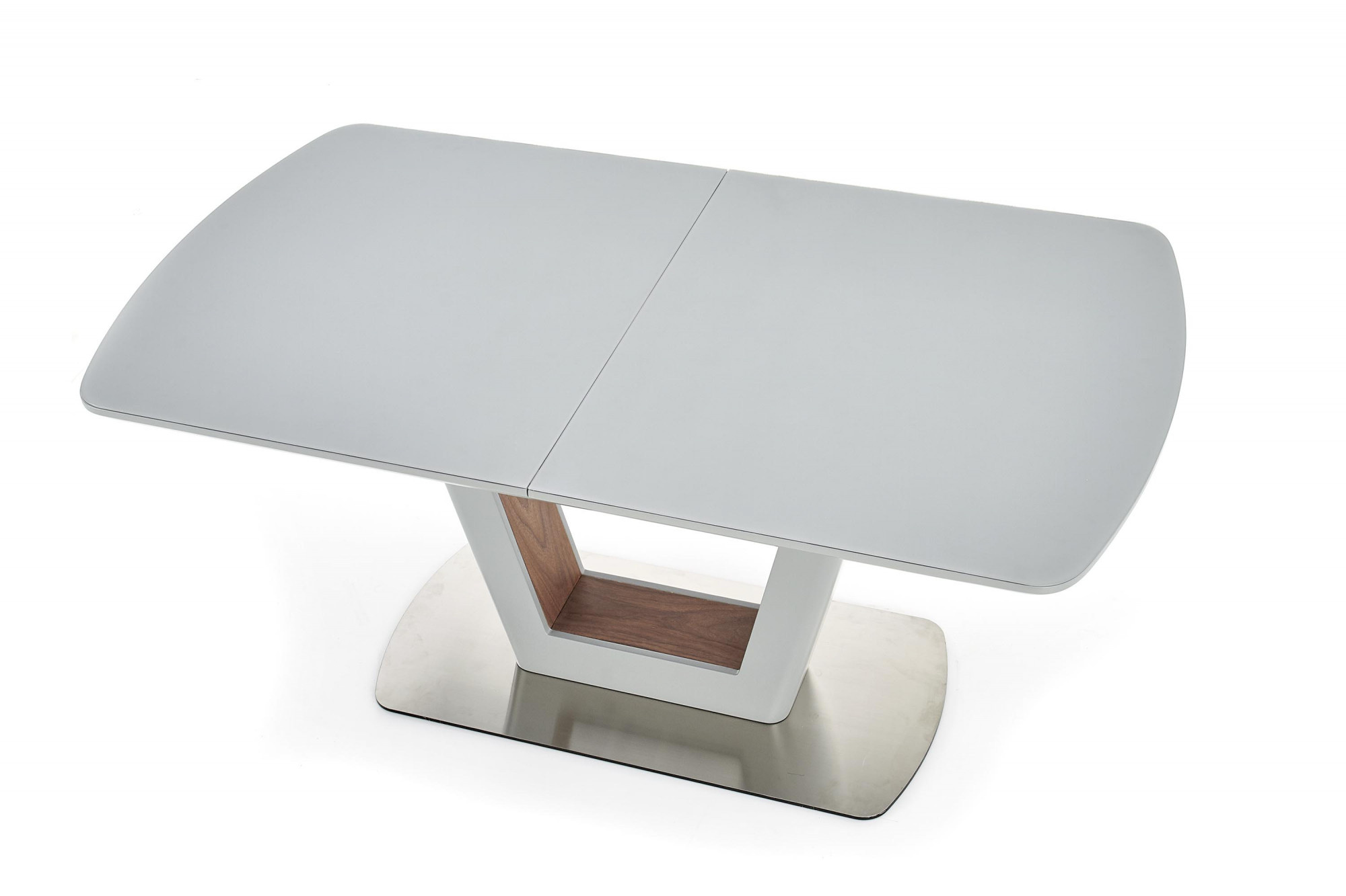 rozměry: 160÷200/90/76 cm, rozkládací stůl, materiál: sklo / lakovaná MDF / laminovaná MDF / nerezová ocel, barva: světle šedá matná - ořech.
