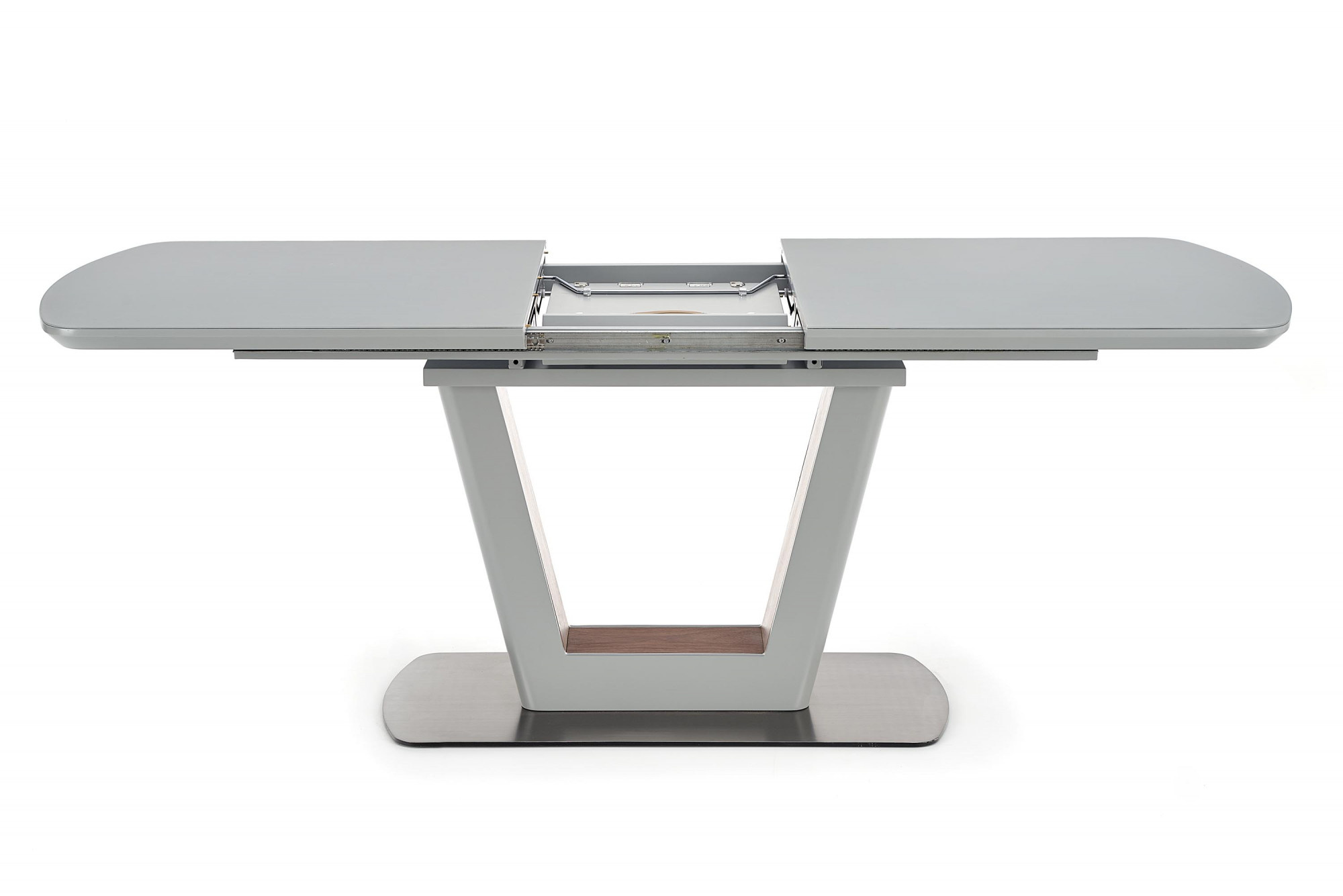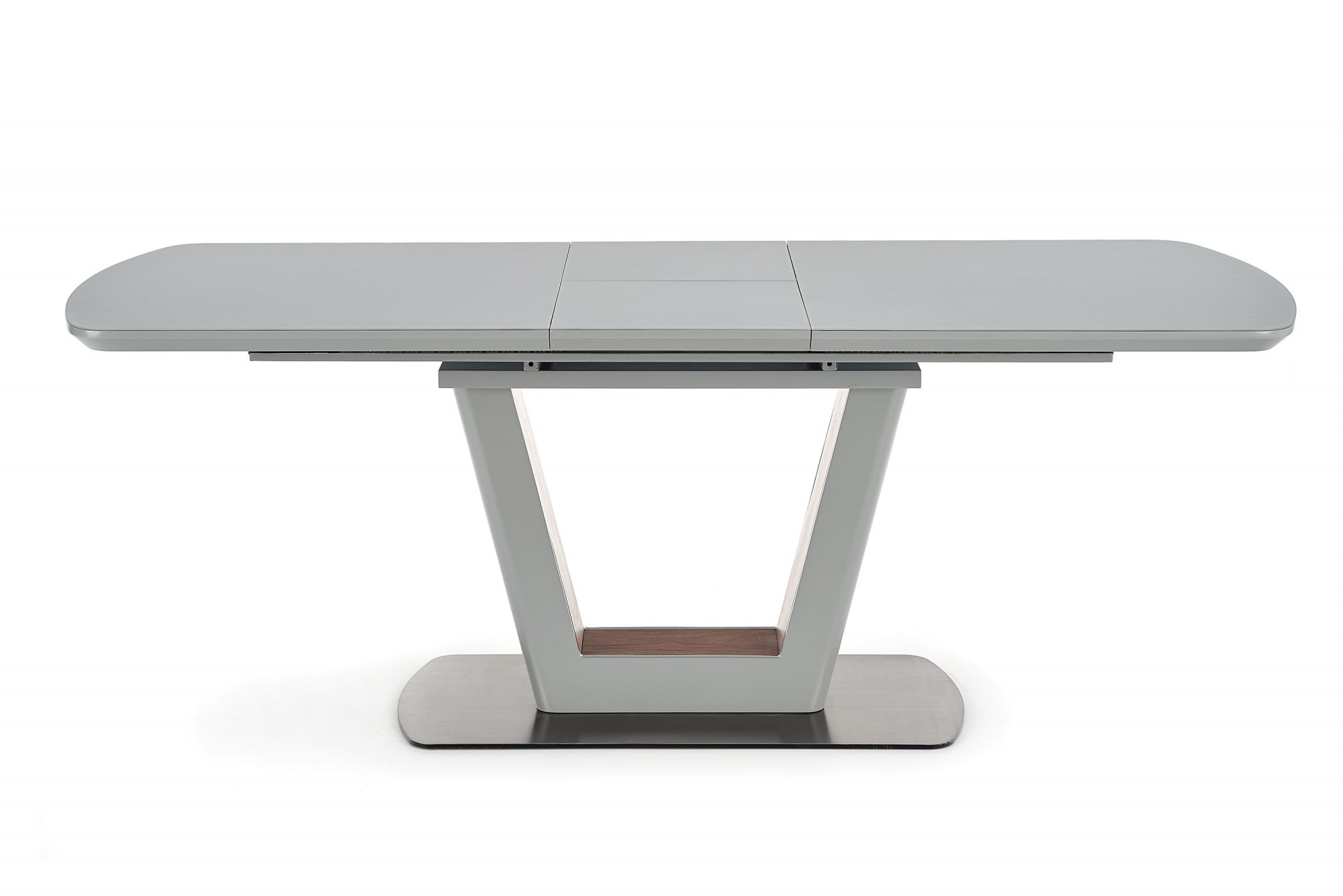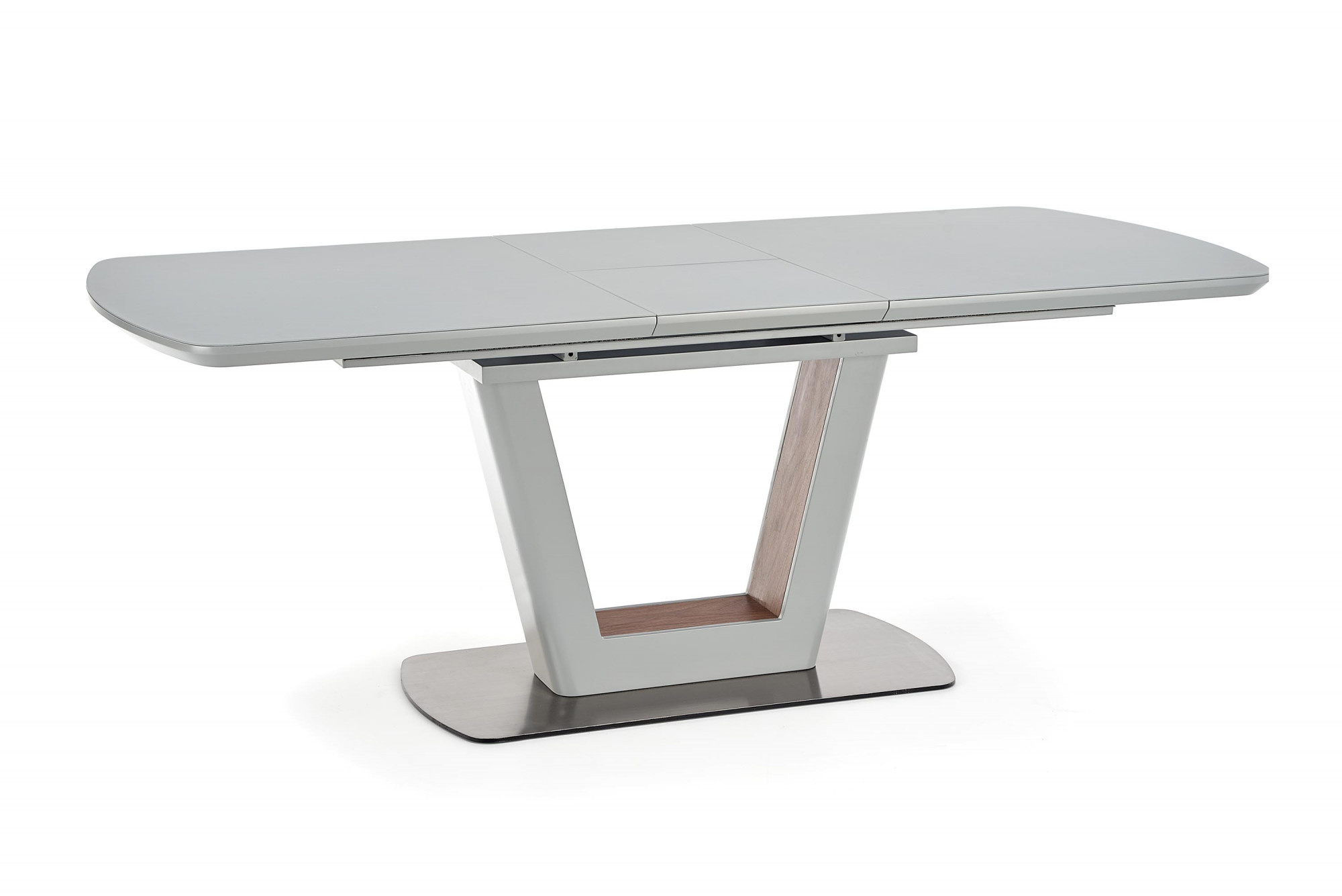 rozměry: 160÷200/90/76 cm, rozkládací stůl, materiál: sklo / lakovaná MDF / laminovaná MDF / nerezová ocel, barva: světle šedá matná - ořech.