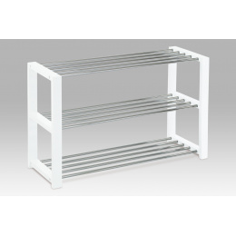 Botník s třemi policemi z chromovaného kovu a rámem z masivního kaučukovníku v bílé matné barvě nabízí praktické a pevné řešení pro uspořádání obuvi. Masivní dřevěný rám je upraven kvalitním matným lakem, který zajišťuje snadnou údržbu a dlouhou životnost. Police z chromovaného kovu poskytují dostatek prostoru pro uložení více párů bot a zároveň umožňují jejich větrání. Stabilní provedení botníku zaručuje bezpečné a pevné umístění v předsíni či šatně. Kompaktní rozměry usnadňují jeho umístění i do menších prostor.