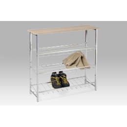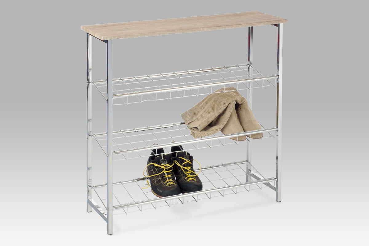 Praktický botník s třemi kovovými rošty s odkládací plochou. Díky svým rozměrům má ideální ložnou plochu na uložení bot, ale prostorově se vejde i do menších předsíní. Kostra botníku je kovová v povrchové úpravě lesklý chrom. Horní odkládací deska je z MDF v 3D dekoru dub San Remo. Rošty jsou z nosných kovových chromovaných trubek a ohýbané drátěné sítě. Nosnost jednotlivých polic je 6 kg. Dodáváno v demontu. S tímto botníkem budou rozházené boty po předsíni již jen minulostí.