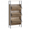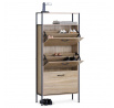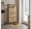 Botník s třemi přihrádkami a dvěma policemi nabízí praktické řešení pro uspořádání obuvi v domácnosti. Desky jsou vyrobeny z MDF v dekoru dub, který přináší přírodní odstíny a decentní strukturu dřeva. Stabilní kovová podnož zajišťuje pevnou oporu a lehkost celkového provedení. Každá přihrádka je opatřena černou úzkou úchytkou pro snadné otevírání a zavírání. Kompaktní rozměry umožňují umístění do předsíně či chodby, kde efektivně využije prostor a udrží pořádek.
