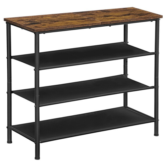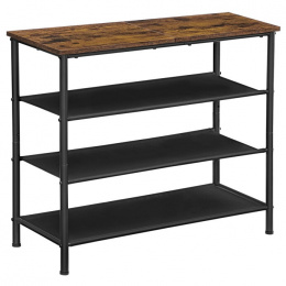 Botník v rustikálním stylu kombinuje desku z MDF s dekorem old wood v hnědém odstínu a pevnou kovovou konstrukci v inkoustově černé barvě. Nabízí tři prostorné police potažené polyesterovou tkaninou, které poskytují dostatek místa pro uložení obuvi i dalších drobných předmětů. Kovové nohy jsou opatřeny plastovými kluzáky, které chrání podlahu před poškozením a zajišťují stabilitu. Kompaktní rozměry 75 × 30 × 71 cm umožňují snadné umístění do předsíně či chodby, kde botník efektivně využívá prostor a zároveň přispívá k příjemné atmosféře díky rustikálnímu vzhledu.