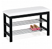 Praktický botník s taburetem kombinuje černě lakované masivní dřevo kaučukovníku s bílým potahem z ekokůže, který nabízí pohodlné sezení při obouvání. Dvě chromované police poskytují dostatek místa pro uložení obuvi, přičemž jejich kovové provedení zajišťuje pevnost a snadnou údržbu. Kompaktní rozměry a jednoduchý design umožňují snadné začlenění do předsíní i menších prostor. Stabilní rám z masivu zaručuje dlouhou životnost a odolnost vůči každodennímu používání. Tento botník je ideálním řešením pro organizaci obuvi s přidaným komfortem sedací plochy.