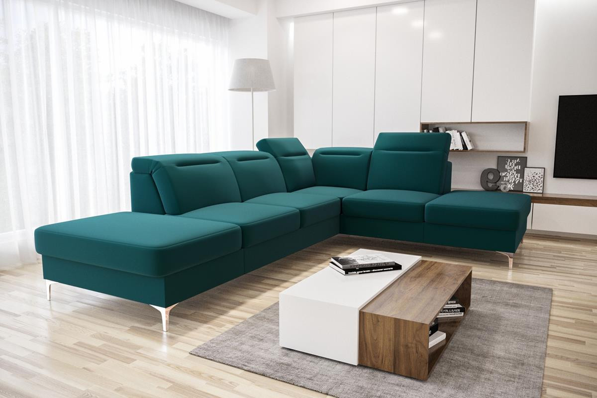 Rohová sedačka má nastavitelné, vícestupňové opěrky hlavy, chromované ozdobné nožky, sedáky s ozdobným prošíváním a především je vyrobena na vlnitých pružinách a vysoce elastické pěně, což zajišťuje vysoký komfort používání a zabraňuje deformaci nejčastěji používaných ploch. POZOR!!! Na aranžmá je zobrazen rohový gauč bez funkce spaní.
