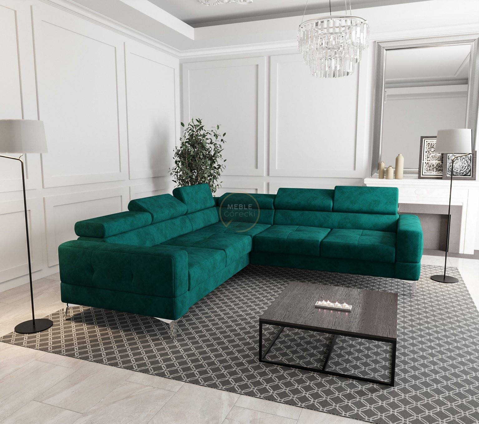 Rohové sedací soupravy mají funkci spaní a úložný prostor na ložní prádlo. Regulovatelné, vícestupňové opěrky hlavy umožňují přizpůsobení individuální poloze těla. Vysoké chromované nožky o výšce 13 cm dodávají štíhlost a podtrhují originální styl nábytku. Sedáky s ozdobným prošíváním, vyrobené na vlnitých pružinách a vysoce elastické pěně, což zajišťuje vysoký komfort používání a zabraňuje deformaci nejčastěji používaných ploch. POZOR!!! Na aranžmá je zobrazen rohový gauč bez funkce spaní.