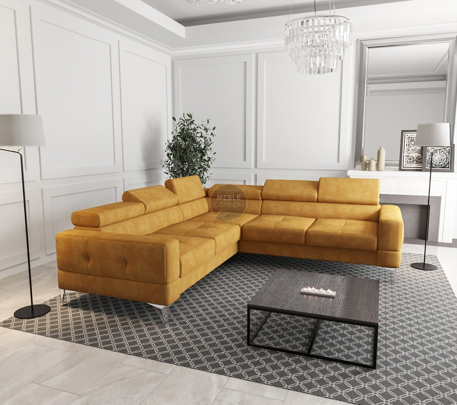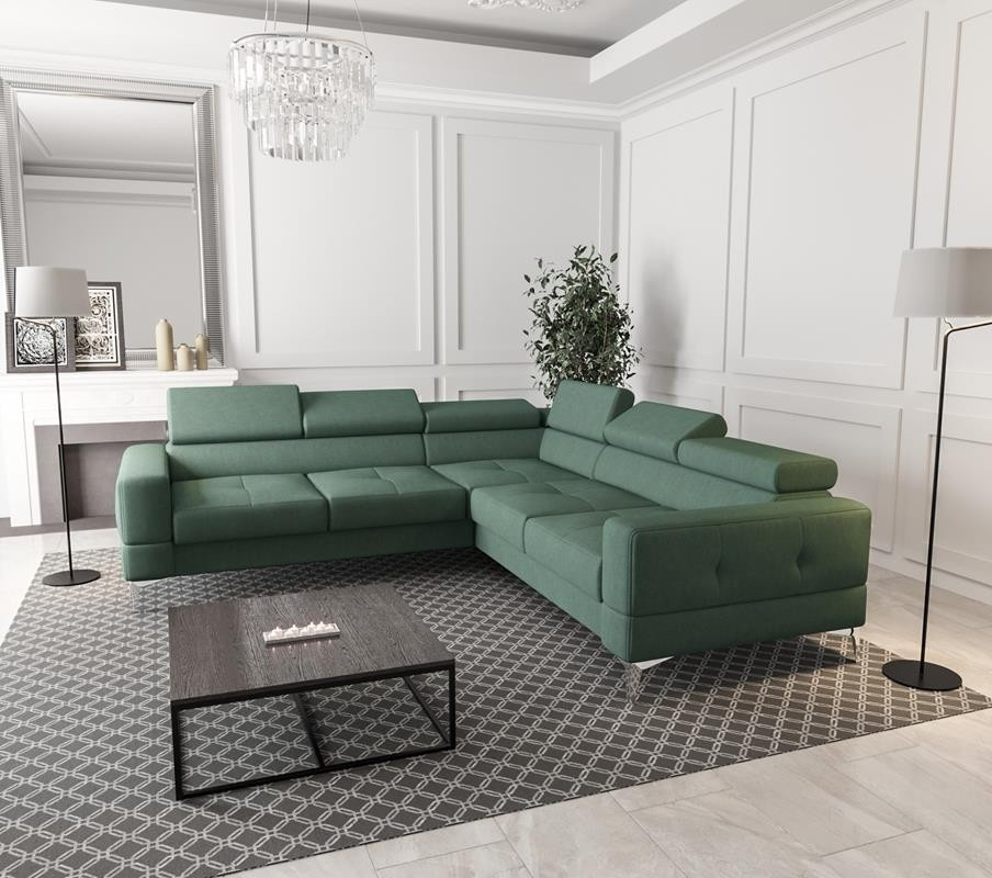 Rohové sedací soupravy mají funkci spaní a úložný prostor na ložní prádlo. Regulovatelné, vícestupňové opěrky hlavy umožňují přizpůsobení individuální poloze těla. Vysoké chromované nožky o výšce 13 cm dodávají štíhlost a podtrhují originální styl nábytku. Sedáky s ozdobným prošíváním, vyrobené na vlnitých pružinách a vysoce elastické pěně, což zajišťuje vysoký komfort používání a zabraňuje deformaci nejčastěji používaných ploch. POZOR!!! Na aranžmá je zobrazen rohový gauč bez funkce spaní.