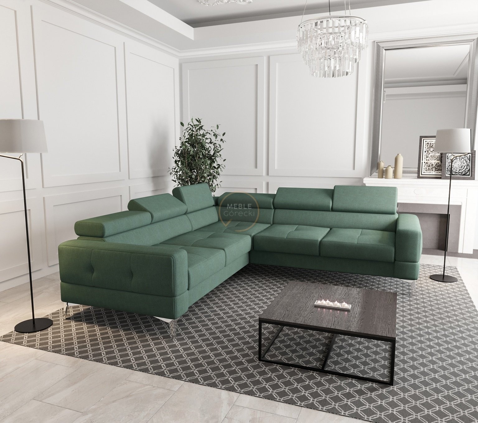 Rohové sedací soupravy mají funkci spaní a úložný prostor na ložní prádlo. Regulovatelné, vícestupňové opěrky hlavy umožňují přizpůsobení individuální poloze těla. Vysoké chromované nožky o výšce 13 cm dodávají štíhlost a podtrhují originální styl nábytku. Sedáky s ozdobným prošíváním, vyrobené na vlnitých pružinách a vysoce elastické pěně, což zajišťuje vysoký komfort používání a zabraňuje deformaci nejčastěji používaných ploch. POZOR!!! Na aranžmá je zobrazen rohový gauč bez funkce spaní.