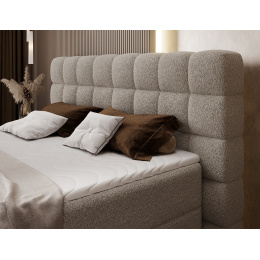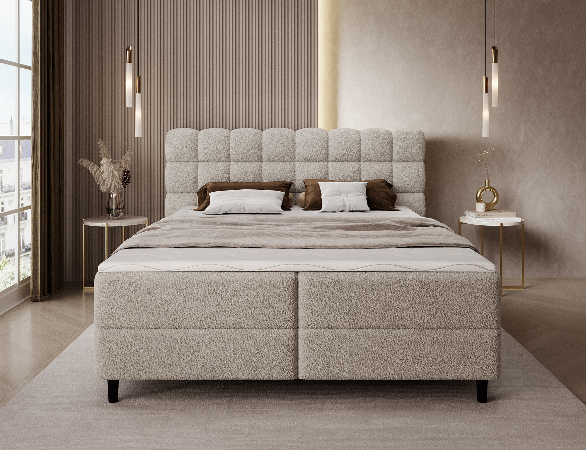 Kontinentální postel Camma kombinuje moderní design, funkčnost a vynikající spací komfort, což z ní činí ideální volbu pro elegantní a praktickou ložnici; je dostupná ve třech velikostech – 140x200 cm, 160x200 cm a 180x200 cm – a dokonale se přizpůsobí jak prostoru, tak individuálním potřebám, zatímco její pevná konstrukce s celkovou výškou 102 cm a výškou sedu 56 cm zajišťuje každodenní pohodlí; postel má hloubku 222 cm a šířka závisí na zvoleném modelu – 162 cm, 182 cm nebo 202 cm – což jí dodává stabilní a impozantní vzhled, který přidává luxusní nádech každému interiéru; čalouněná vysoce kvalitní látkou s jemným dotykem a stylově prošívaným čelem, kombinuje moderní eleganci s pohodlnou oporou pro čtení nebo relaxaci; praktický úložný box poskytuje prostor pro ložní prádlo a pomáhá udržovat ložnici uklizenou, což činí postel Camma nejen pohodlnou, ale také vysoce funkční; design je doplněn 10 cm černými dřevěnými nohami, které přidávají vizuální lehkost a usnadňují úklid pod postelí; model Camma je ideální volbou pro ty, kteří si cení moderního stylu, elegance, odolnosti a pohodlí, zajišťujícího zdravý a klidný spánek každou noc.