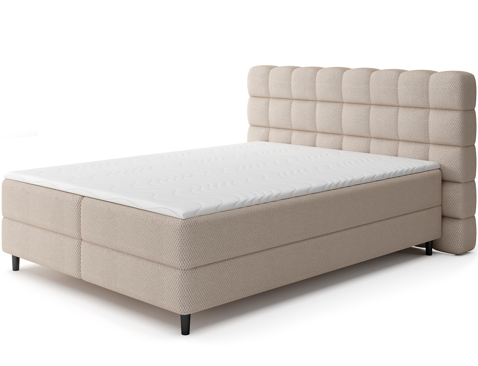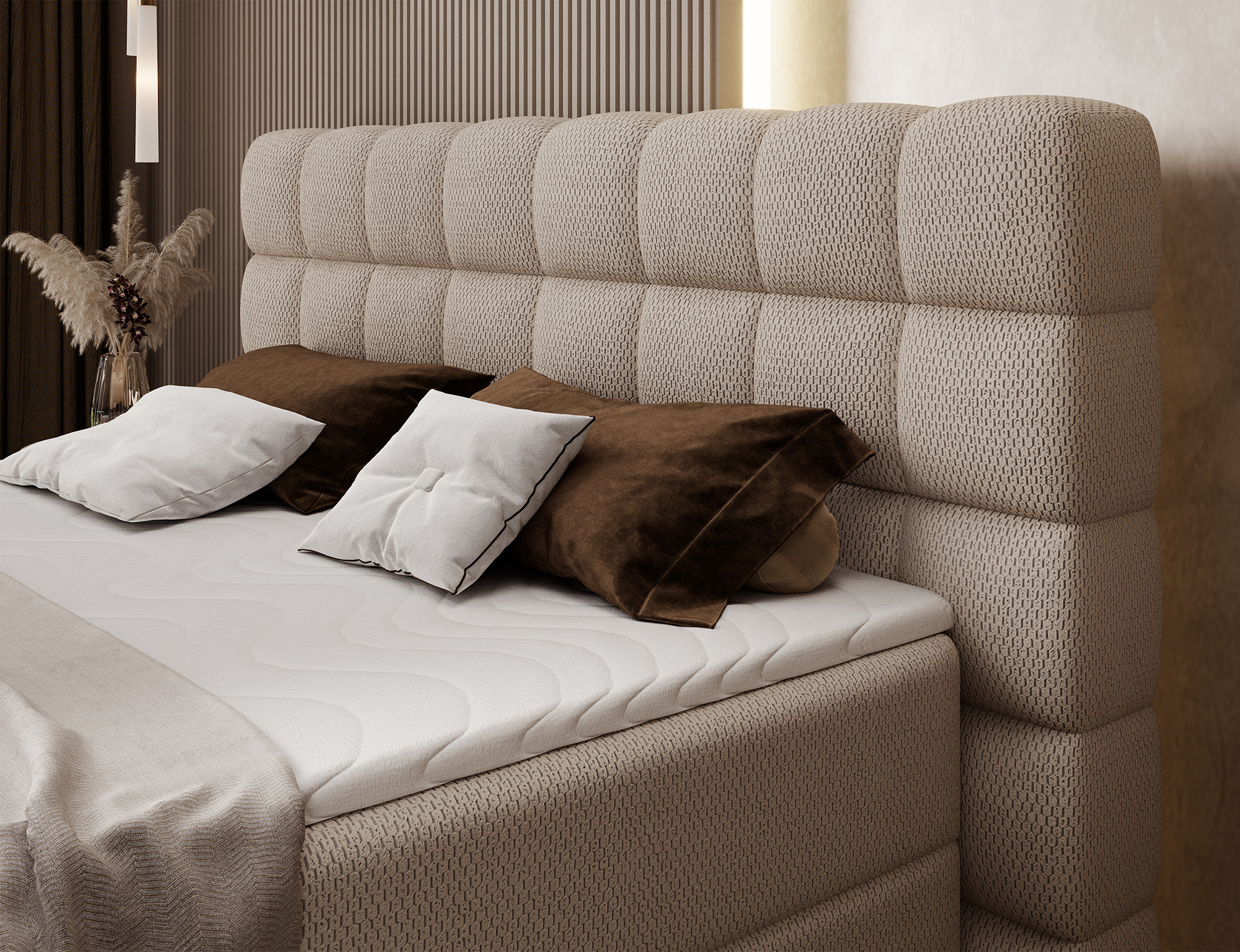 Kontinentální postel Camma kombinuje moderní design, funkčnost a vynikající spací komfort, což z ní činí ideální volbu pro elegantní a praktickou ložnici; je dostupná ve třech velikostech – 140x200 cm, 160x200 cm a 180x200 cm – a dokonale se přizpůsobí jak prostoru, tak individuálním potřebám, zatímco její pevná konstrukce s celkovou výškou 102 cm a výškou sedu 56 cm zajišťuje každodenní pohodlí; postel má hloubku 222 cm a šířka závisí na zvoleném modelu – 162 cm, 182 cm nebo 202 cm – což jí dodává stabilní a impozantní vzhled, který přidává luxusní nádech každému interiéru; čalouněná vysoce kvalitní látkou s jemným dotykem a stylově prošívaným čelem, kombinuje moderní eleganci s pohodlnou oporou pro čtení nebo relaxaci; praktický úložný box poskytuje prostor pro ložní prádlo a pomáhá udržovat ložnici uklizenou, což činí postel Camma nejen pohodlnou, ale také vysoce funkční; design je doplněn 10 cm černými dřevěnými nohami, které přidávají vizuální lehkost a usnadňují úklid pod postelí; model Camma je ideální volbou pro ty, kteří si cení moderního stylu, elegance, odolnosti a pohodlí, zajišťujícího zdravý a klidný spánek každou noc.