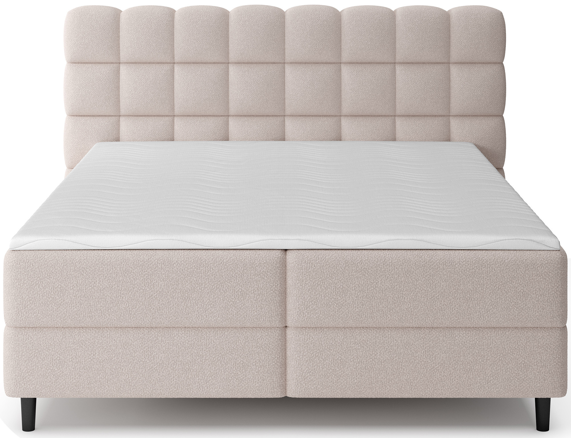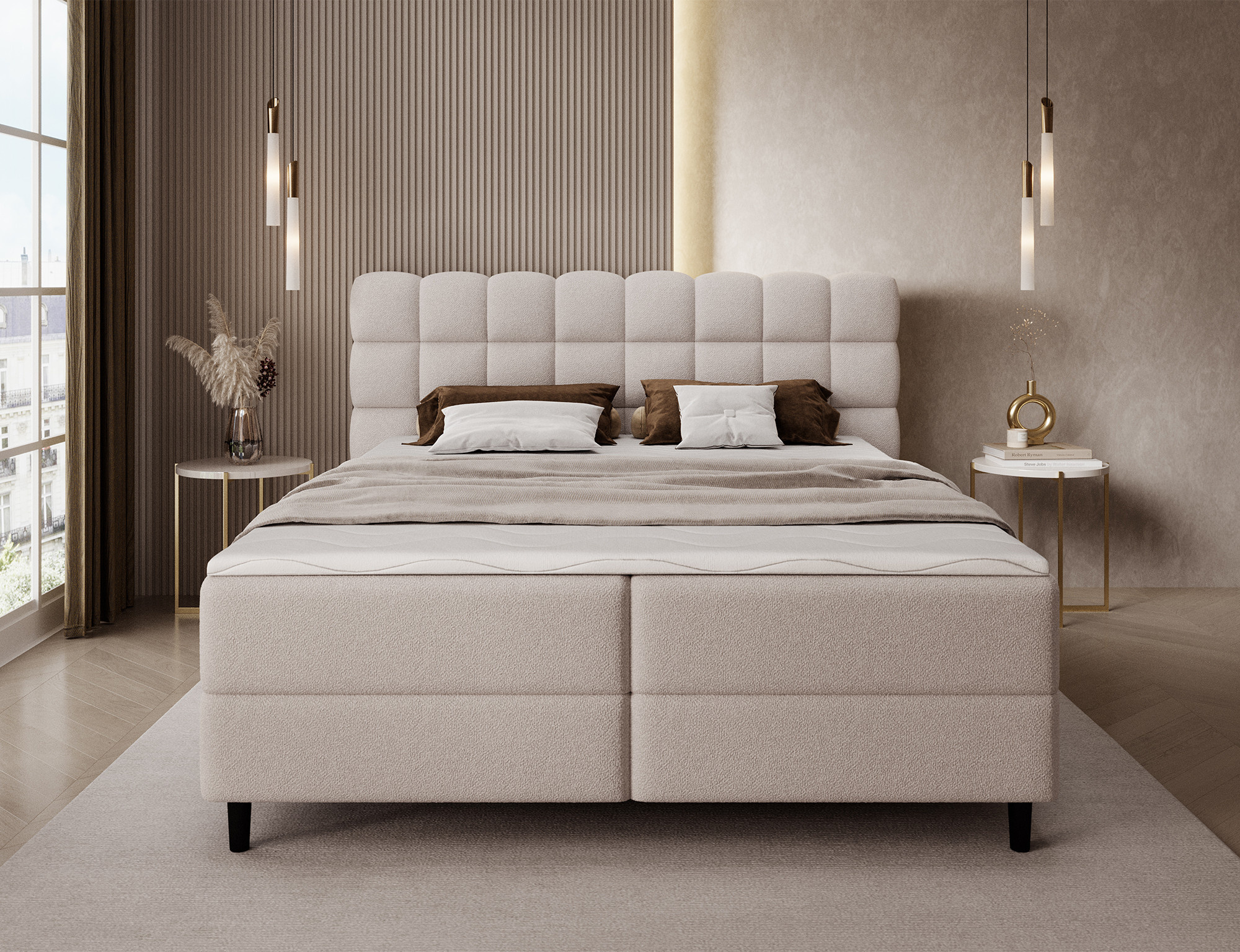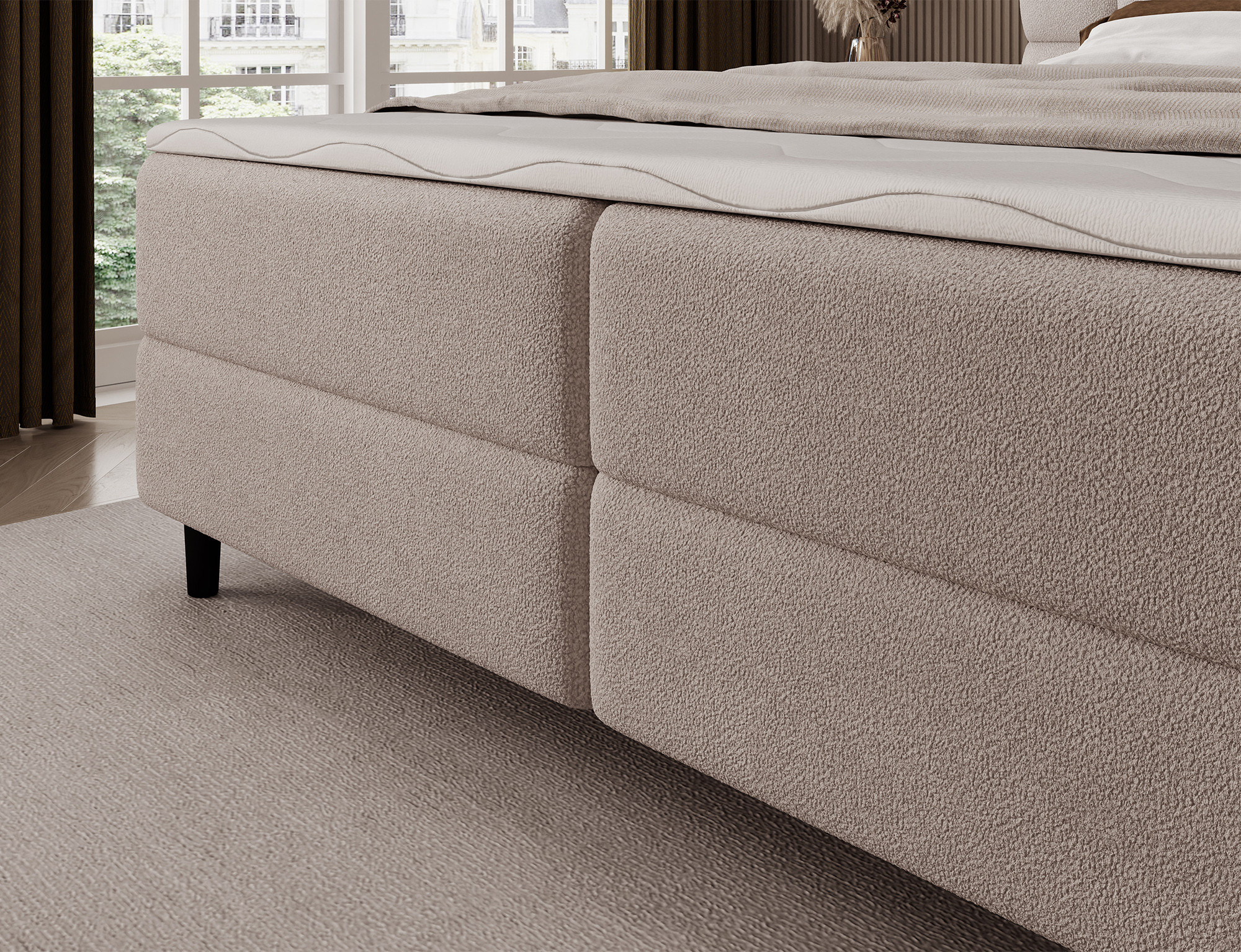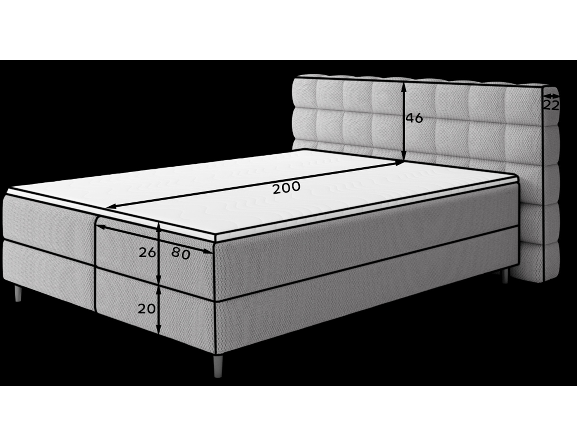 Kontinentální postel Camma kombinuje moderní design, funkčnost a vynikající spací komfort, což z ní činí ideální volbu pro elegantní a praktickou ložnici; je dostupná ve třech velikostech – 140x200 cm, 160x200 cm a 180x200 cm – a dokonale se přizpůsobí jak prostoru, tak individuálním potřebám, zatímco její pevná konstrukce s celkovou výškou 102 cm a výškou sedu 56 cm zajišťuje každodenní pohodlí; postel má hloubku 222 cm a šířka závisí na zvoleném modelu – 162 cm, 182 cm nebo 202 cm – což jí dodává stabilní a impozantní vzhled, který přidává luxusní nádech každému interiéru; čalouněná vysoce kvalitní látkou s jemným dotykem a stylově prošívaným čelem, kombinuje moderní eleganci s pohodlnou oporou pro čtení nebo relaxaci; praktický úložný box poskytuje prostor pro ložní prádlo a pomáhá udržovat ložnici uklizenou, což činí postel Camma nejen pohodlnou, ale také vysoce funkční; design je doplněn 10 cm černými dřevěnými nohami, které přidávají vizuální lehkost a usnadňují úklid pod postelí; model Camma je ideální volbou pro ty, kteří si cení moderního stylu, elegance, odolnosti a pohodlí, zajišťujícího zdravý a klidný spánek každou noc.