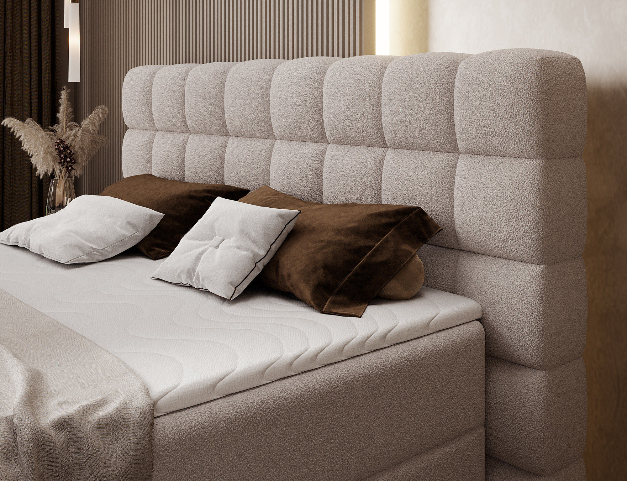 Kontinentální postel Camma kombinuje moderní design, funkčnost a vynikající spací komfort, což z ní činí ideální volbu pro elegantní a praktickou ložnici; je dostupná ve třech velikostech – 140x200 cm, 160x200 cm a 180x200 cm – a dokonale se přizpůsobí jak prostoru, tak individuálním potřebám, zatímco její pevná konstrukce s celkovou výškou 102 cm a výškou sedu 56 cm zajišťuje každodenní pohodlí; postel má hloubku 222 cm a šířka závisí na zvoleném modelu – 162 cm, 182 cm nebo 202 cm – což jí dodává stabilní a impozantní vzhled, který přidává luxusní nádech každému interiéru; čalouněná vysoce kvalitní látkou s jemným dotykem a stylově prošívaným čelem, kombinuje moderní eleganci s pohodlnou oporou pro čtení nebo relaxaci; praktický úložný box poskytuje prostor pro ložní prádlo a pomáhá udržovat ložnici uklizenou, což činí postel Camma nejen pohodlnou, ale také vysoce funkční; design je doplněn 10 cm černými dřevěnými nohami, které přidávají vizuální lehkost a usnadňují úklid pod postelí; model Camma je ideální volbou pro ty, kteří si cení moderního stylu, elegance, odolnosti a pohodlí, zajišťujícího zdravý a klidný spánek každou noc.