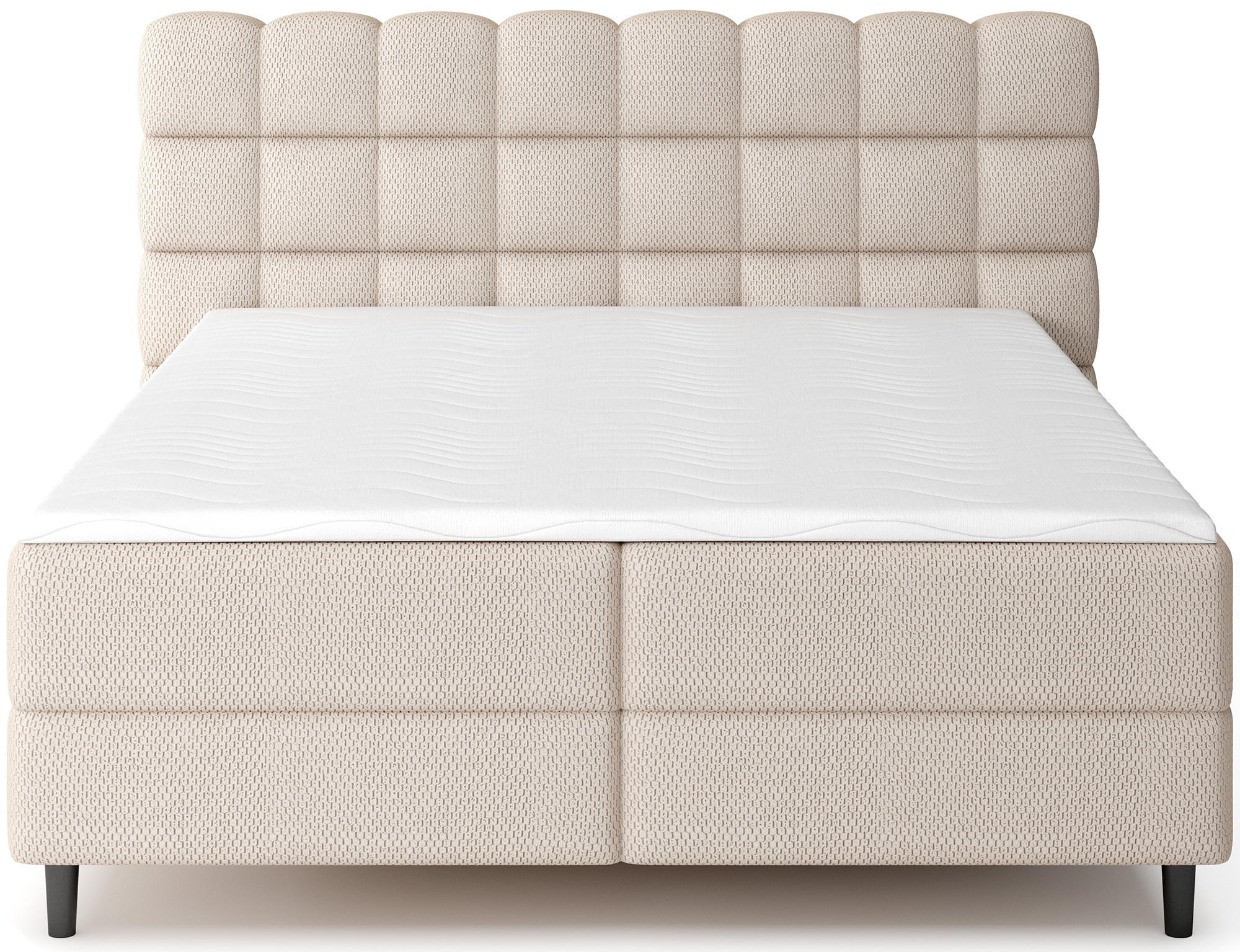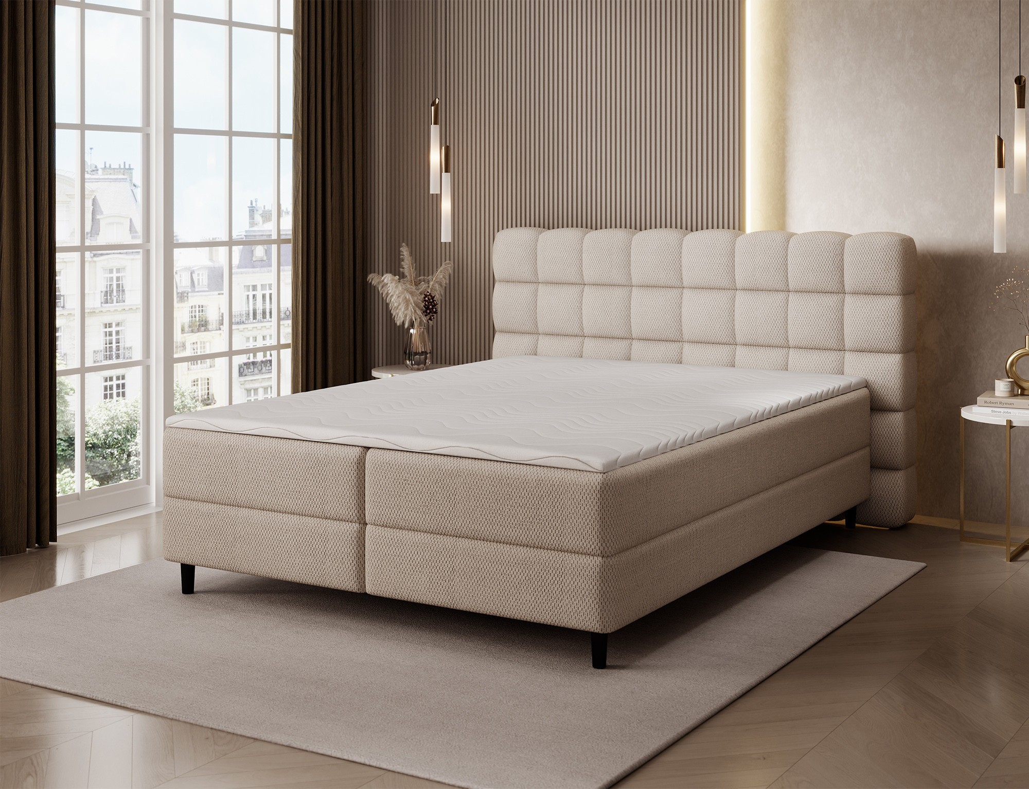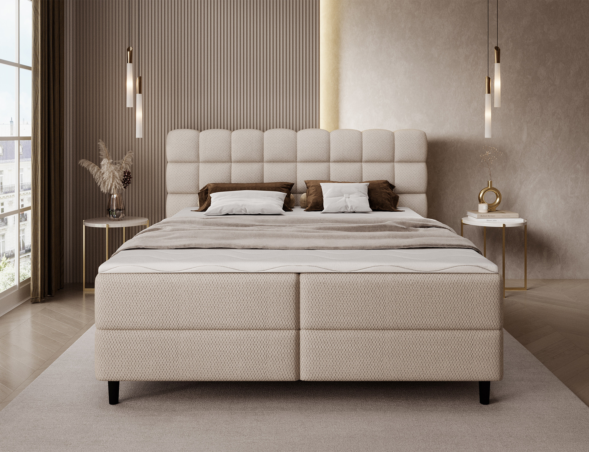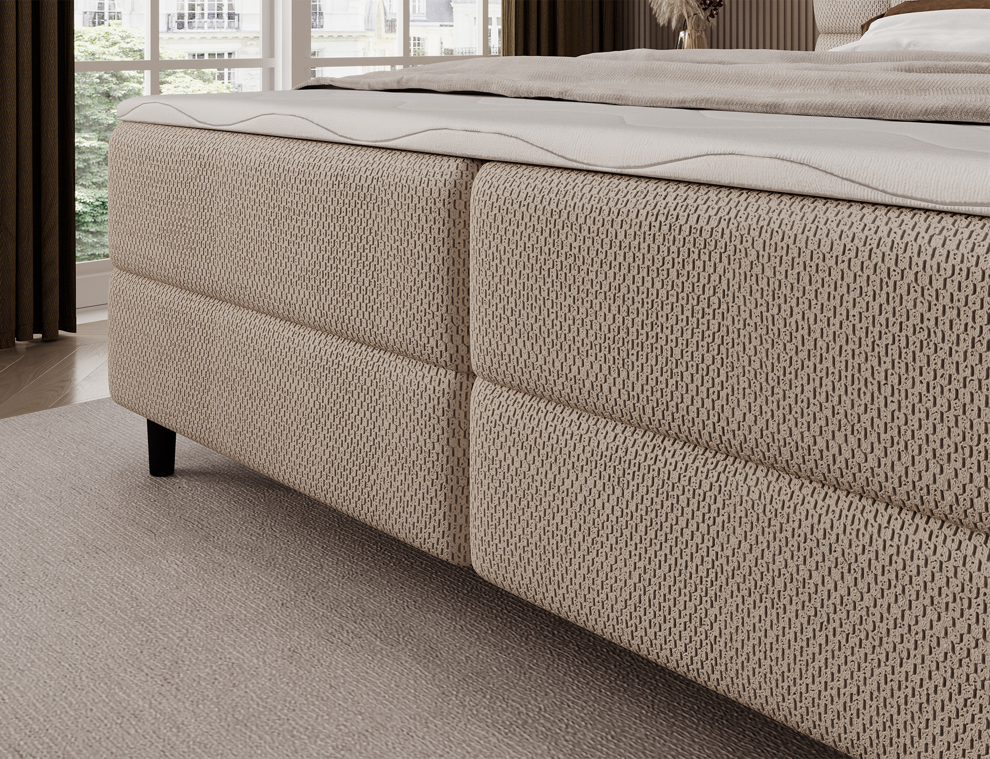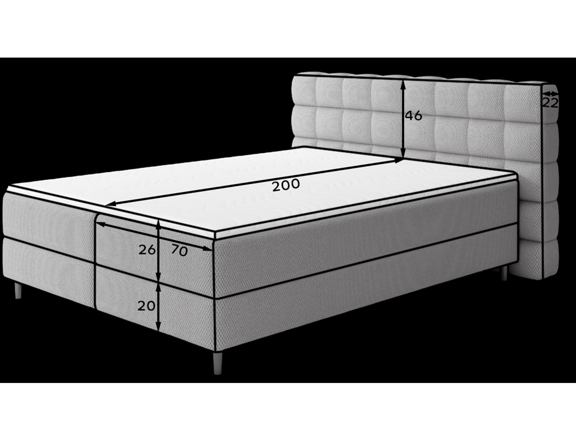Kontinentální postel Camma kombinuje moderní design, funkčnost a vynikající spací komfort, což z ní činí ideální volbu pro elegantní a praktickou ložnici; je dostupná ve třech velikostech – 140x200 cm, 160x200 cm a 180x200 cm – a dokonale se přizpůsobí jak prostoru, tak individuálním potřebám, zatímco její pevná konstrukce s celkovou výškou 102 cm a výškou sedu 56 cm zajišťuje každodenní pohodlí; postel má hloubku 222 cm a šířka závisí na zvoleném modelu – 162 cm, 182 cm nebo 202 cm – což jí dodává stabilní a impozantní vzhled, který přidává luxusní nádech každému interiéru; čalouněná vysoce kvalitní látkou s jemným dotykem a stylově prošívaným čelem, kombinuje moderní eleganci s pohodlnou oporou pro čtení nebo relaxaci; praktický úložný box poskytuje prostor pro ložní prádlo a pomáhá udržovat ložnici uklizenou, což činí postel Camma nejen pohodlnou, ale také vysoce funkční; design je doplněn 10 cm černými dřevěnými nohami, které přidávají vizuální lehkost a usnadňují úklid pod postelí; model Camma je ideální volbou pro ty, kteří si cení moderního stylu, elegance, odolnosti a pohodlí, zajišťujícího zdravý a klidný spánek každou noc.