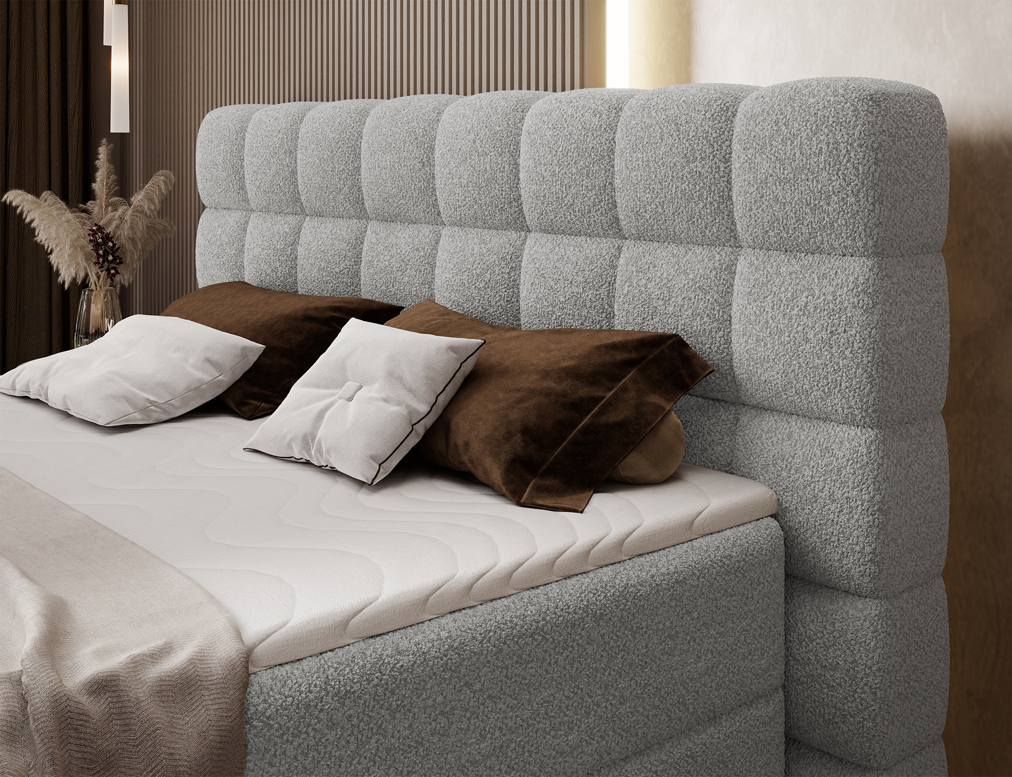 Kontinentální postel Camma kombinuje moderní design, funkčnost a vynikající spací komfort, což z ní činí ideální volbu pro elegantní a praktickou ložnici; je dostupná ve třech velikostech – 140x200 cm, 160x200 cm a 180x200 cm – a dokonale se přizpůsobí jak prostoru, tak individuálním potřebám, zatímco její pevná konstrukce s celkovou výškou 102 cm a výškou sedu 56 cm zajišťuje každodenní pohodlí; postel má hloubku 222 cm a šířka závisí na zvoleném modelu – 162 cm, 182 cm nebo 202 cm – což jí dodává stabilní a impozantní vzhled, který přidává luxusní nádech každému interiéru; čalouněná vysoce kvalitní látkou s jemným dotykem a stylově prošívaným čelem, kombinuje moderní eleganci s pohodlnou oporou pro čtení nebo relaxaci; praktický úložný box poskytuje prostor pro ložní prádlo a pomáhá udržovat ložnici uklizenou, což činí postel Camma nejen pohodlnou, ale také vysoce funkční; design je doplněn 10 cm černými dřevěnými nohami, které přidávají vizuální lehkost a usnadňují úklid pod postelí; model Camma je ideální volbou pro ty, kteří si cení moderního stylu, elegance, odolnosti a pohodlí, zajišťujícího zdravý a klidný spánek každou noc.