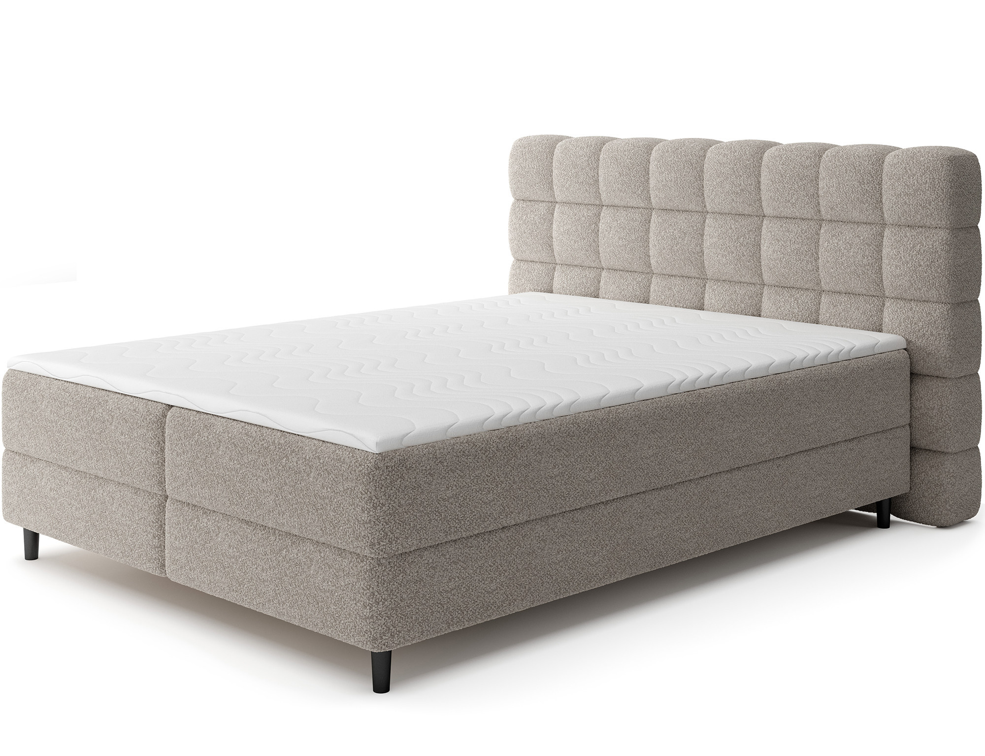 Kontinentální postel Camma kombinuje moderní design, funkčnost a vynikající spací komfort, což z ní činí ideální volbu pro elegantní a praktickou ložnici; je dostupná ve třech velikostech – 140x200 cm, 160x200 cm a 180x200 cm – a dokonale se přizpůsobí jak prostoru, tak individuálním potřebám, zatímco její pevná konstrukce s celkovou výškou 102 cm a výškou sedu 56 cm zajišťuje každodenní pohodlí; postel má hloubku 222 cm a šířka závisí na zvoleném modelu – 162 cm, 182 cm nebo 202 cm – což jí dodává stabilní a impozantní vzhled, který přidává luxusní nádech každému interiéru; čalouněná vysoce kvalitní látkou s jemným dotykem a stylově prošívaným čelem, kombinuje moderní eleganci s pohodlnou oporou pro čtení nebo relaxaci; praktický úložný box poskytuje prostor pro ložní prádlo a pomáhá udržovat ložnici uklizenou, což činí postel Camma nejen pohodlnou, ale také vysoce funkční; design je doplněn 10 cm černými dřevěnými nohami, které přidávají vizuální lehkost a usnadňují úklid pod postelí; model Camma je ideální volbou pro ty, kteří si cení moderního stylu, elegance, odolnosti a pohodlí, zajišťujícího zdravý a klidný spánek každou noc.