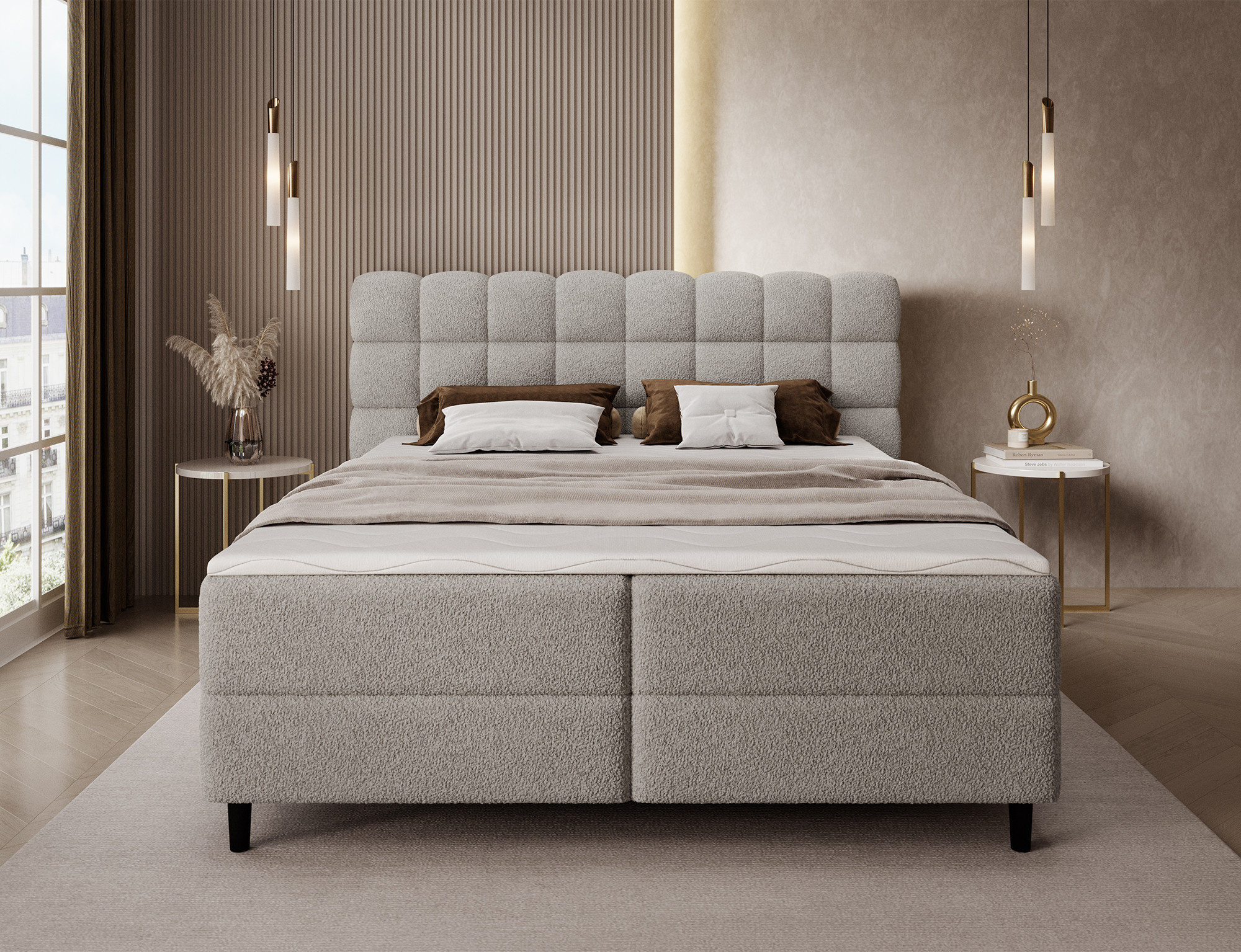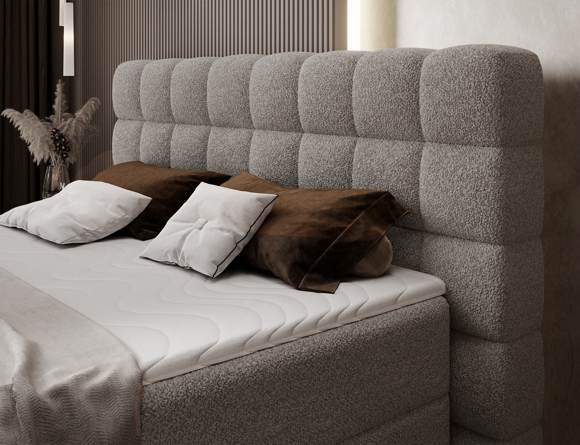 Kontinentální postel Camma kombinuje moderní design, funkčnost a vynikající spací komfort, což z ní činí ideální volbu pro elegantní a praktickou ložnici; je dostupná ve třech velikostech – 140x200 cm, 160x200 cm a 180x200 cm – a dokonale se přizpůsobí jak prostoru, tak individuálním potřebám, zatímco její pevná konstrukce s celkovou výškou 102 cm a výškou sedu 56 cm zajišťuje každodenní pohodlí; postel má hloubku 222 cm a šířka závisí na zvoleném modelu – 162 cm, 182 cm nebo 202 cm – což jí dodává stabilní a impozantní vzhled, který přidává luxusní nádech každému interiéru; čalouněná vysoce kvalitní látkou s jemným dotykem a stylově prošívaným čelem, kombinuje moderní eleganci s pohodlnou oporou pro čtení nebo relaxaci; praktický úložný box poskytuje prostor pro ložní prádlo a pomáhá udržovat ložnici uklizenou, což činí postel Camma nejen pohodlnou, ale také vysoce funkční; design je doplněn 10 cm černými dřevěnými nohami, které přidávají vizuální lehkost a usnadňují úklid pod postelí; model Camma je ideální volbou pro ty, kteří si cení moderního stylu, elegance, odolnosti a pohodlí, zajišťujícího zdravý a klidný spánek každou noc.
