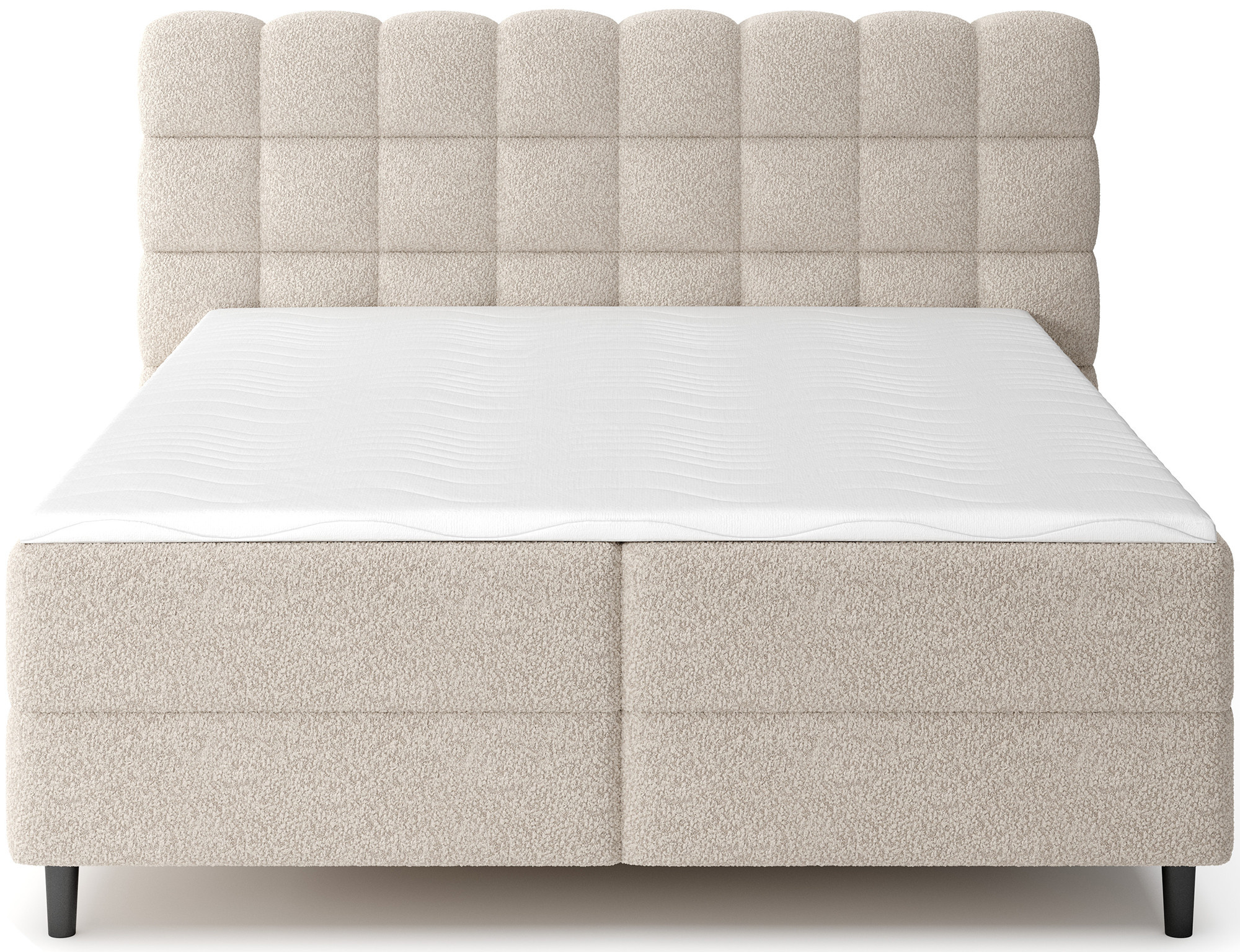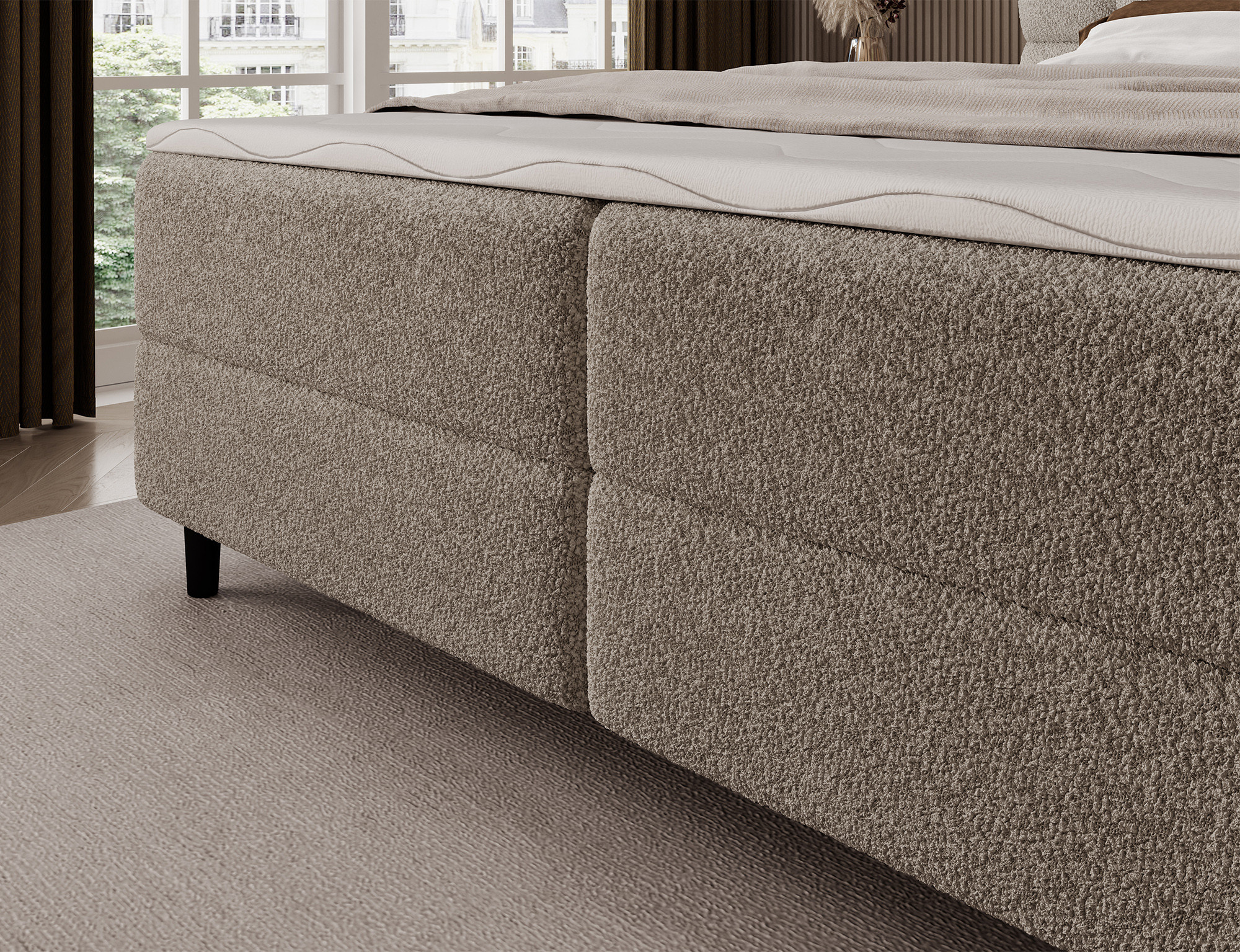 Kontinentální postel Camma kombinuje moderní design, funkčnost a vynikající spací komfort, což z ní činí ideální volbu pro elegantní a praktickou ložnici; je dostupná ve třech velikostech – 140x200 cm, 160x200 cm a 180x200 cm – a dokonale se přizpůsobí jak prostoru, tak individuálním potřebám, zatímco její pevná konstrukce s celkovou výškou 102 cm a výškou sedu 56 cm zajišťuje každodenní pohodlí; postel má hloubku 222 cm a šířka závisí na zvoleném modelu – 162 cm, 182 cm nebo 202 cm – což jí dodává stabilní a impozantní vzhled, který přidává luxusní nádech každému interiéru; čalouněná vysoce kvalitní látkou s jemným dotykem a stylově prošívaným čelem, kombinuje moderní eleganci s pohodlnou oporou pro čtení nebo relaxaci; praktický úložný box poskytuje prostor pro ložní prádlo a pomáhá udržovat ložnici uklizenou, což činí postel Camma nejen pohodlnou, ale také vysoce funkční; design je doplněn 10 cm černými dřevěnými nohami, které přidávají vizuální lehkost a usnadňují úklid pod postelí; model Camma je ideální volbou pro ty, kteří si cení moderního stylu, elegance, odolnosti a pohodlí, zajišťujícího zdravý a klidný spánek každou noc.