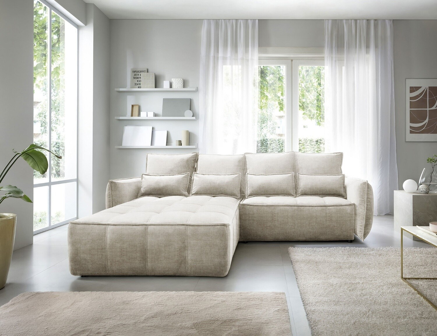 Rohová pohovka Campo, měřící 265x196x88 cm, je elegantní a funkční kus nábytku s úložným prostorem na ložní prádlo (97x60x15 cm). Vybaveno 4 polštáři na opěradlo a 4 bederními polštáři, poskytuje pohodlí a oporu pro záda. Produkt je dostupný pouze ve vybraných látkách z kolekce ELTAP. Rohová pohovka Campo je vynikající volbou pro ty, kteří si cení pohodlí, funkčnosti a elegantního designu. Díky svému promyšlenému designu a dalším polštářům nabízí pohodlné místo k odpočinku a úložný prostor pomáhá udržovat věci uspořádané. Možnost výběru z vybraných látek umožňuje vytvořit kus nábytku, který dokonale doplňuje zbytek interiéru.