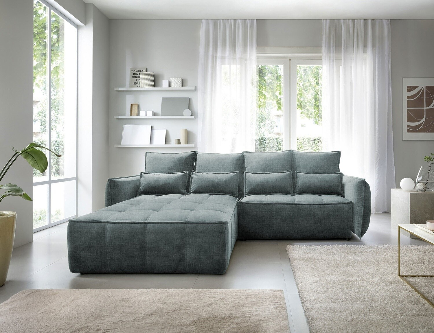 Rohová pohovka Campo, měřící 265x196x88 cm, je elegantní a funkční kus nábytku s úložným prostorem na ložní prádlo (97x60x15 cm). Vybaveno 4 polštáři na opěradlo a 4 bederními polštáři, poskytuje pohodlí a oporu pro záda. Produkt je dostupný pouze ve vybraných látkách z kolekce ELTAP. Rohová pohovka Campo je vynikající volbou pro ty, kteří si cení pohodlí, funkčnosti a elegantního designu. Díky svému promyšlenému designu a dalším polštářům nabízí pohodlné místo k odpočinku a úložný prostor pomáhá udržovat věci uspořádané. Možnost výběru z vybraných látek umožňuje vytvořit kus nábytku, který dokonale doplňuje zbytek interiéru.