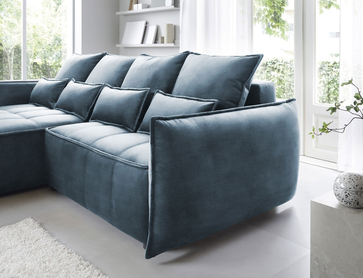 Rohová pohovka Campo, měřící 265x196x88 cm, je elegantní a funkční kus nábytku s úložným prostorem na ložní prádlo (97x60x15 cm). Vybaveno 4 polštáři na opěradlo a 4 bederními polštáři, poskytuje pohodlí a oporu pro záda. Produkt je dostupný pouze ve vybraných látkách z kolekce ELTAP. Rohová pohovka Campo je vynikající volbou pro ty, kteří si cení pohodlí, funkčnosti a elegantního designu. Díky svému promyšlenému designu a dalším polštářům nabízí pohodlné místo k odpočinku a úložný prostor pomáhá udržovat věci uspořádané. Možnost výběru z vybraných látek umožňuje vytvořit kus nábytku, který dokonale doplňuje zbytek interiéru.