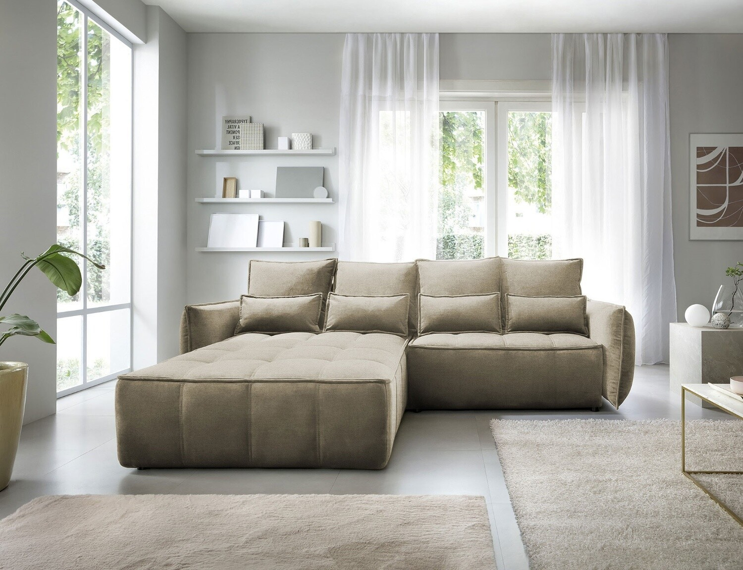 Rohová pohovka Campo, měřící 265x196x88 cm, je elegantní a funkční kus nábytku s úložným prostorem na ložní prádlo (97x60x15 cm). Vybaveno 4 polštáři na opěradlo a 4 bederními polštáři, poskytuje pohodlí a oporu pro záda. Produkt je dostupný pouze ve vybraných látkách z kolekce ELTAP. Rohová pohovka Campo je vynikající volbou pro ty, kteří si cení pohodlí, funkčnosti a elegantního designu. Díky svému promyšlenému designu a dalším polštářům nabízí pohodlné místo k odpočinku a úložný prostor pomáhá udržovat věci uspořádané. Možnost výběru z vybraných látek umožňuje vytvořit kus nábytku, který dokonale doplňuje zbytek interiéru.