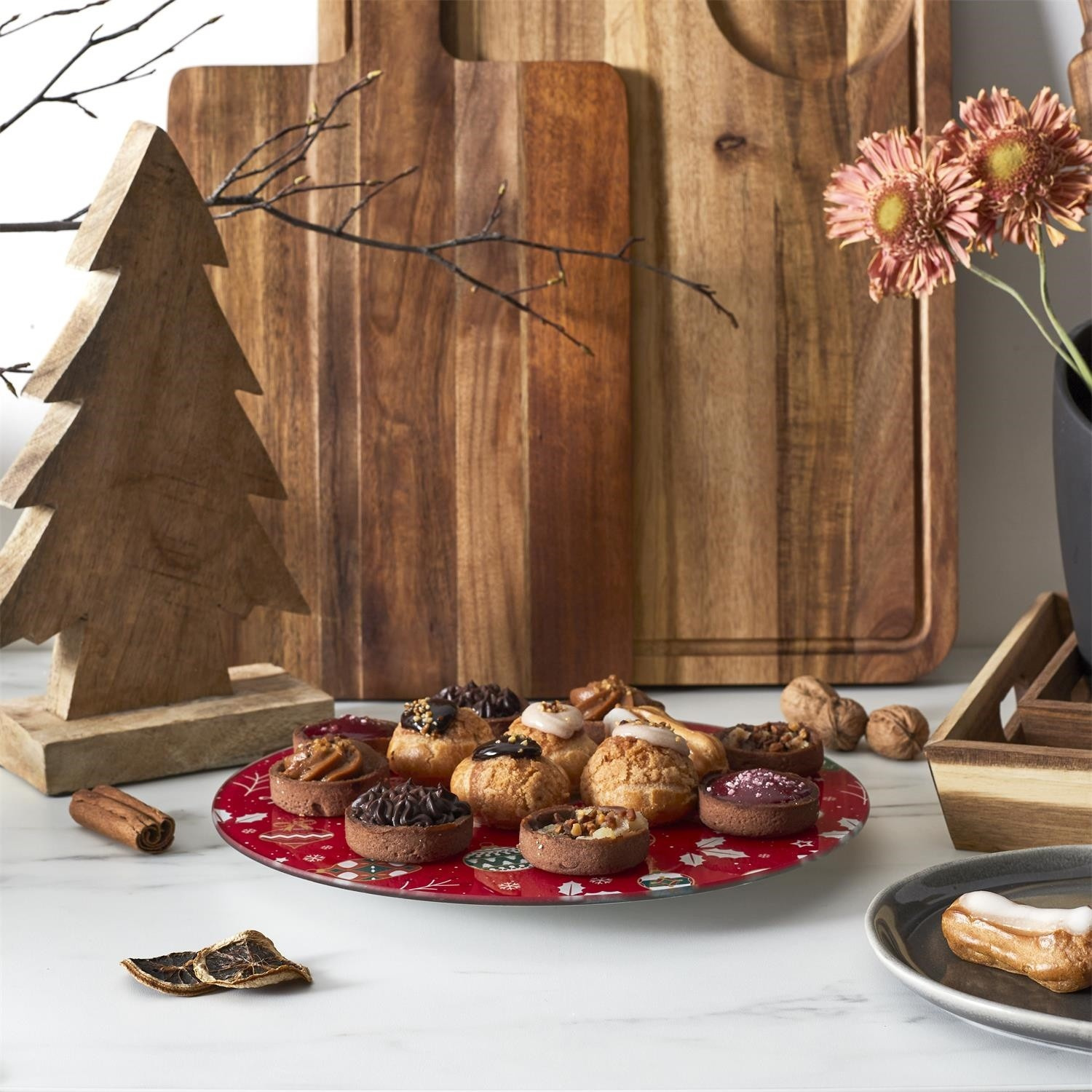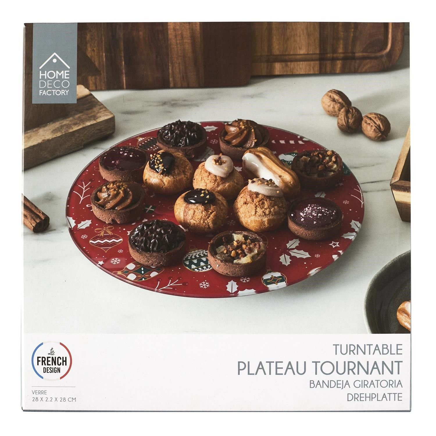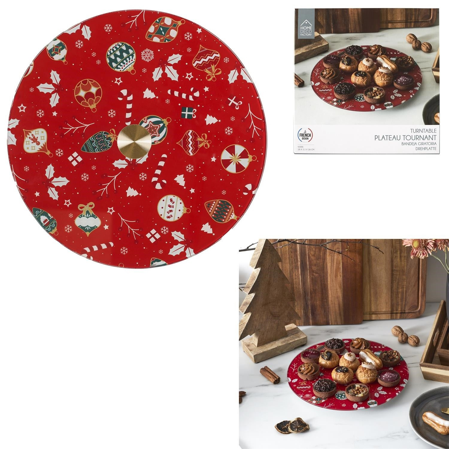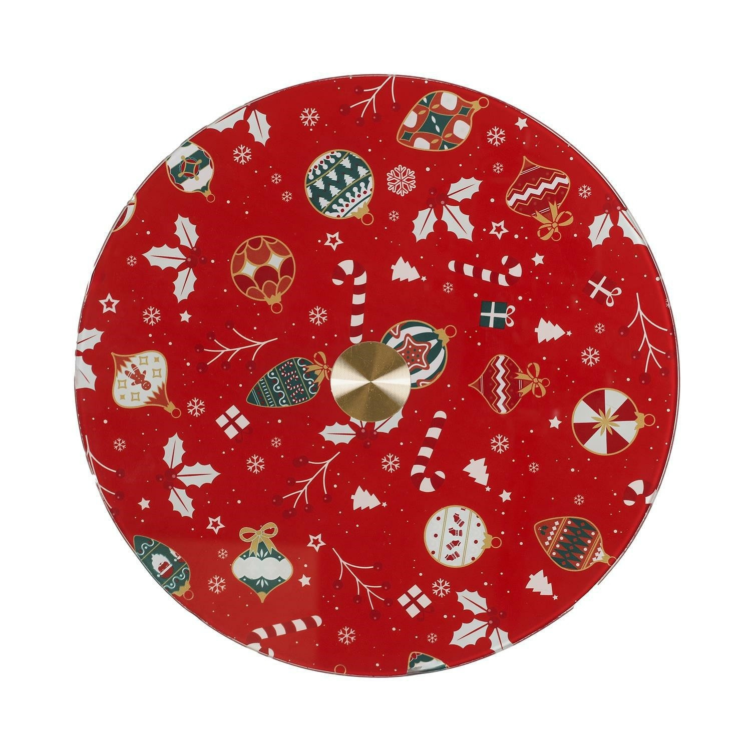 Otočná tác s vánočním motivem byla vyrobena ze skla s vánočním potiskem. Nožka podnosu z kovu je otočná, díky čemuž můžeme otáčet podnos a vybrat si pochoutky, které se na něm nacházejí. Tác je třeba mýt ručně, není vhodný do myčky, není vhodný do trouby ani do mikrovlnné trouby.