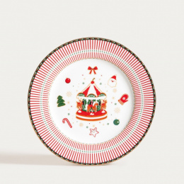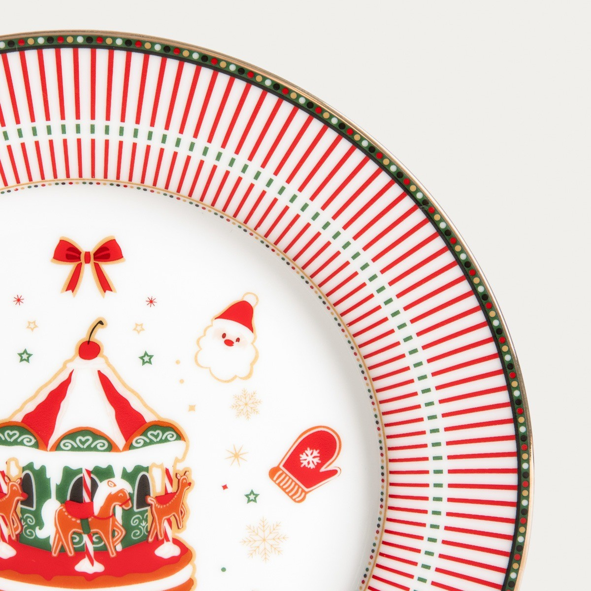 Dezertní talíř je ozdoben půvabným vánočním designem s cirkusovým motivem. Okraj talíře je zdoben elegantními pruhy. Celkové barevné schéma je červené a zelené, což je univerzální a nadčasová volba pro Vánoce. Bude se dokonale hodit k ostatním pokrmům a dekoracím na vašem vánočním stolním nádobí.