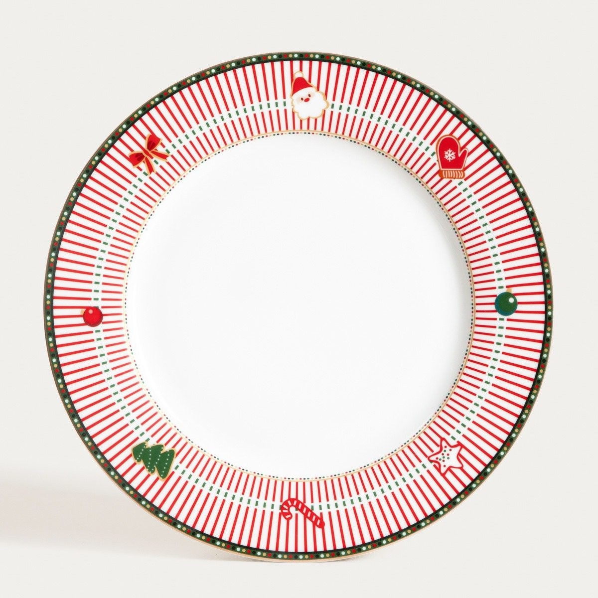 Porcelánový talíř má půvabný design s pruhy a oblíbenými vánočními motivy - najdete na něm vánoční stromeček, Santa Clause, cukrovou hůlku nebo baňky. Není to jen praktická nádoba na servírování jídla, ale také krásná dekorace na vašem stolním nádobí.