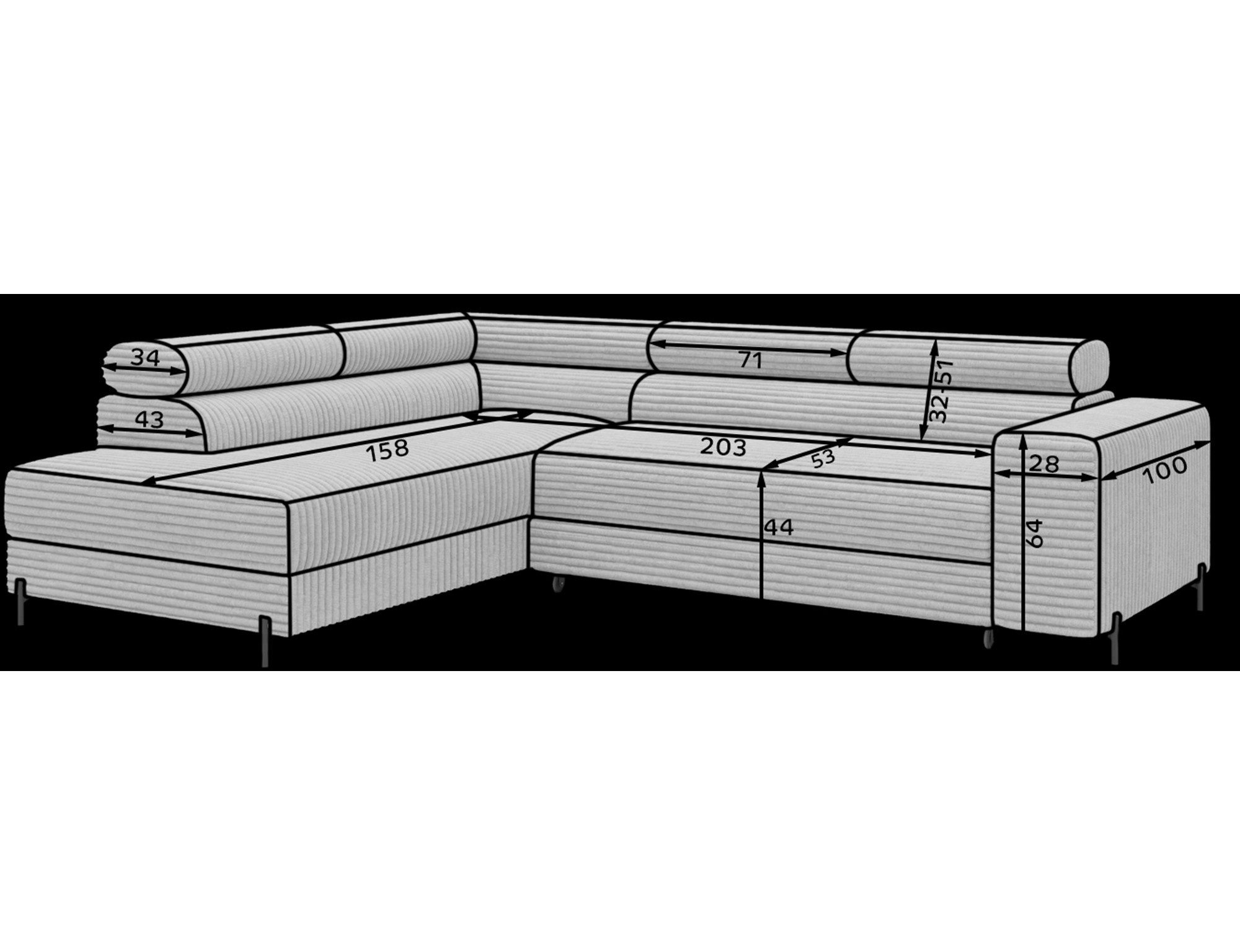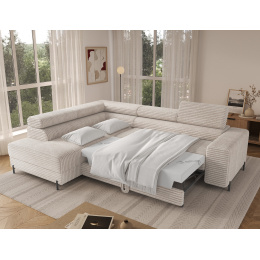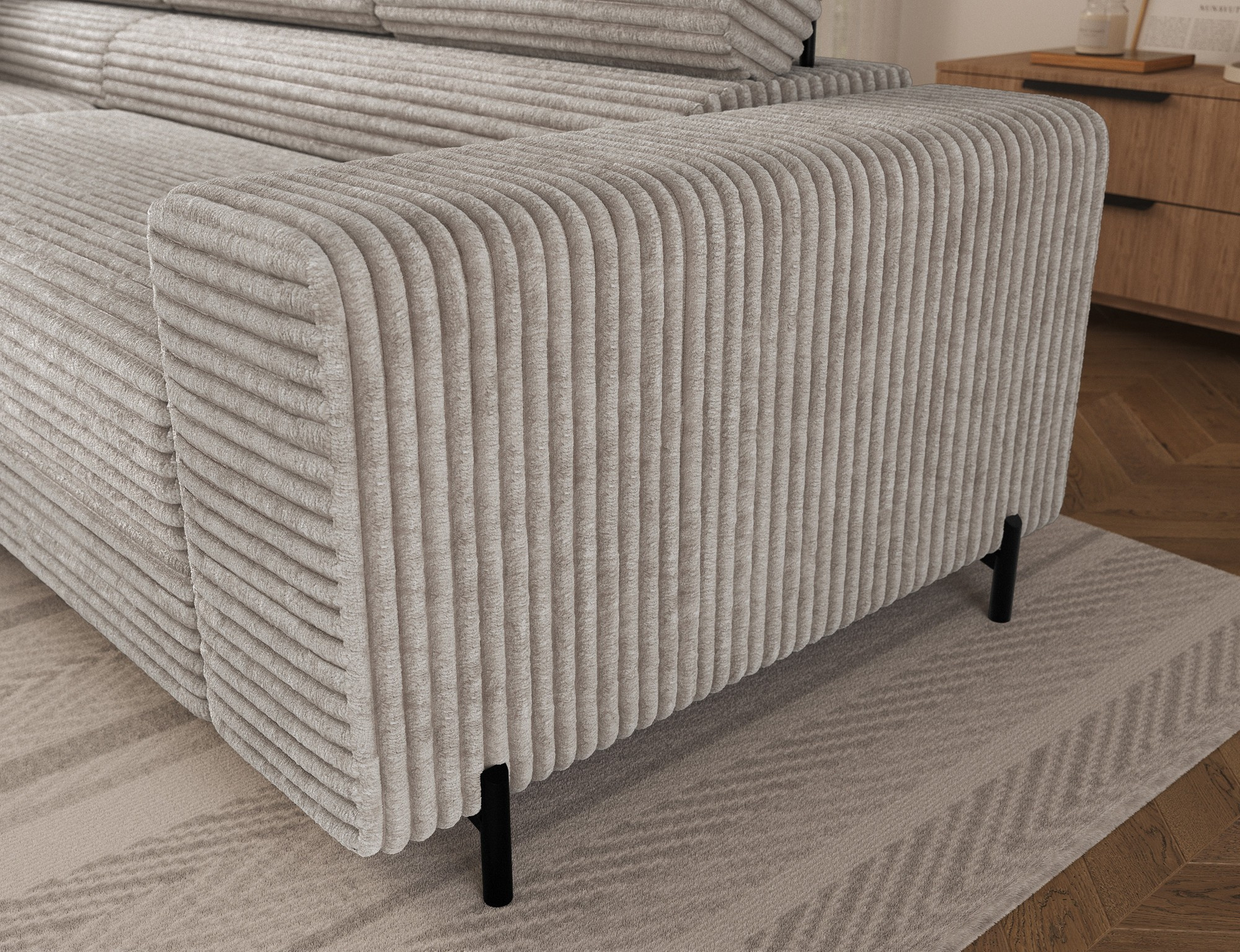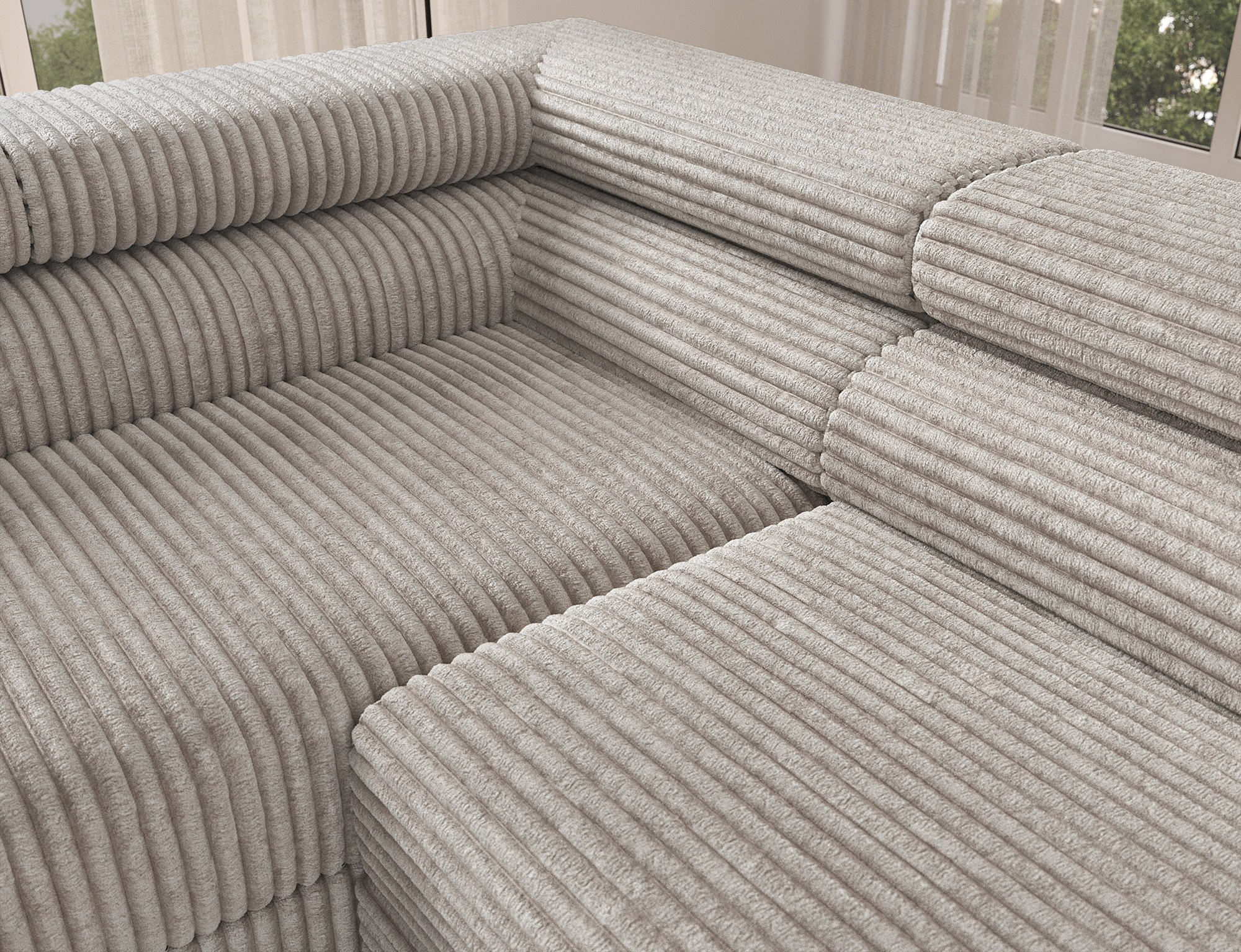 The Colesio corner sofa is a modern and elegant lounge piece with a distinctive, geometric form that perfectly combines design and functionality, making it an ideal addition to a spacious living room. The model, measuring 274 x 200 x 93 cm and weighing 144.5 kg, stands out with its solid construction and carefully refined details that ensure high comfort for everyday use. The seat is equipped with a B-type wave spring and a combination of T3030 foam (6 cm) and HR3030 foam (4 cm), guaranteeing optimal elasticity, resistance to deformation, and comfort even during intensive use. The backrest, filled with profiled T2130 polyurethane foam approximately 8 cm thick, provides stable and ergonomic back support. The Colesio corner sofa features a practical sleeping function with a surface of 124 x 203 cm, and the Delfin mechanism allows for quick and convenient unfolding. An additional advantage is the spacious bedding container measuring 180 × 92 × 17 cm, which facilitates textile storage, making the Colesio corner sofa an excellent choice for those seeking a modern corner sofa with a sleeping function, bedding storage, and durable, comfortable filling for everyday relaxation.