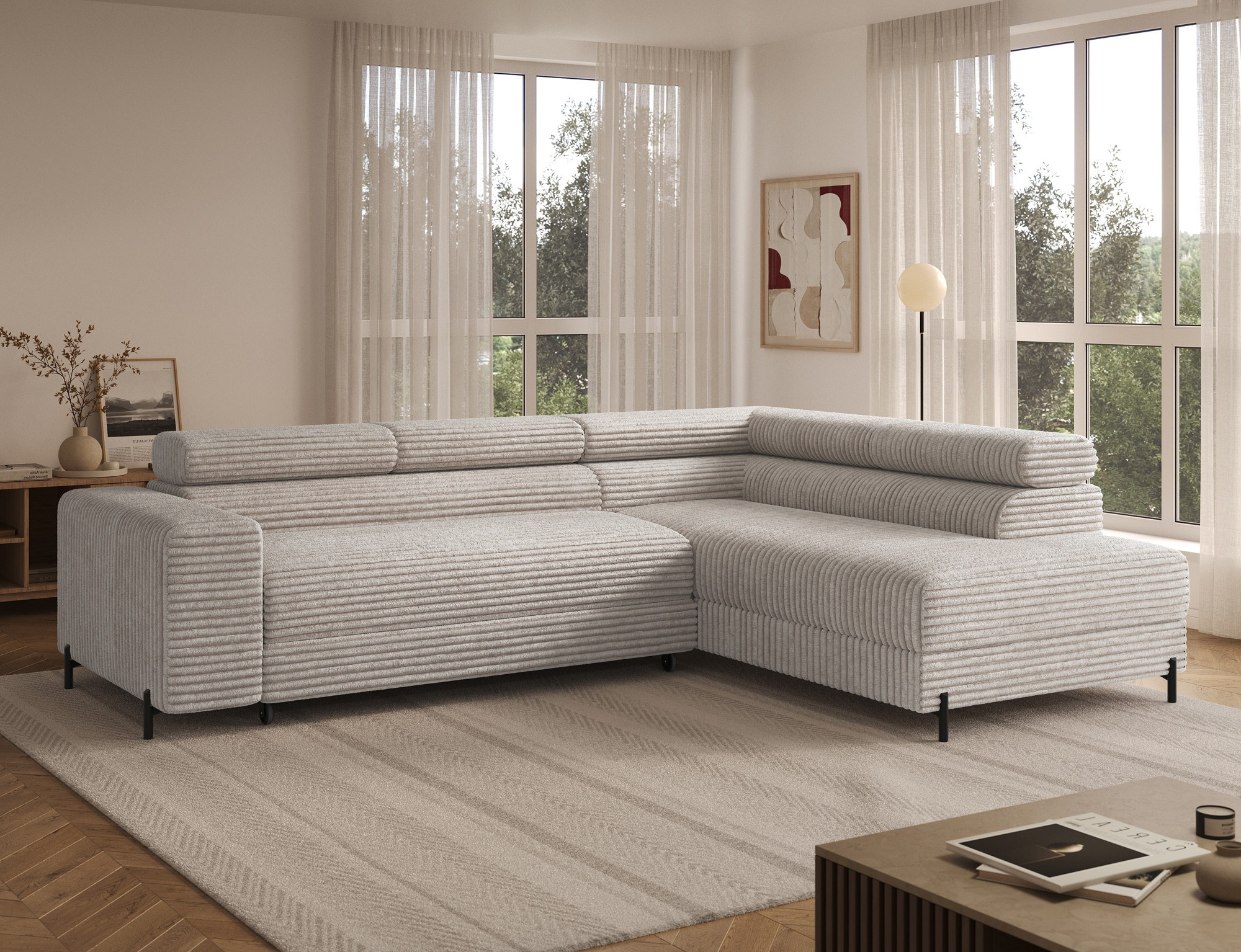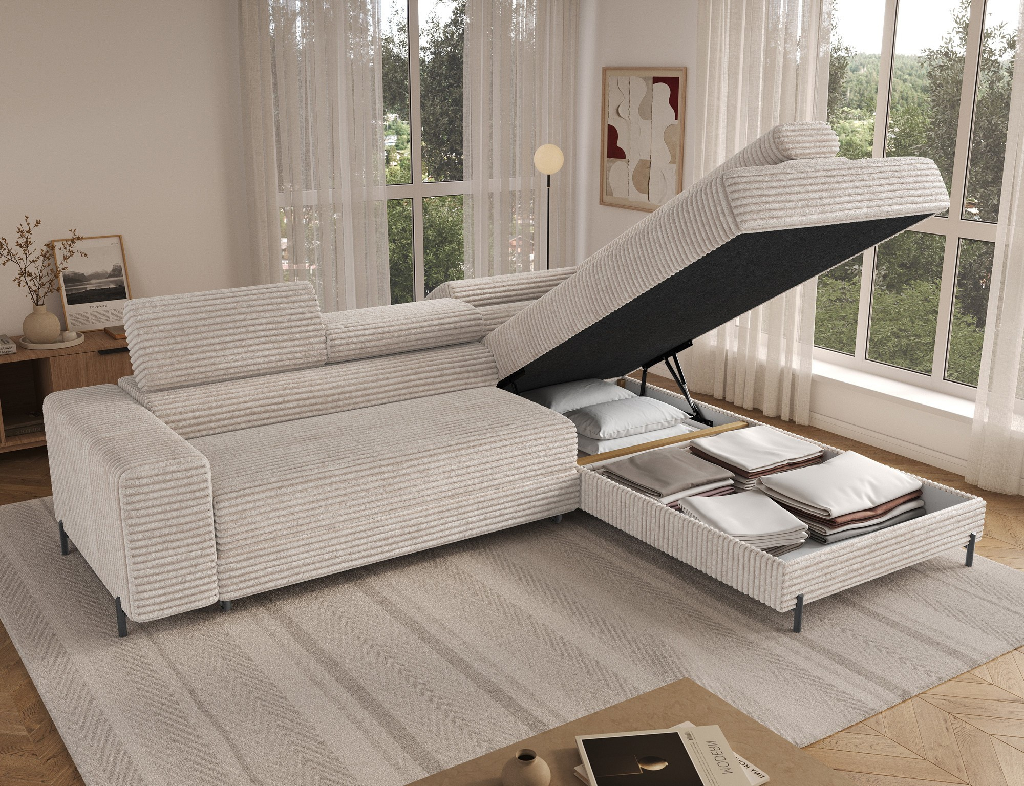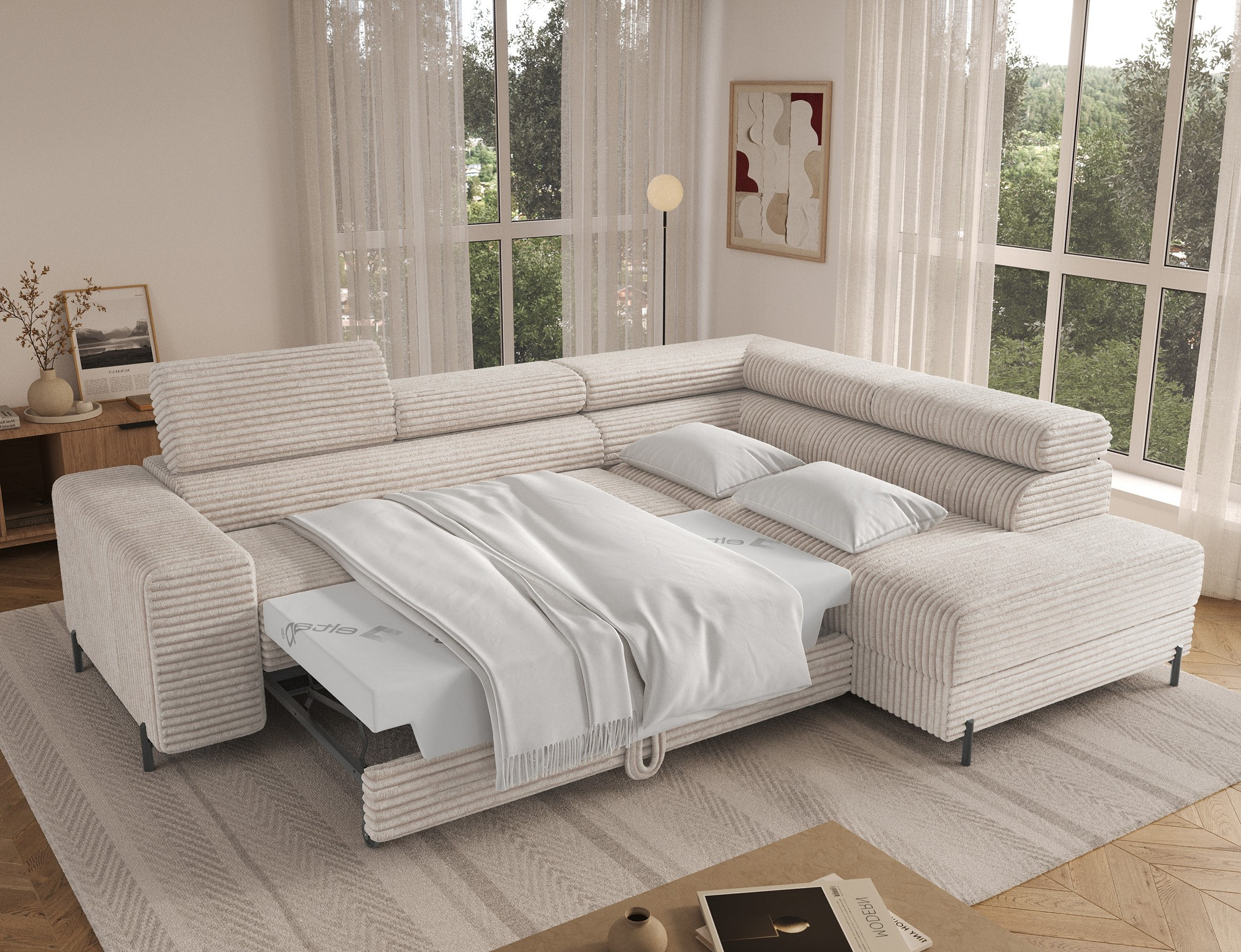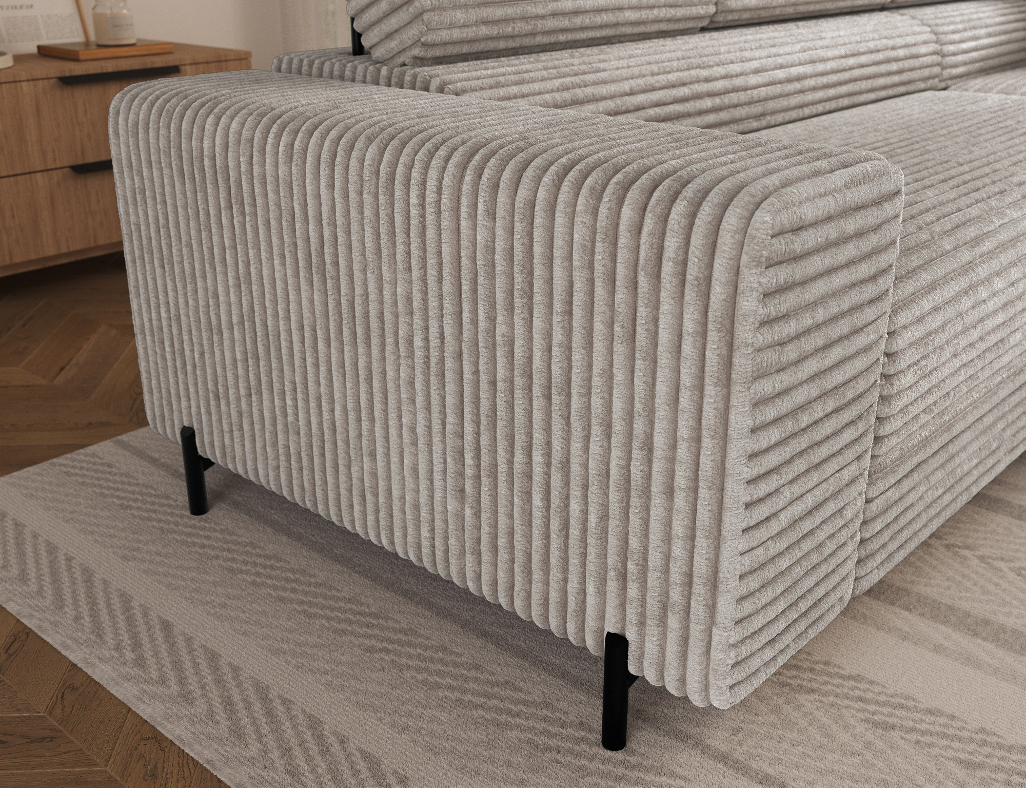 The Colesio corner sofa is a modern and elegant lounge piece with a distinctive, geometric form that perfectly combines design and functionality, making it an ideal addition to a spacious living room. The model, measuring 274 x 200 x 93 cm and weighing 144.5 kg, stands out with its solid construction and carefully refined details that ensure high comfort for everyday use. The seat is equipped with a B-type wave spring and a combination of T3030 foam (6 cm) and HR3030 foam (4 cm), guaranteeing optimal elasticity, resistance to deformation, and comfort even during intensive use. The backrest, filled with profiled T2130 polyurethane foam approximately 8 cm thick, provides stable and ergonomic back support. The Colesio corner sofa features a practical sleeping function with a surface of 124 x 203 cm, and the Delfin mechanism allows for quick and convenient unfolding. An additional advantage is the spacious bedding container measuring 180 × 92 × 17 cm, which facilitates textile storage, making the Colesio corner sofa an excellent choice for those seeking a modern corner sofa with a sleeping function, bedding storage, and durable, comfortable filling for everyday relaxation.