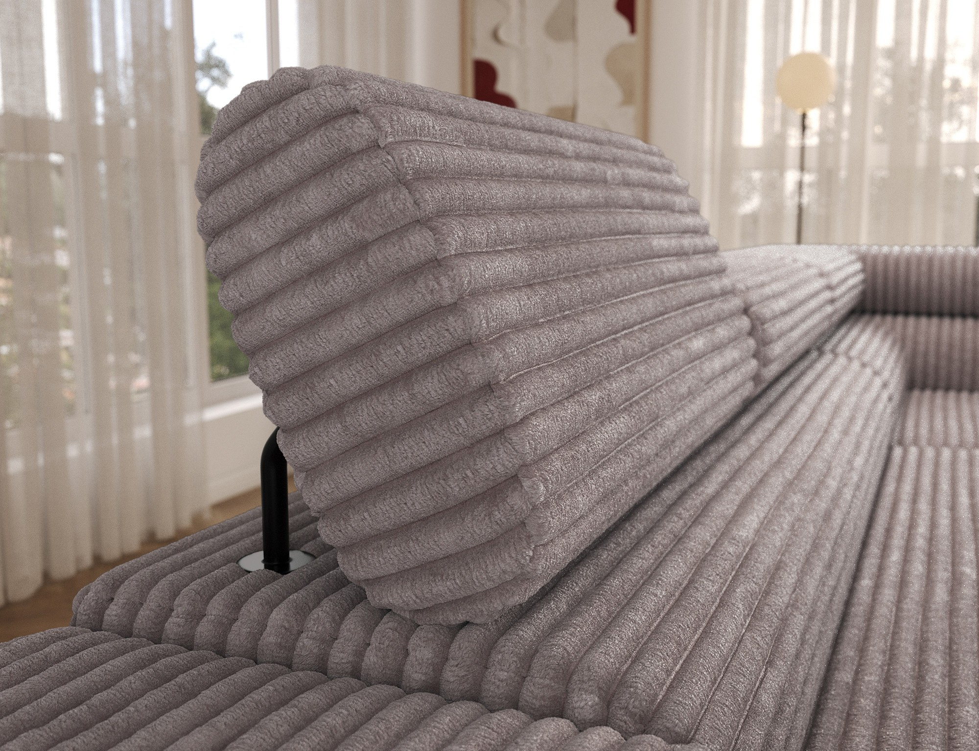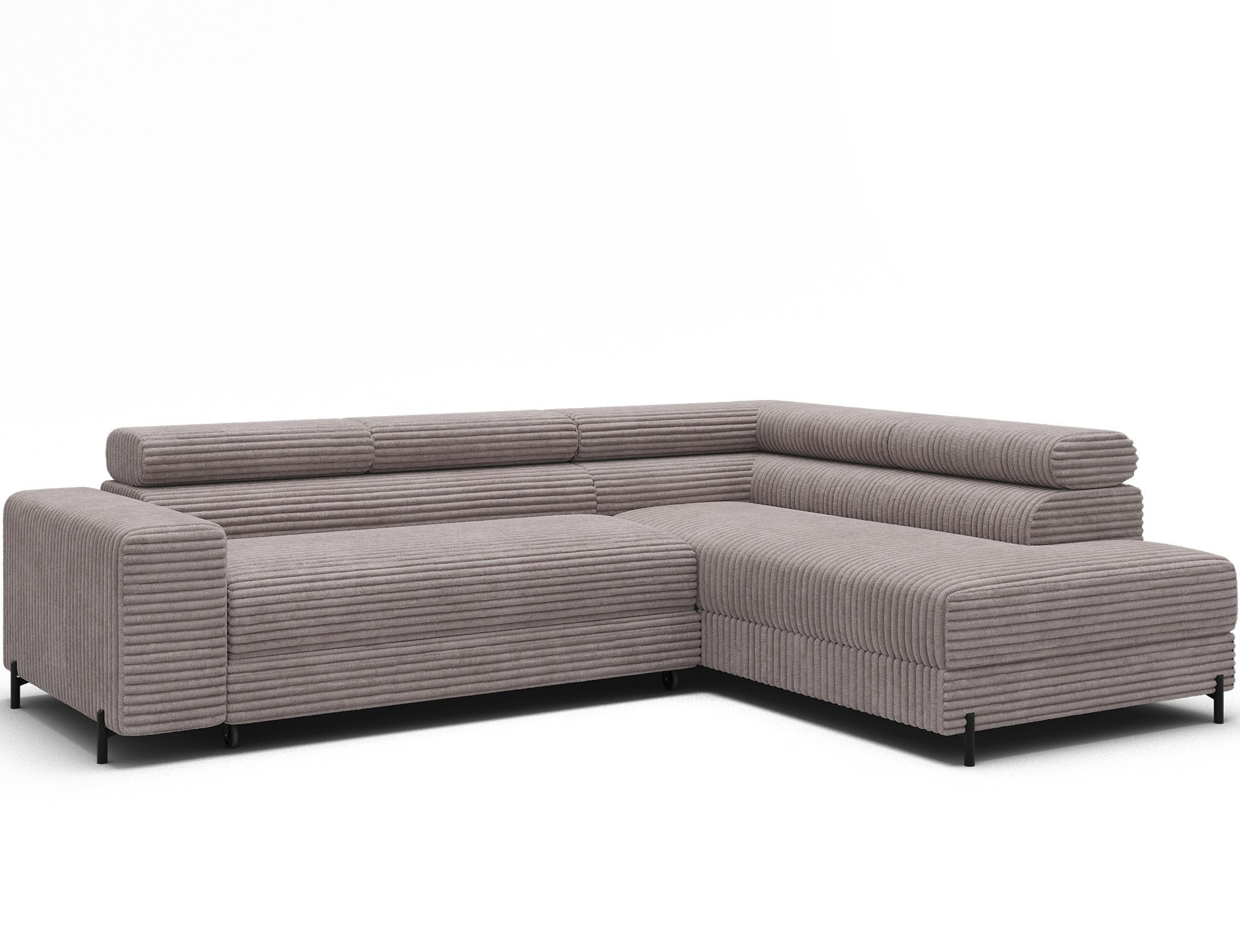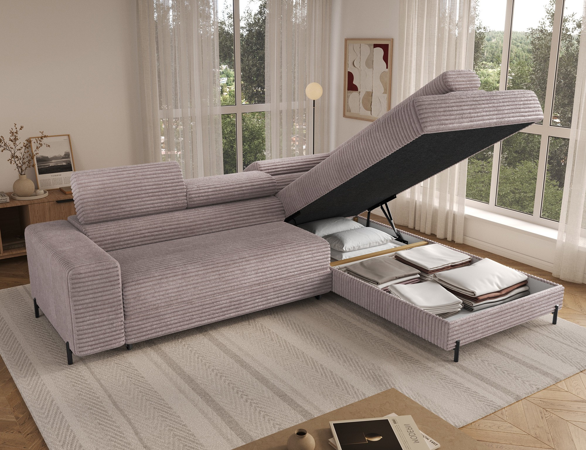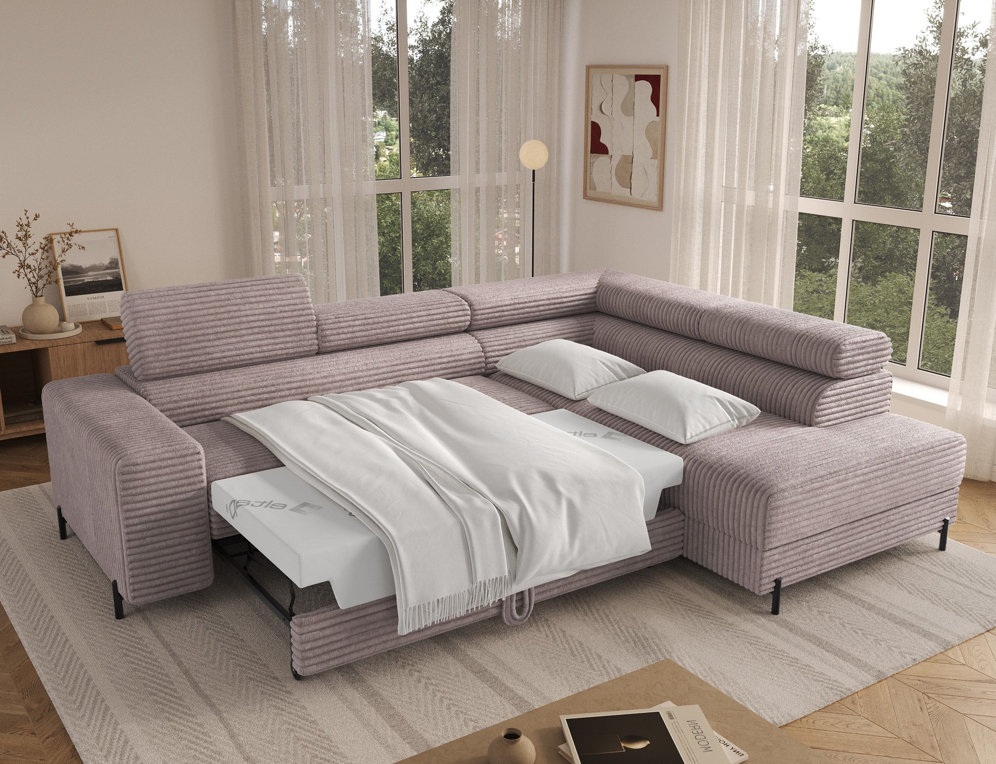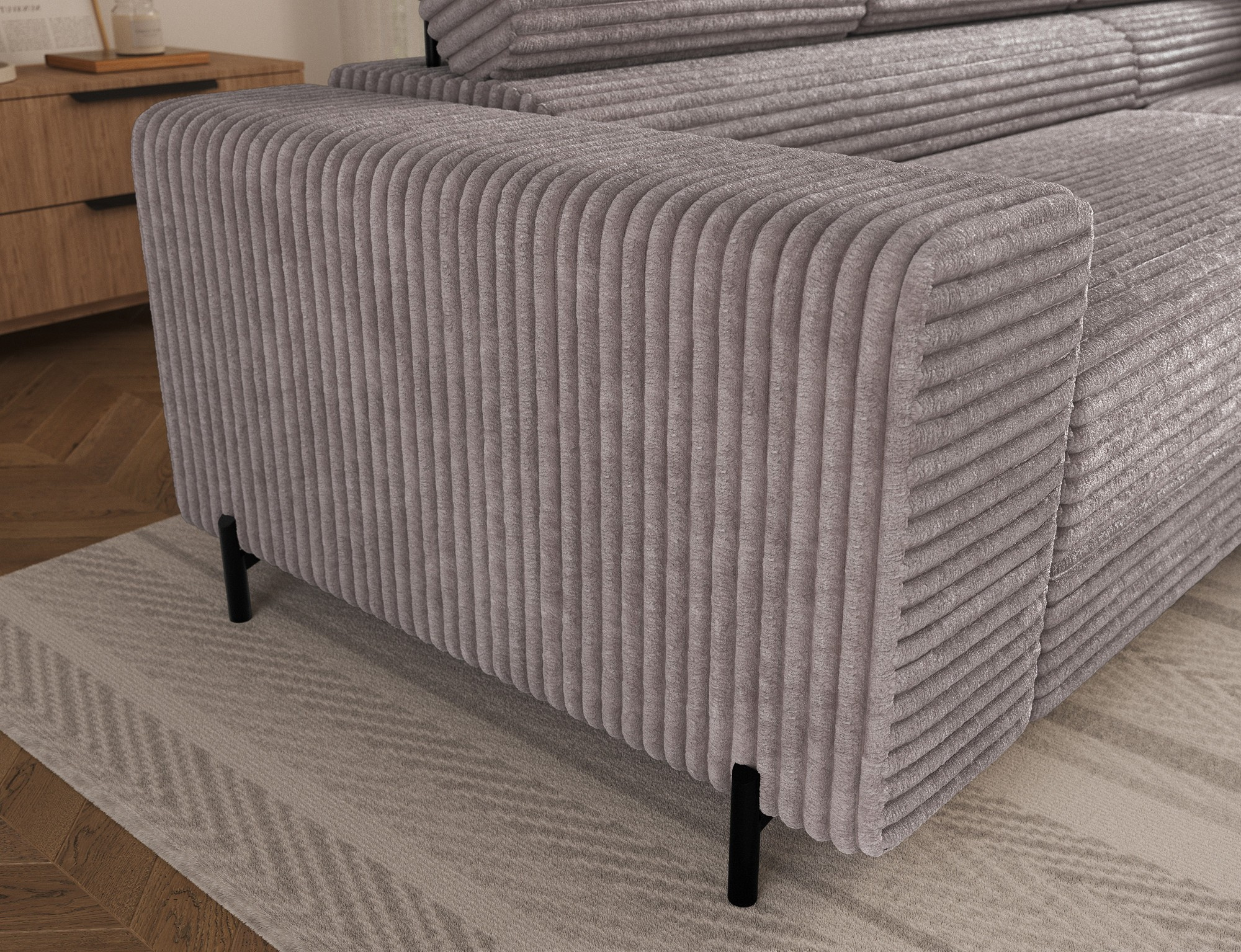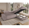The Colesio corner sofa is a modern and elegant lounge piece with a distinctive, geometric form that perfectly combines design and functionality, making it an ideal addition to a spacious living room. The model, measuring 274 x 200 x 93 cm and weighing 144.5 kg, stands out with its solid construction and carefully refined details that ensure high comfort for everyday use. The seat is equipped with a B-type wave spring and a combination of T3030 foam (6 cm) and HR3030 foam (4 cm), guaranteeing optimal elasticity, resistance to deformation, and comfort even during intensive use. The backrest, filled with profiled T2130 polyurethane foam approximately 8 cm thick, provides stable and ergonomic back support. The Colesio corner sofa features a practical sleeping function with a surface of 124 x 203 cm, and the Delfin mechanism allows for quick and convenient unfolding. An additional advantage is the spacious bedding container measuring 180 × 92 × 17 cm, which facilitates textile storage, making the Colesio corner sofa an excellent choice for those seeking a modern corner sofa with a sleeping function, bedding storage, and durable, comfortable filling for everyday relaxation.